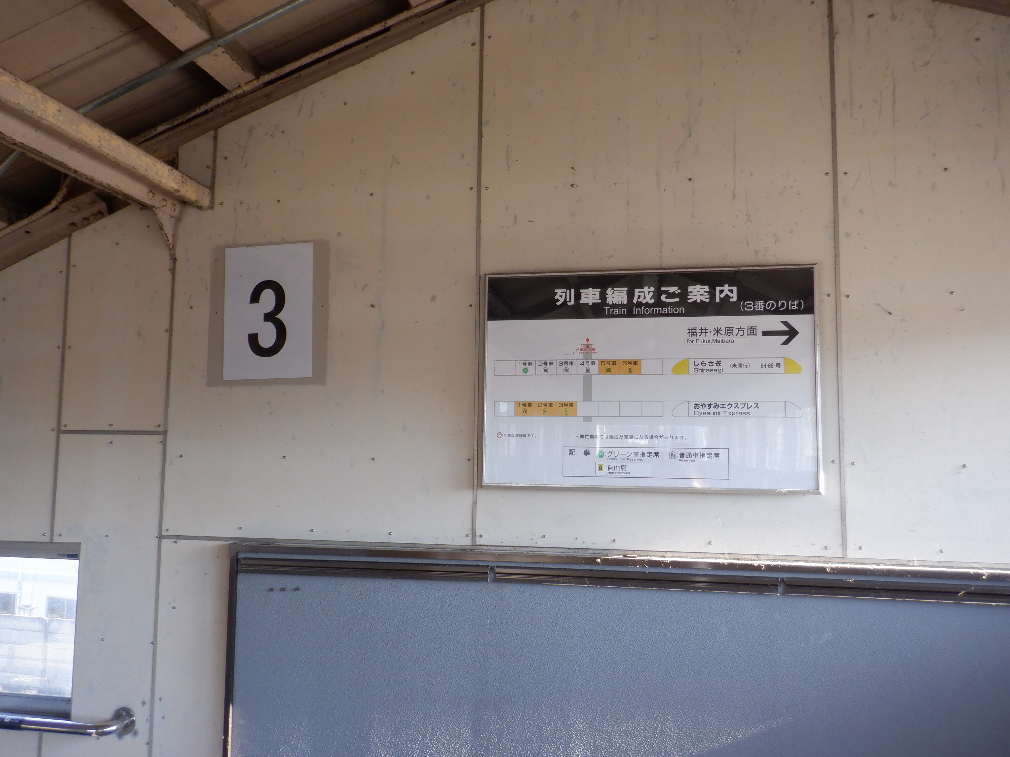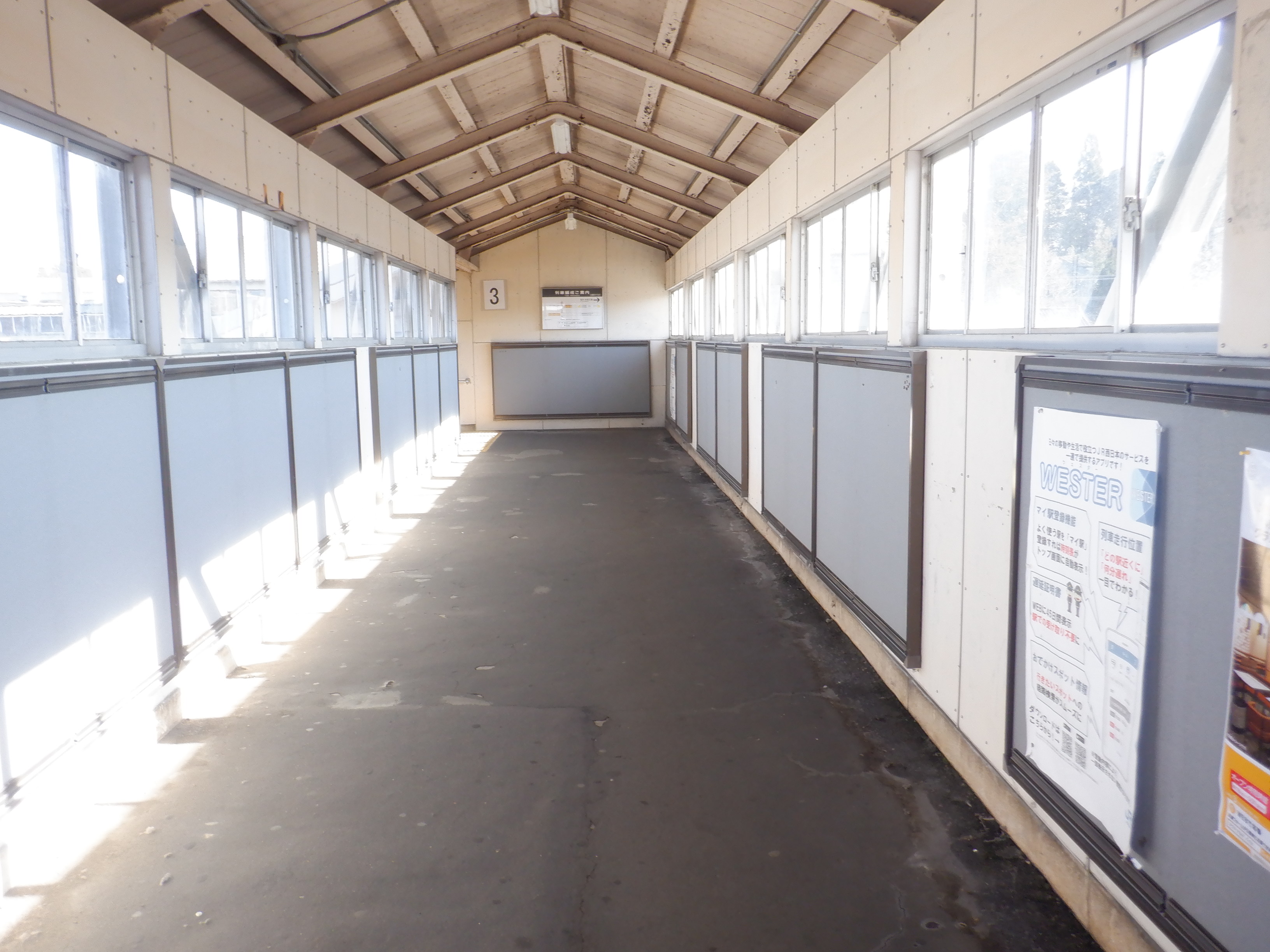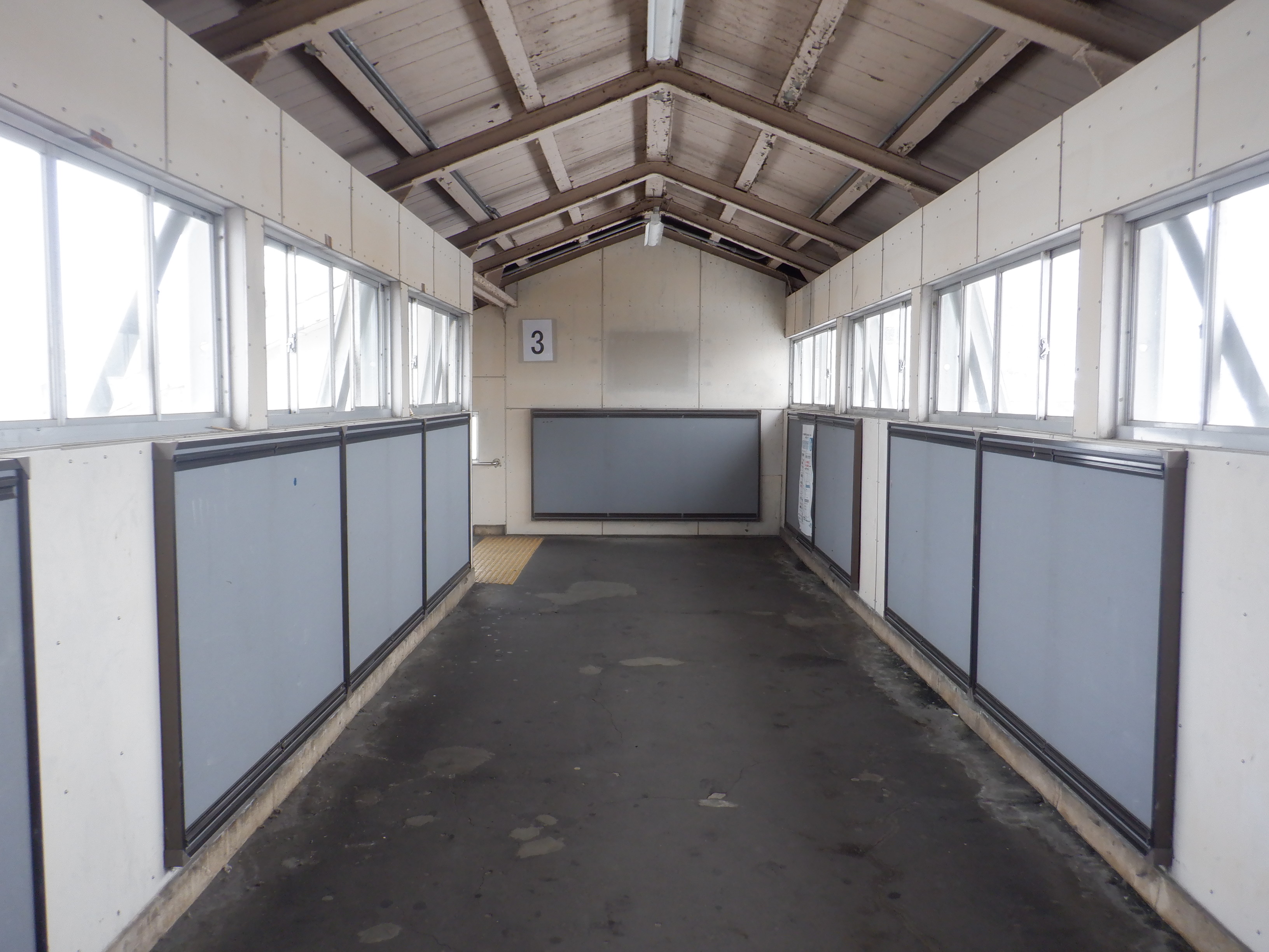 跨線橋内の様子。特急列車の乗車位置案内が撤去されました。