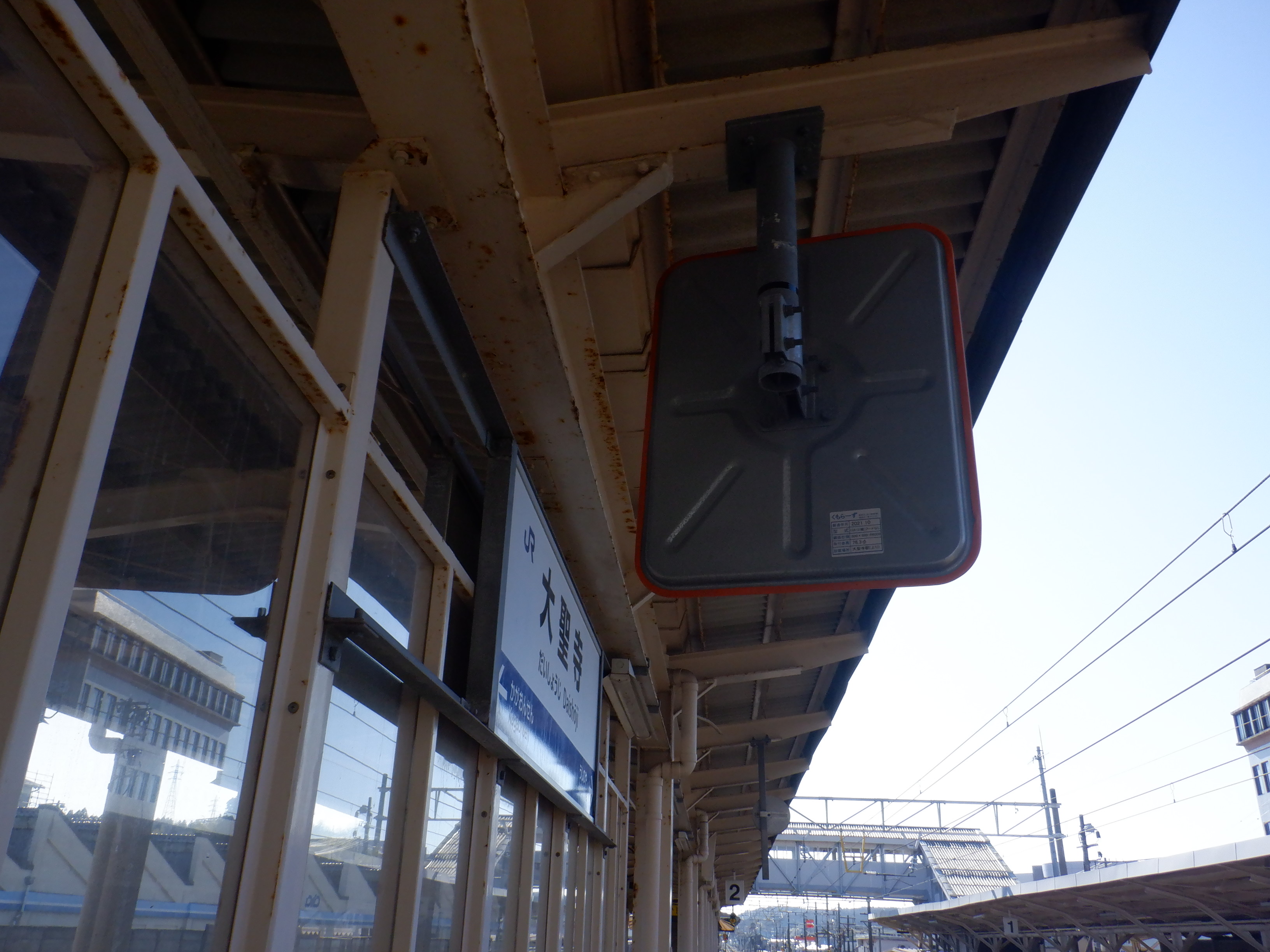 2・3番のりば上屋付近にある駅名標とその横にある2番のりば加賀温泉駅側のワンマンミラー。