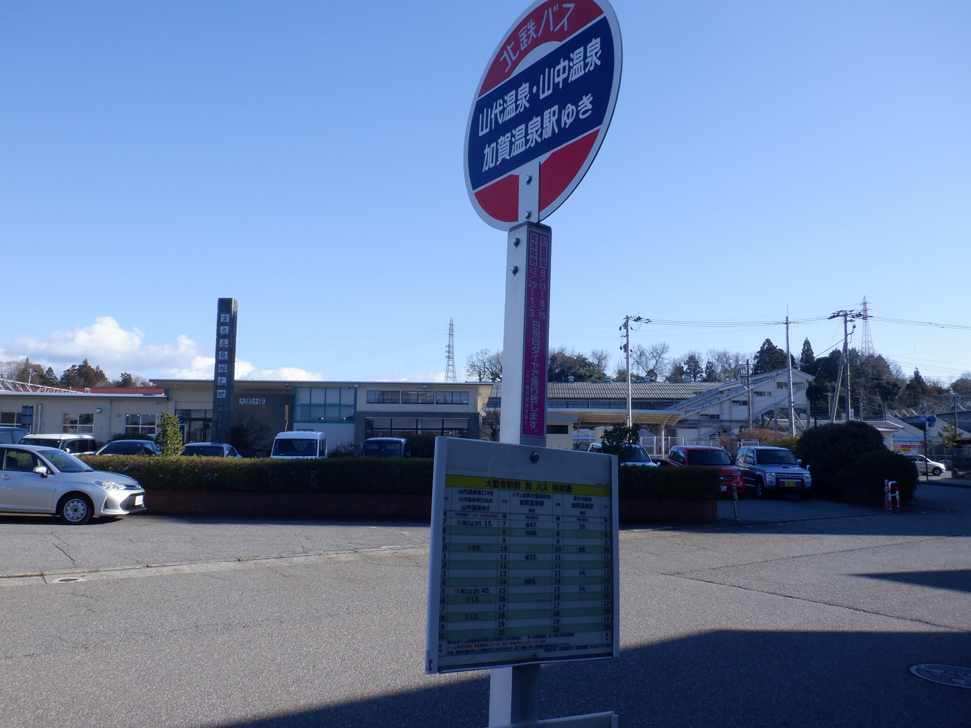 2・3番のりば加賀温泉駅側を向いた柱の駅名標。