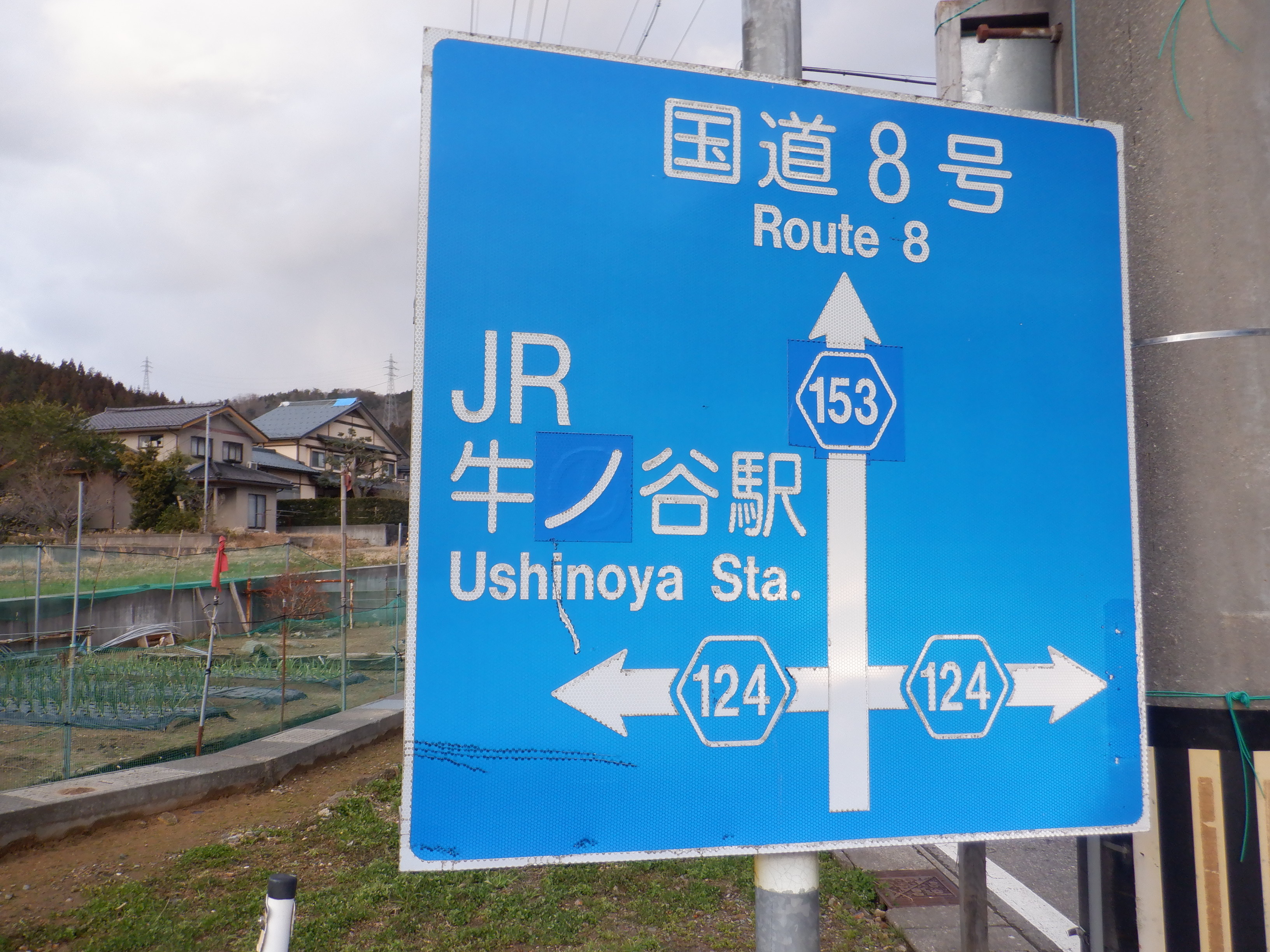 集落入口近く、駅へ進む道にある青看板。「の」が「ノ」に訂正された形跡があります。