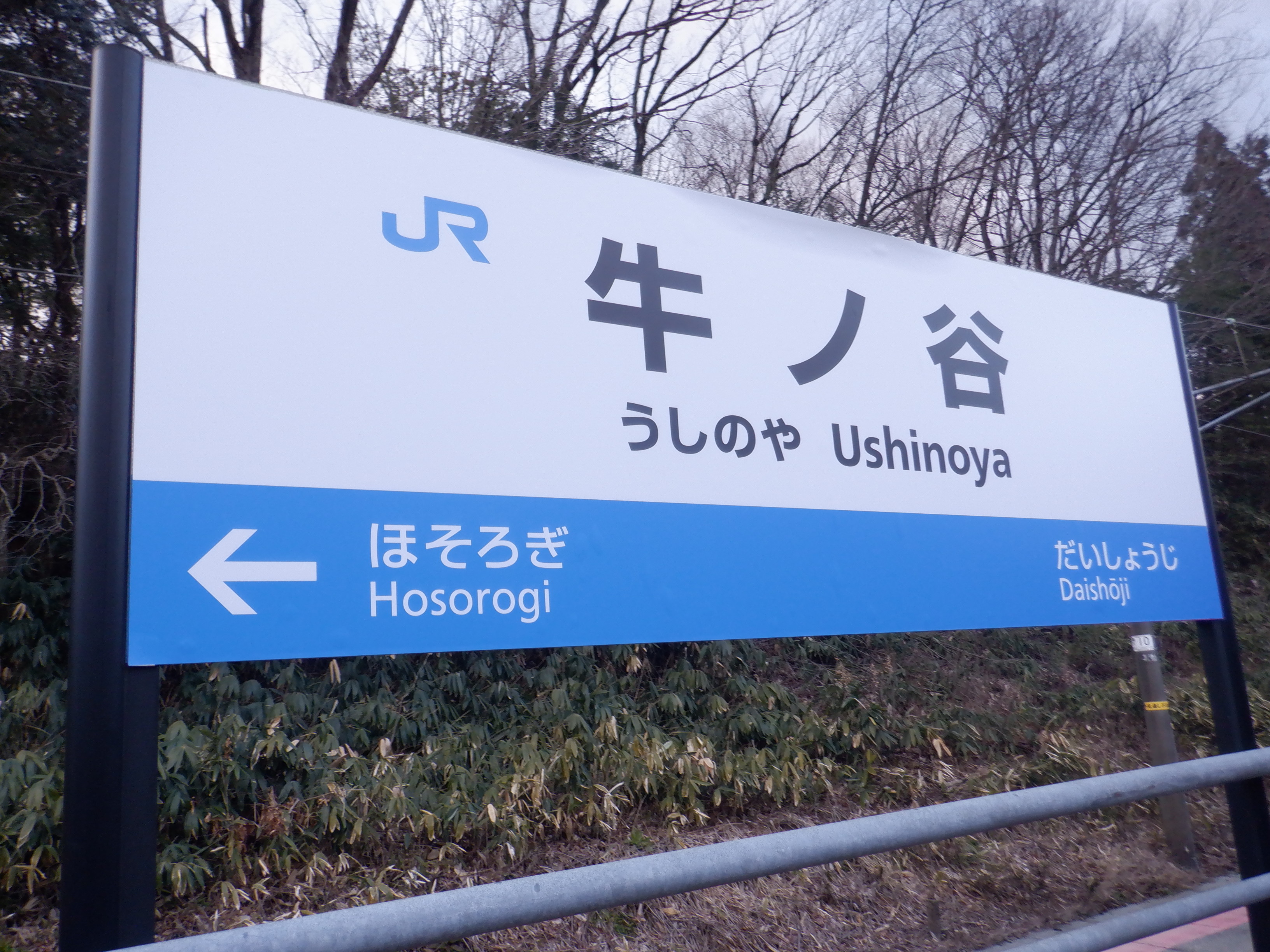 細呂木駅から歩いてきたため、駅入口の青看板と神社。