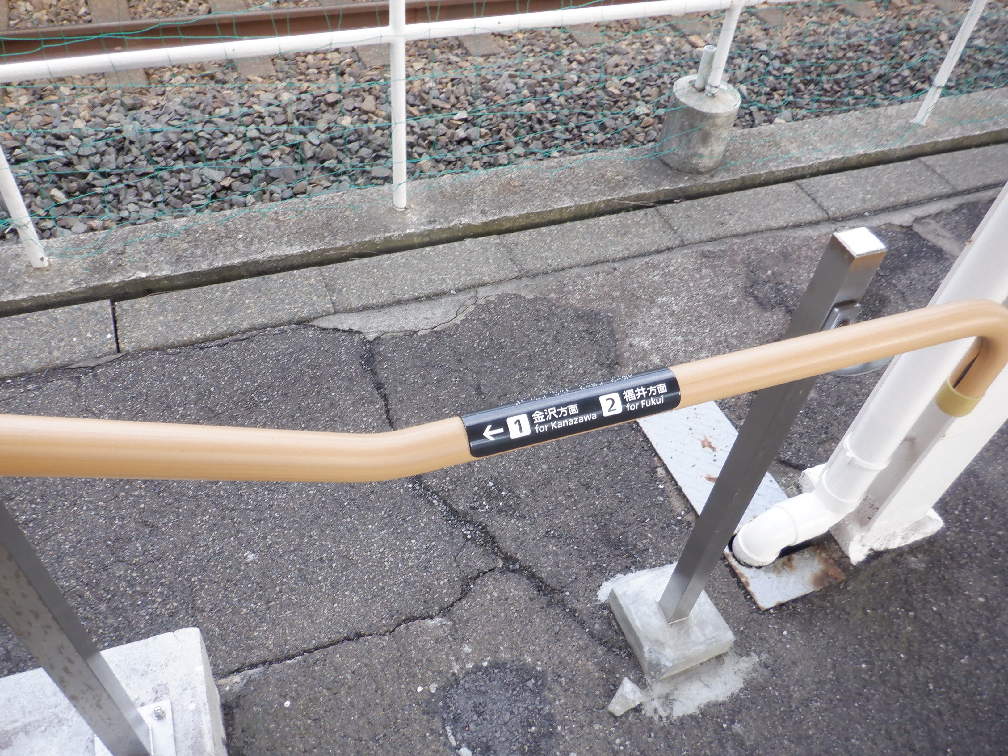 2番のりばの駅名標。下にハピラインふくいの駅名標が見えていて、その上からJRの駅名標がシールで貼られています。上部から水が入って膨らんだ様子は解消されています。