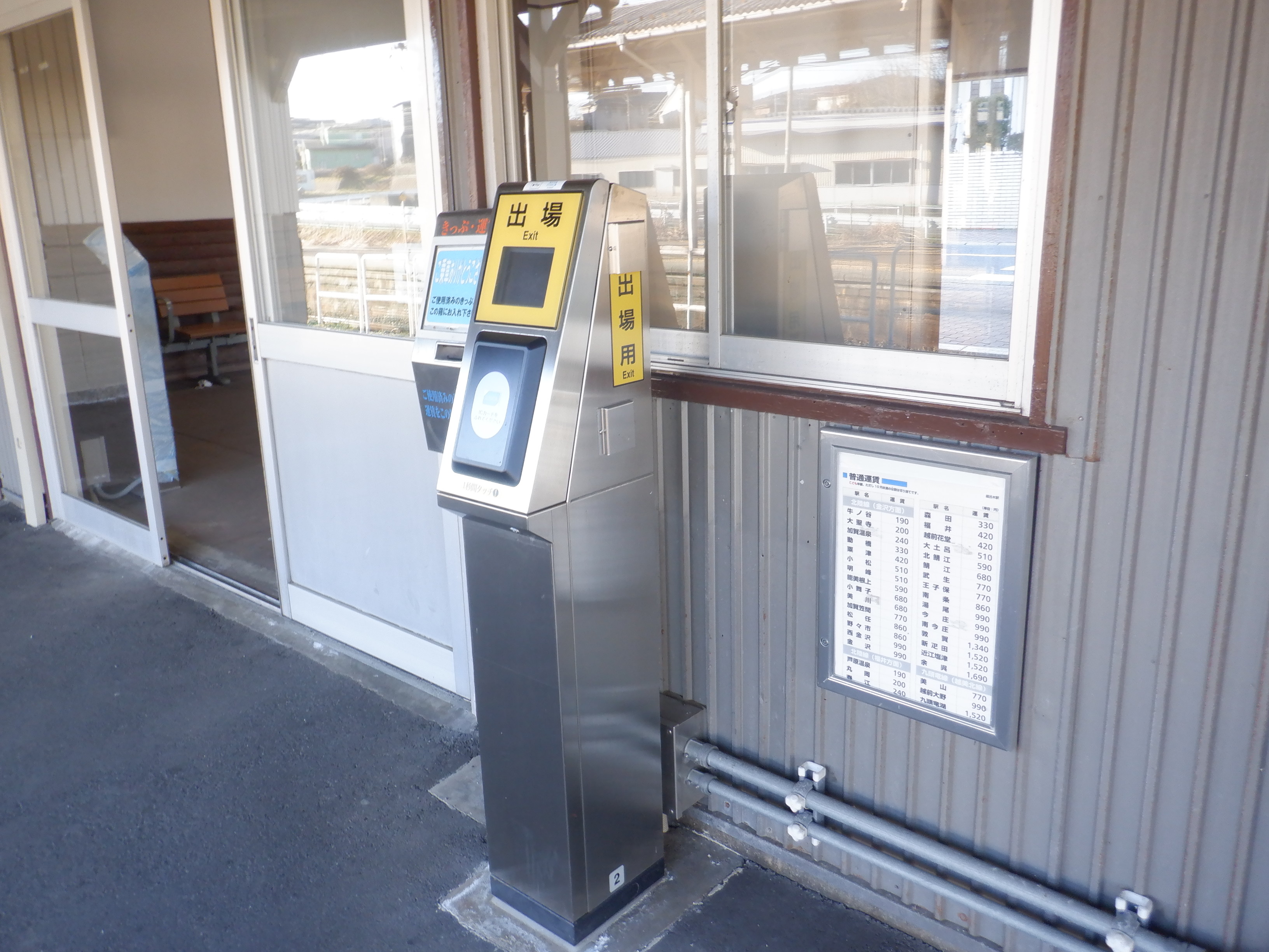 駅舎前の出場用ICOCA改札機と運賃表。