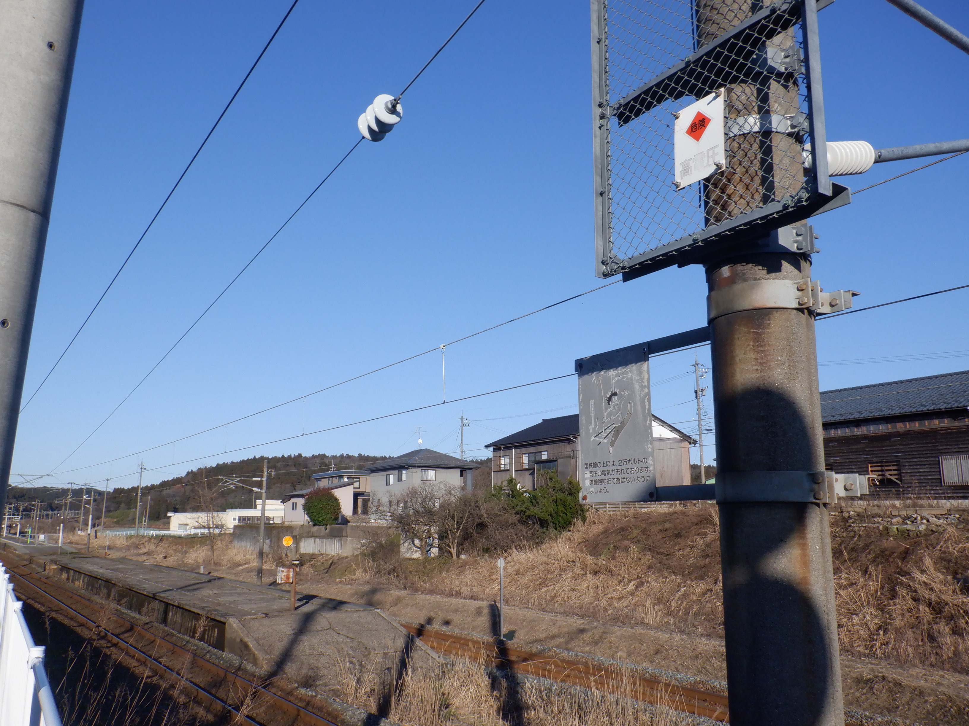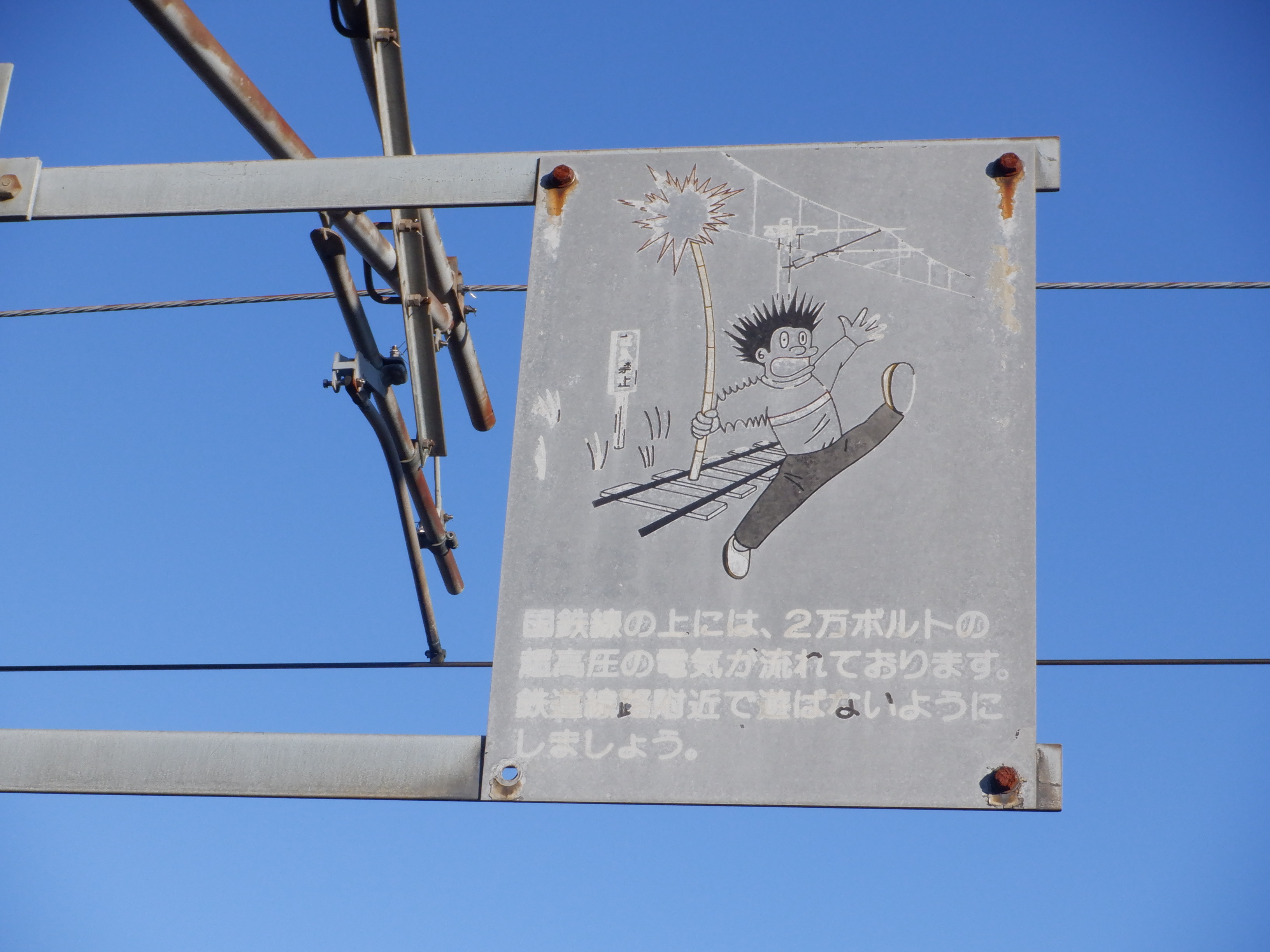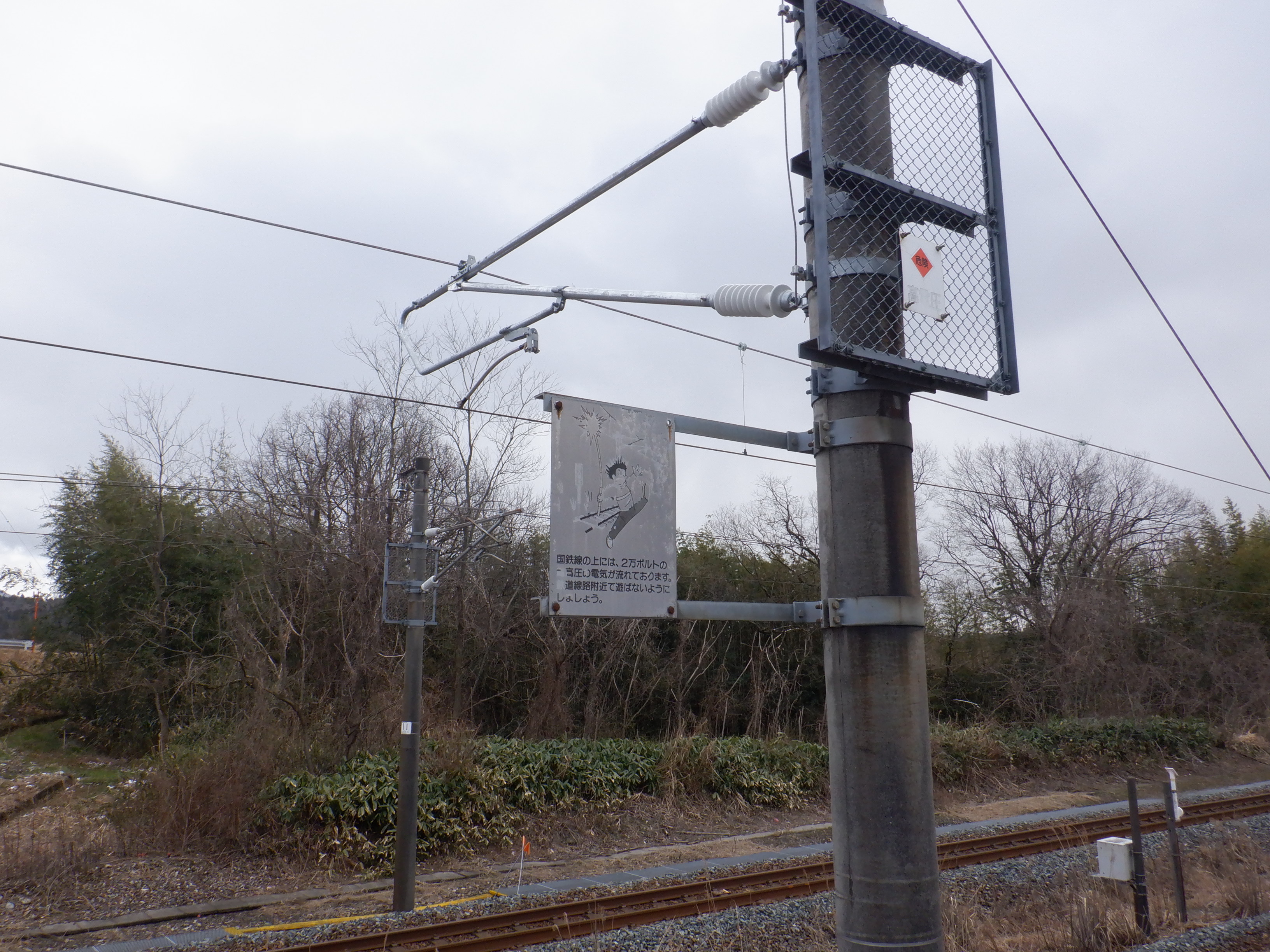 架線の注意書き。国鉄からJRを経てハピラインふくいまで、もうすぐです。