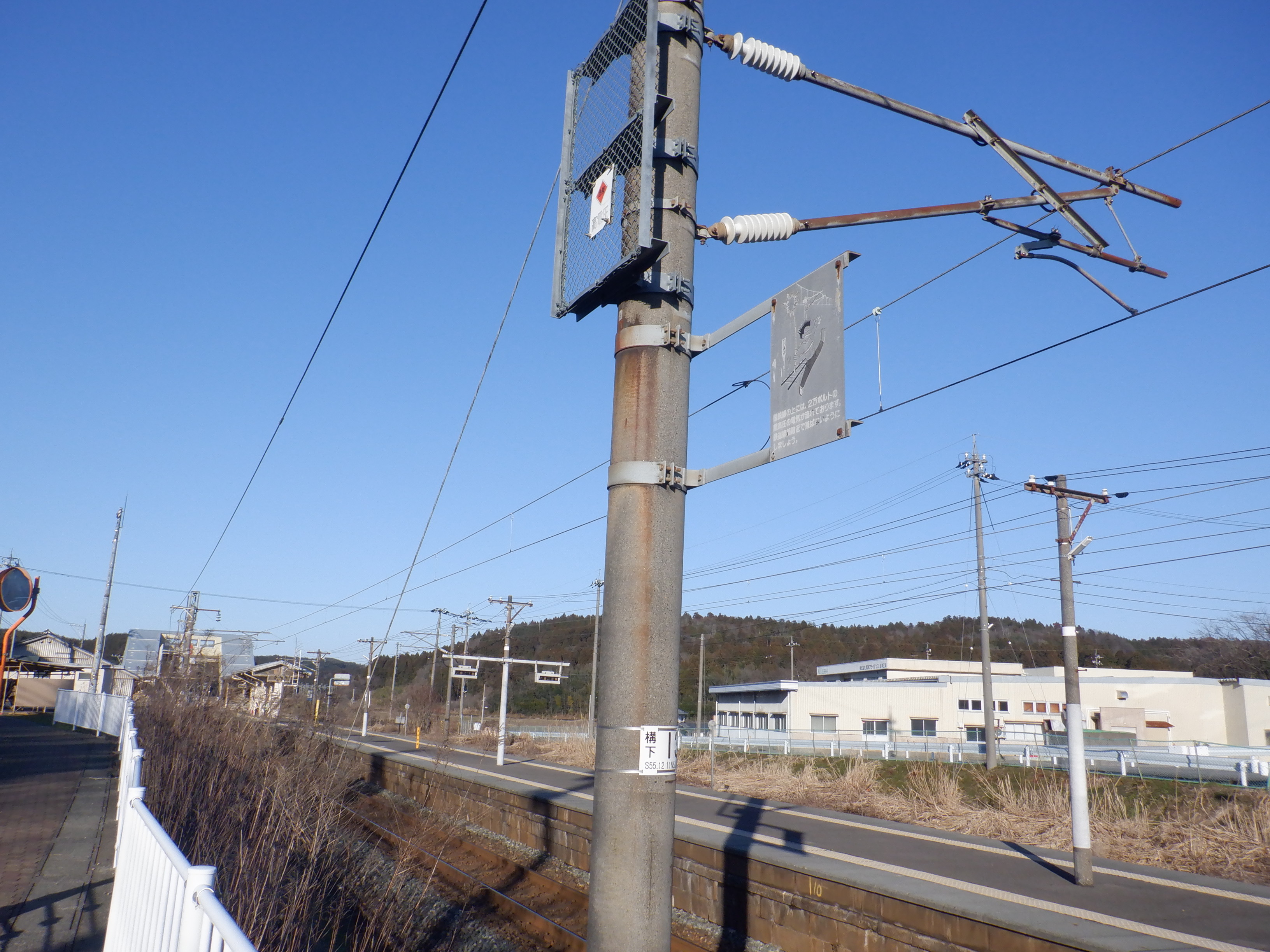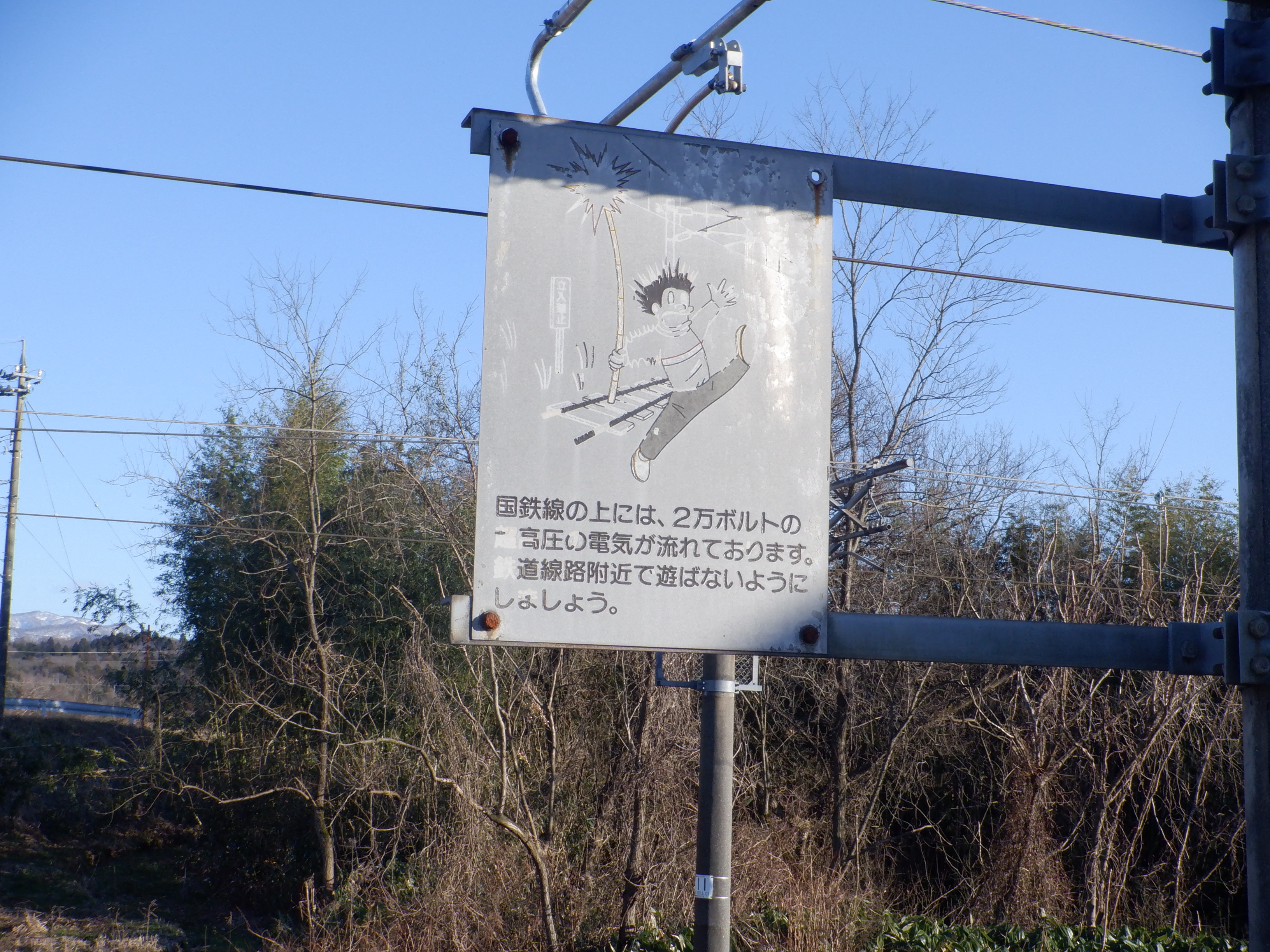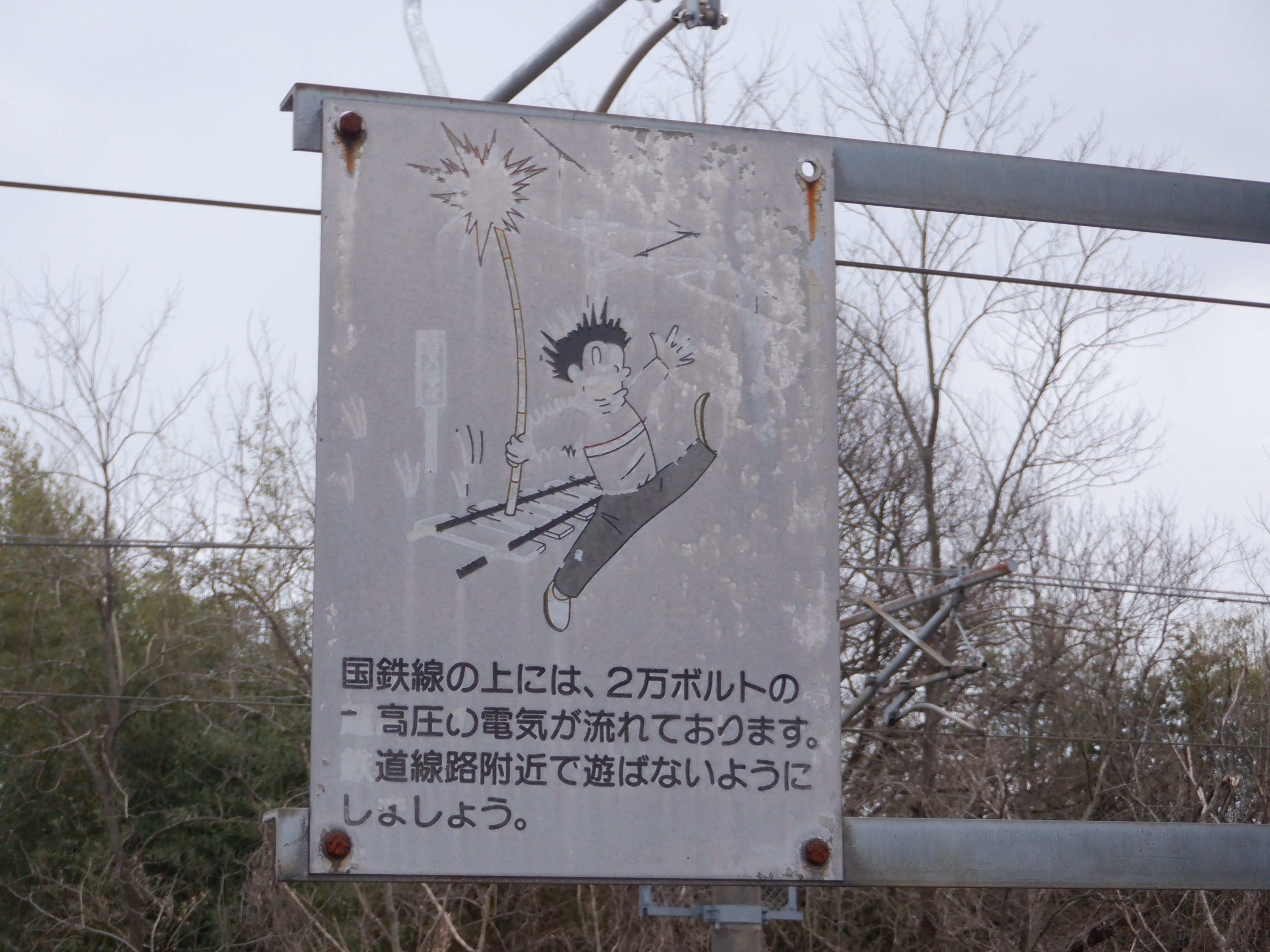 架線の注意書き。国鉄からJRを経てハピラインふくいまで、もうすぐです。