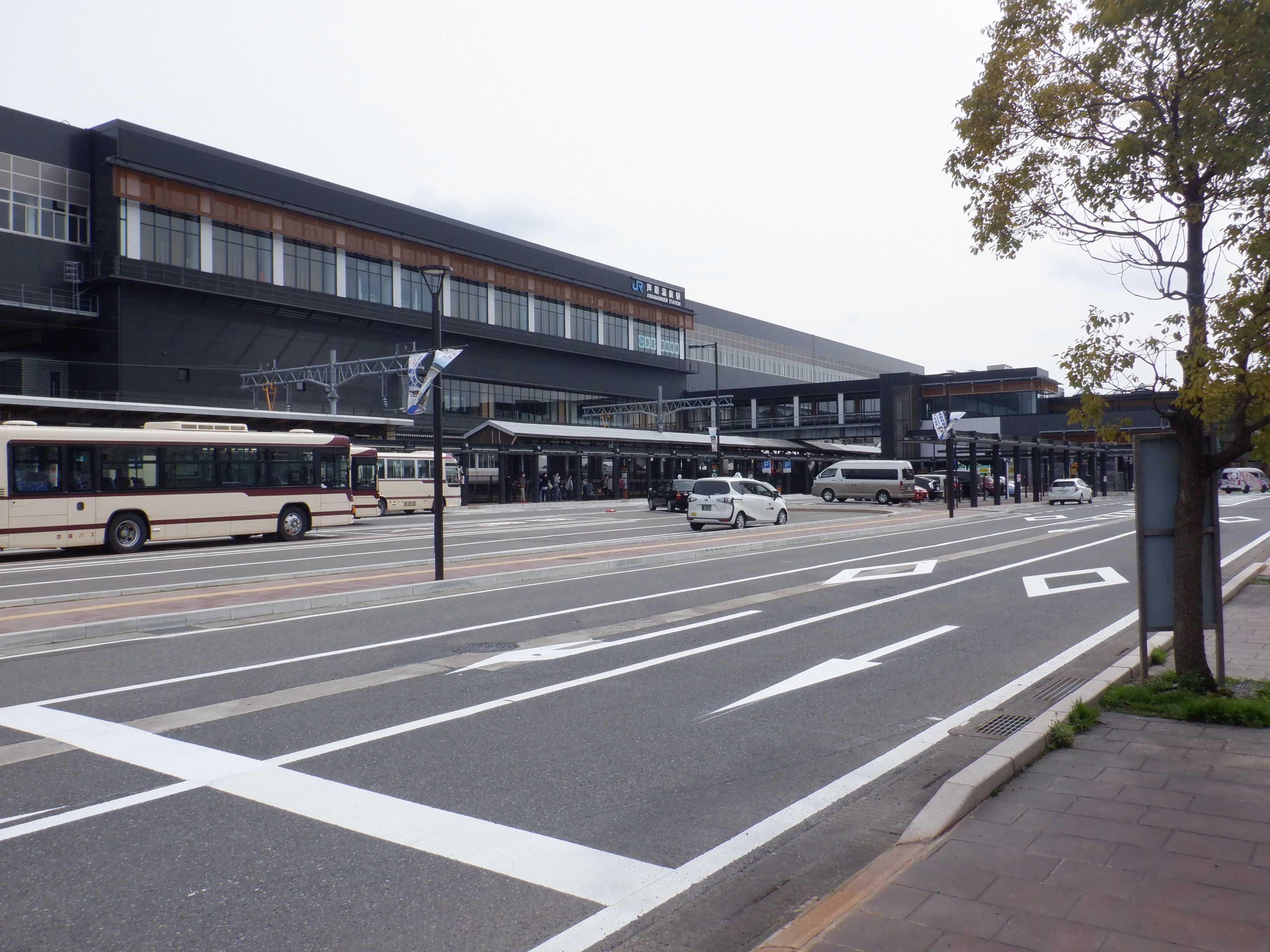 西口の新幹線駅舎と交通広場。