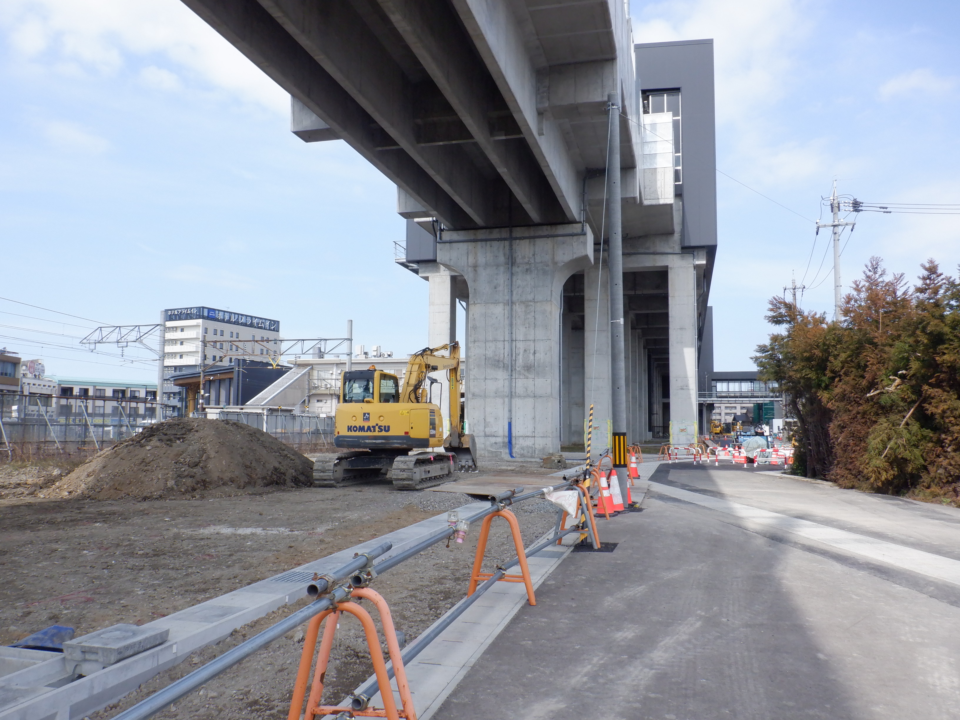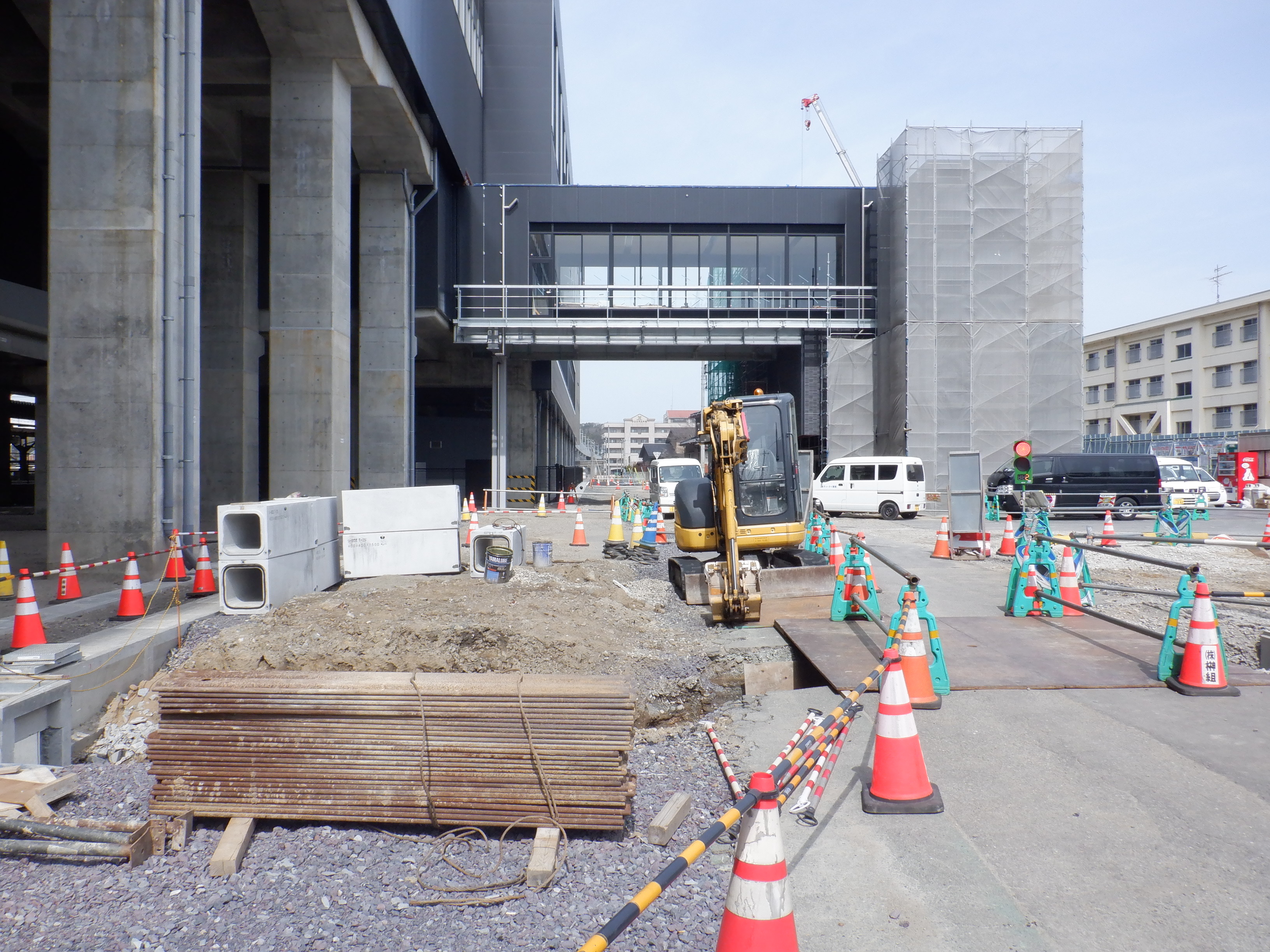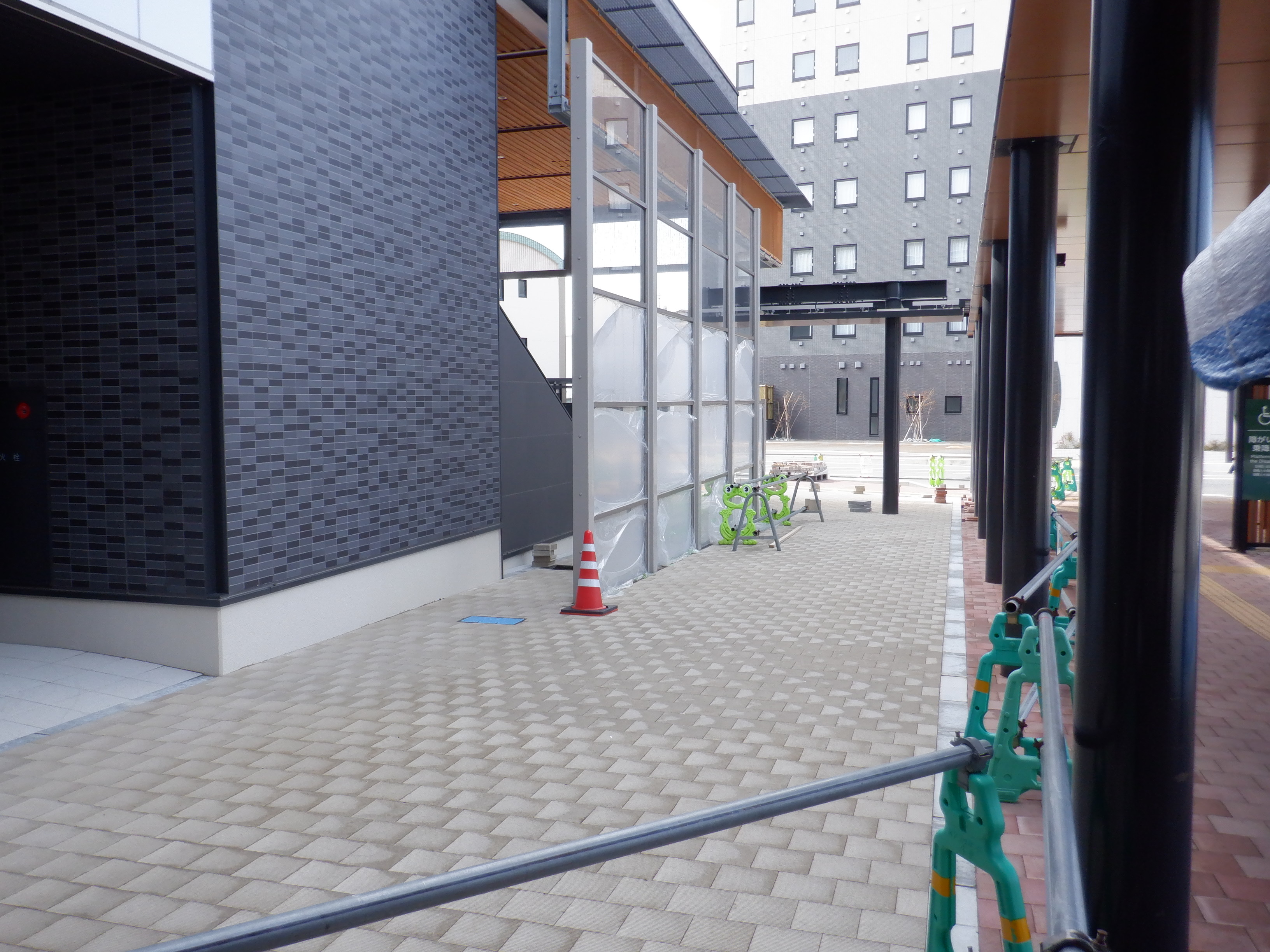 アフレアの開業も近づいてきて、外観はほぼできているように思われます。西口からの道路の工事が進み、従来からある部分と新し部分の間の工事が進んでいました。