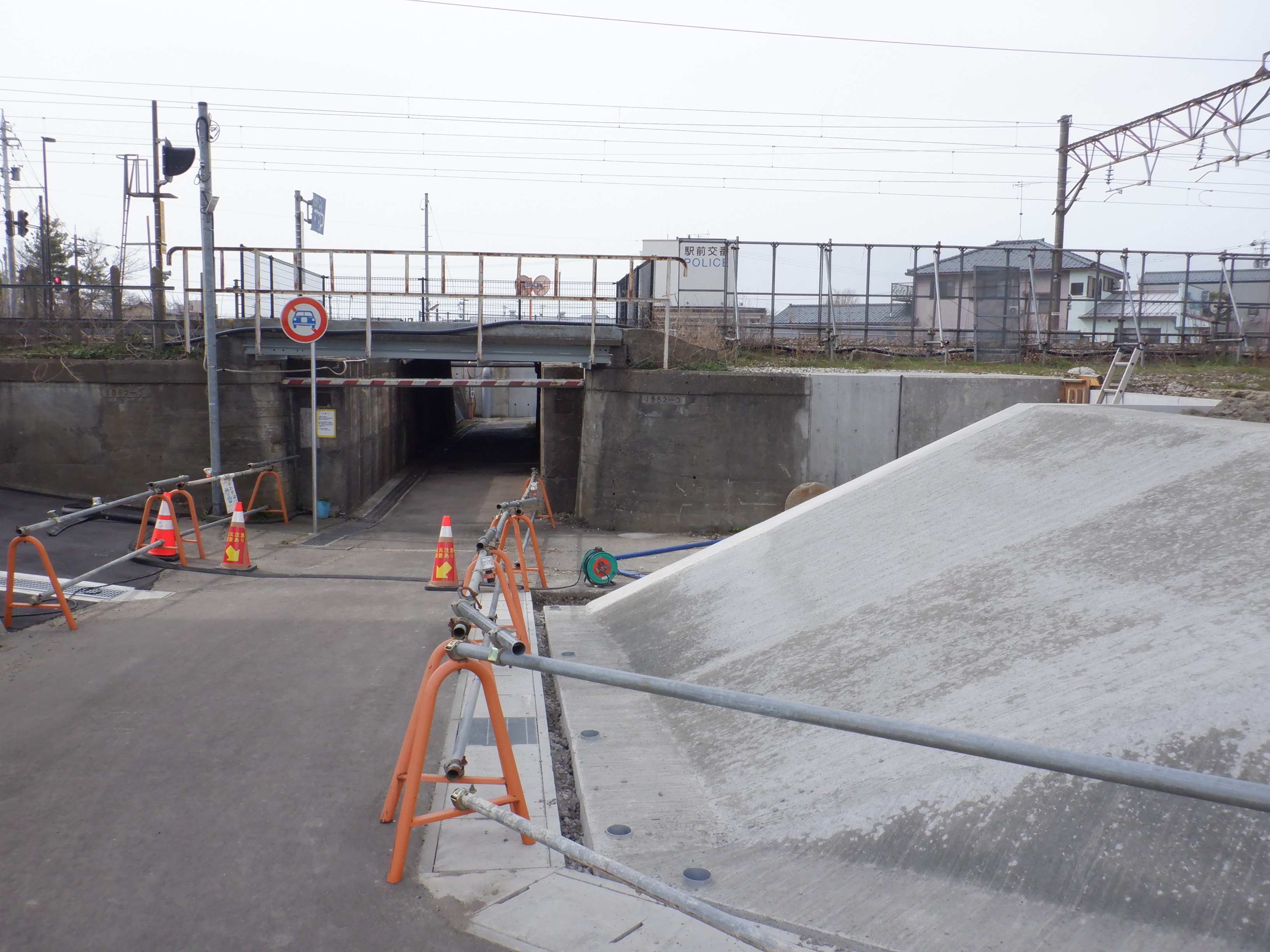 普段通り進もうとすると、西口からの道路延長部分の工事のため、橋を渡ったところで通行止めになっていました。