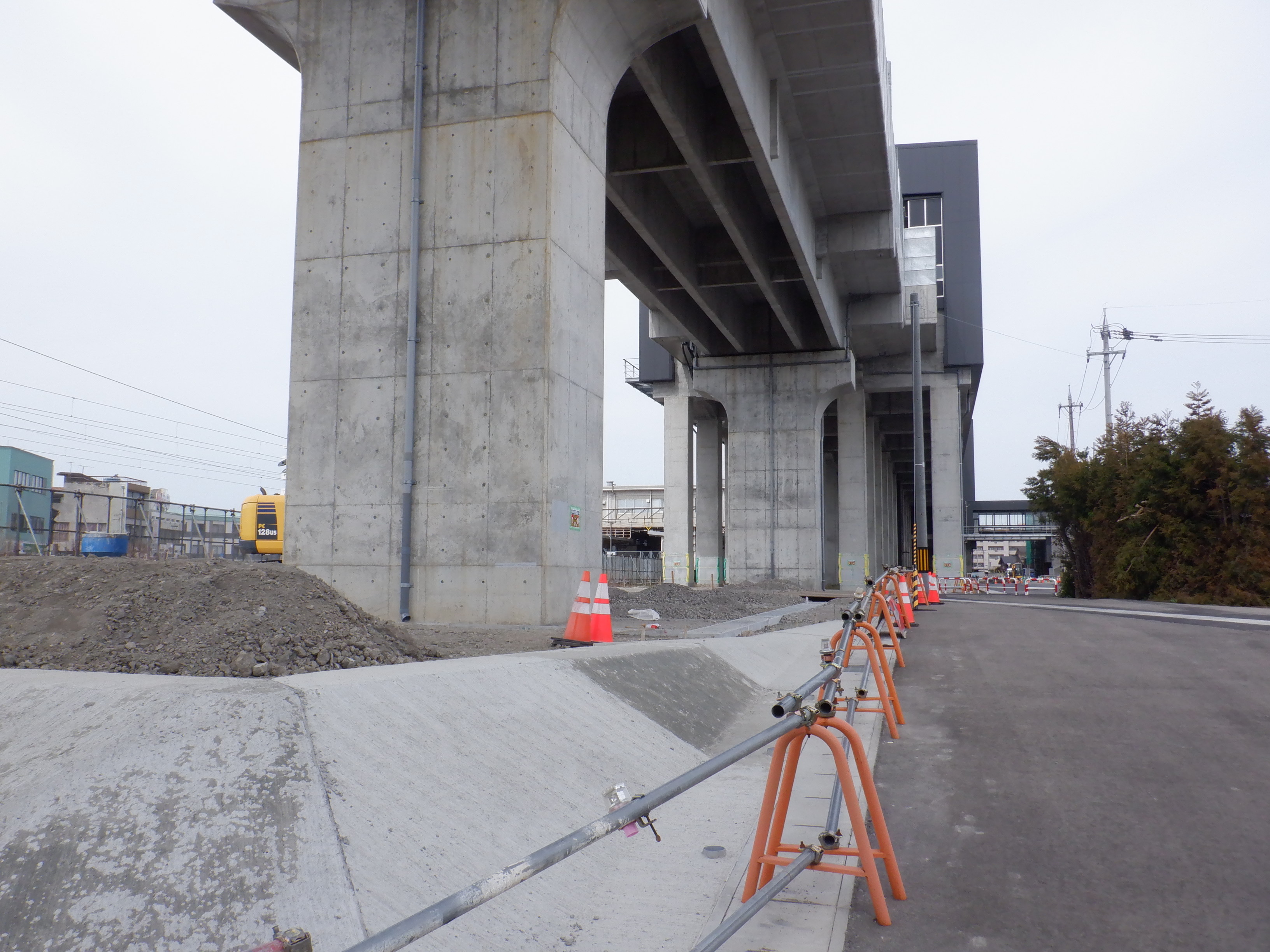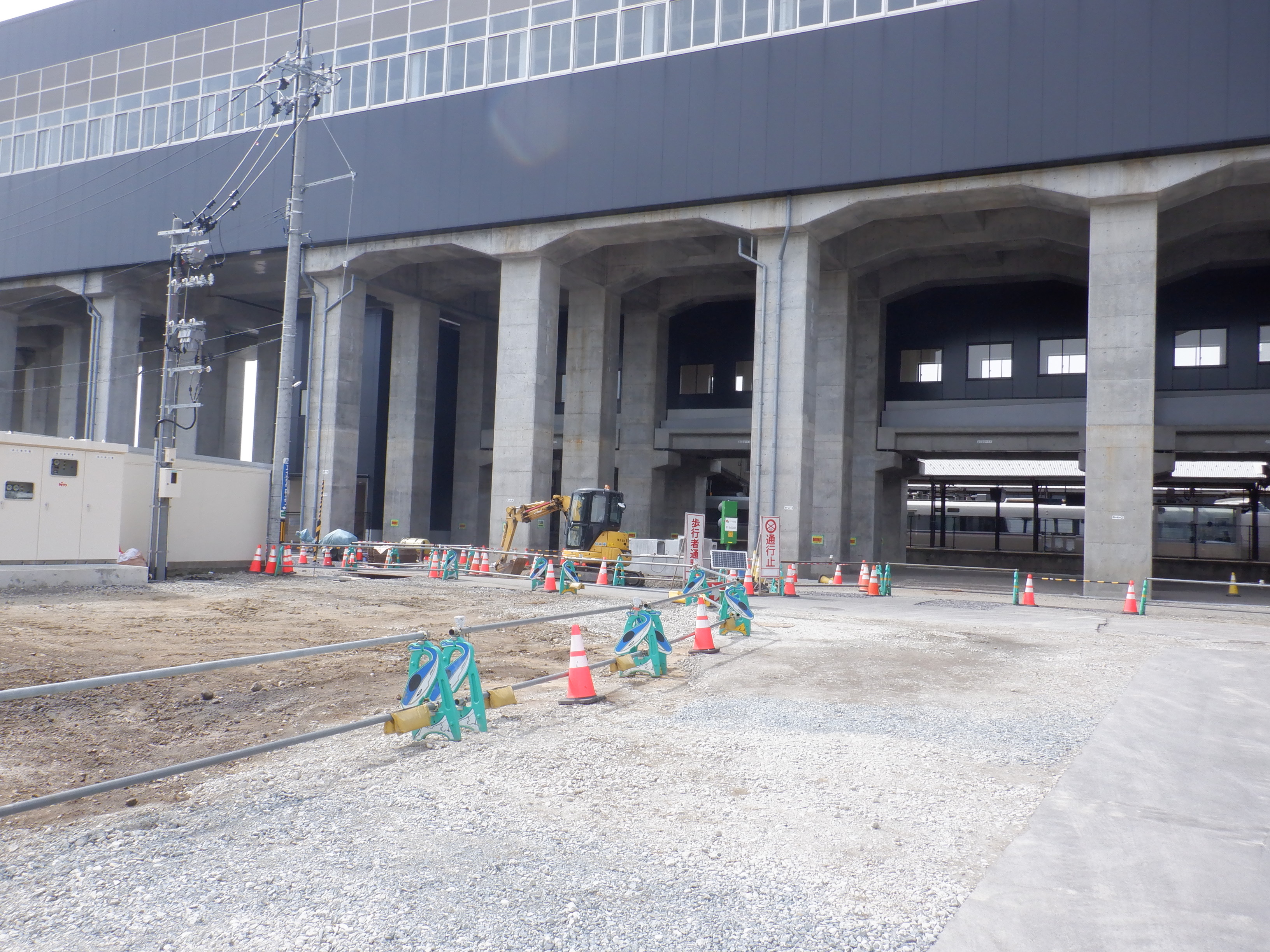 東口の交通広場と新幹線駅出入口を建設中の様子。