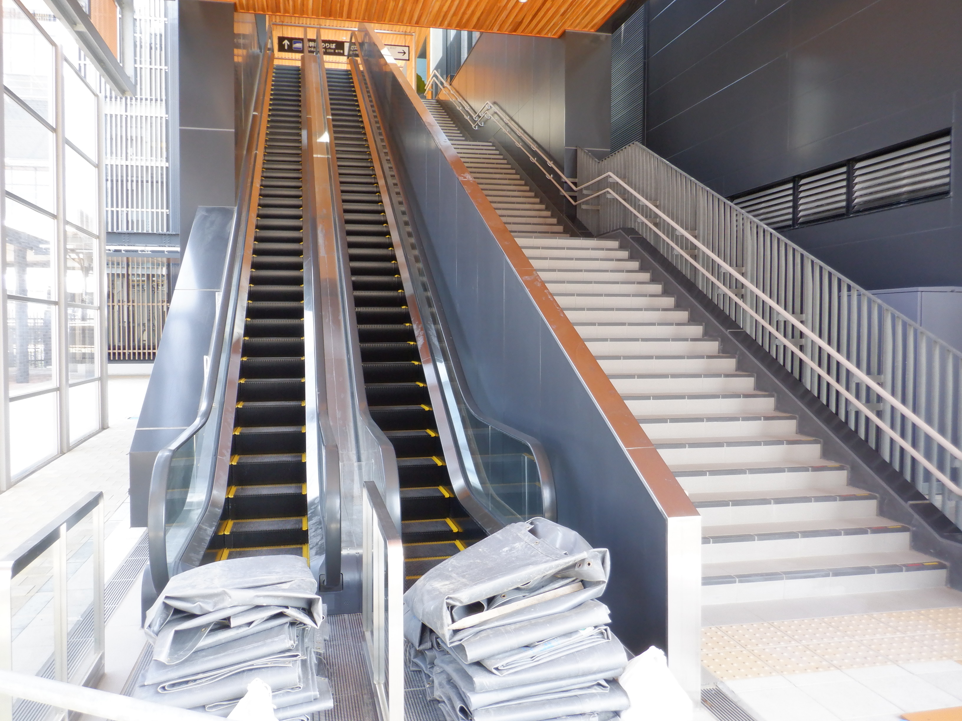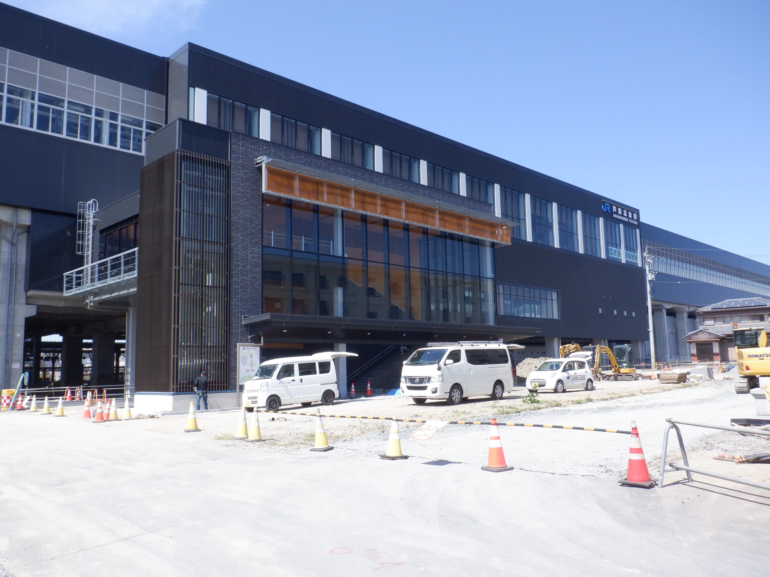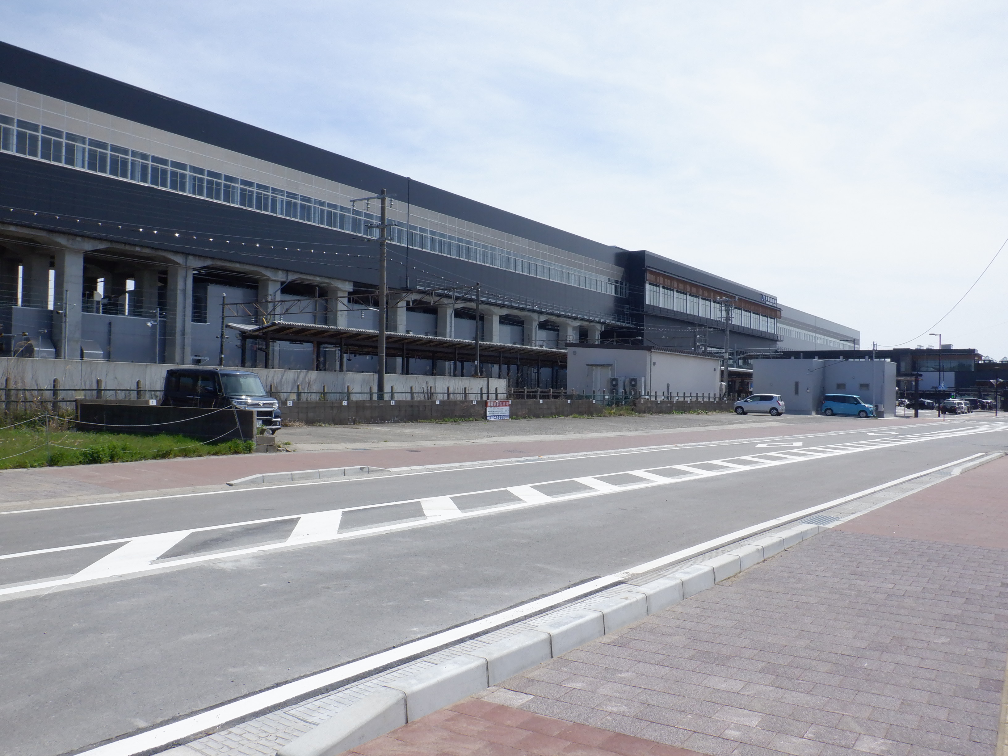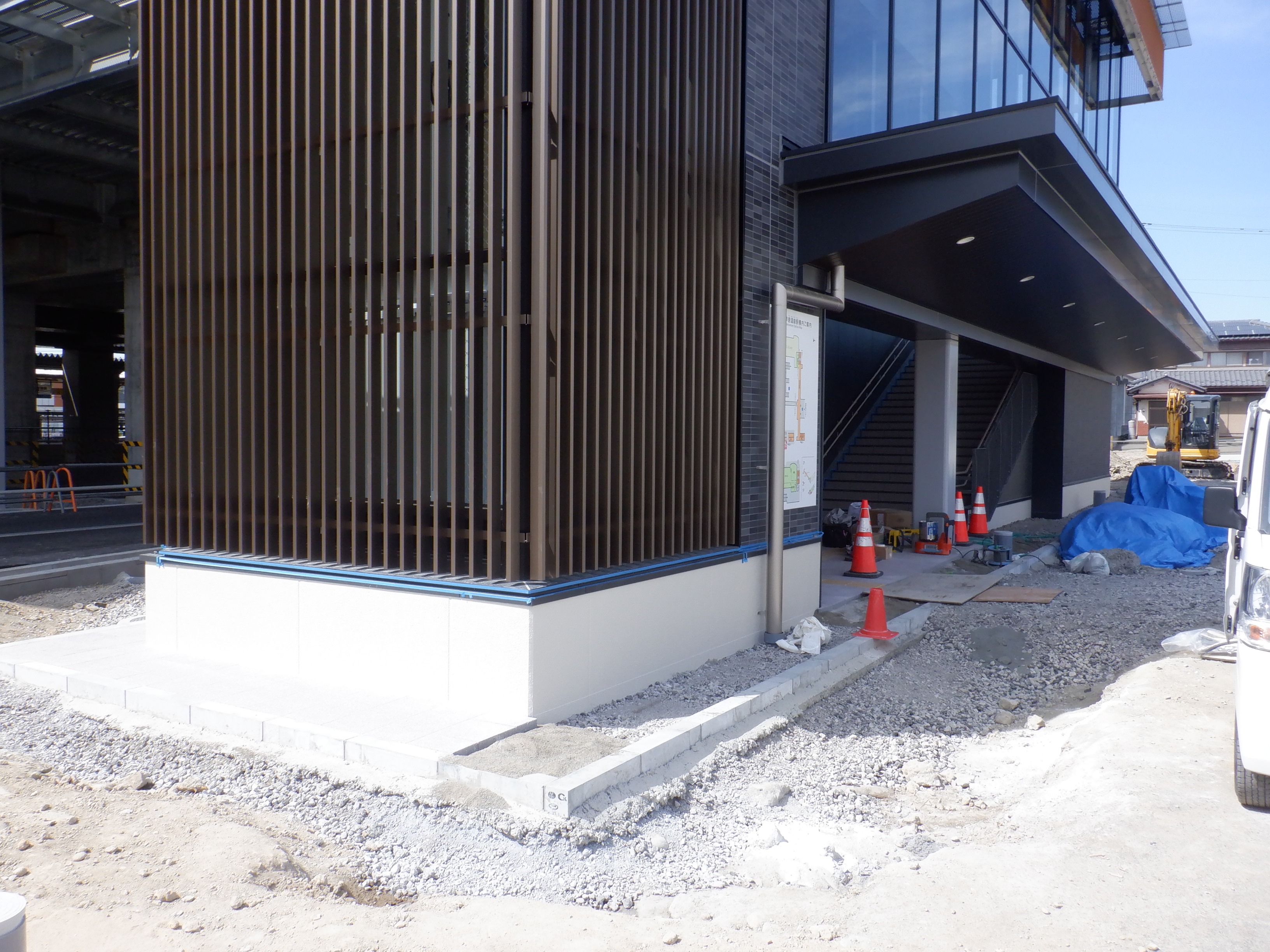 東口の交通広場と新幹線駅舎出入口建設中の様子、東口の出入口側。足場が取れてきれいに見えるようになりました。また、案内板も取り付けられています。