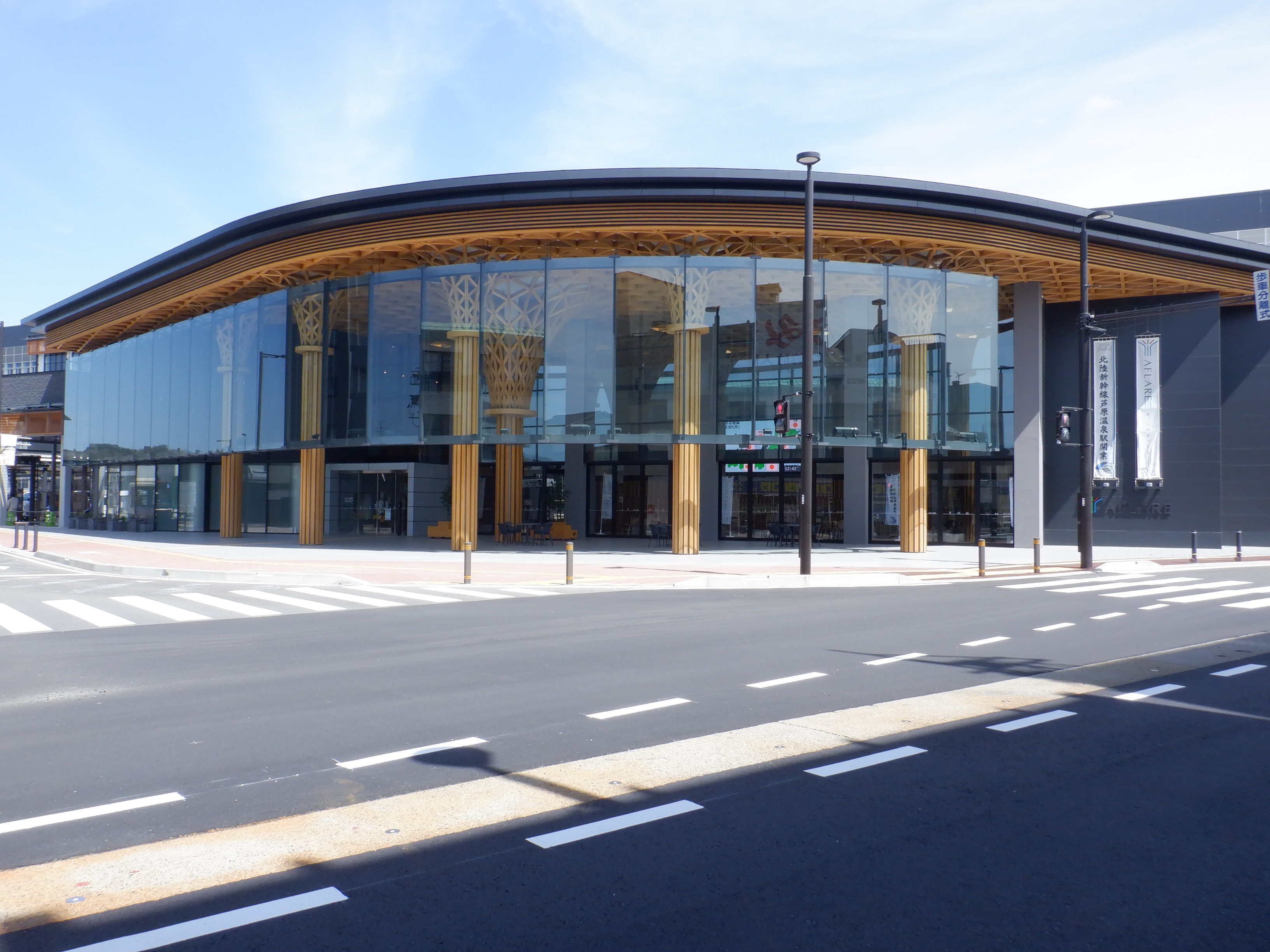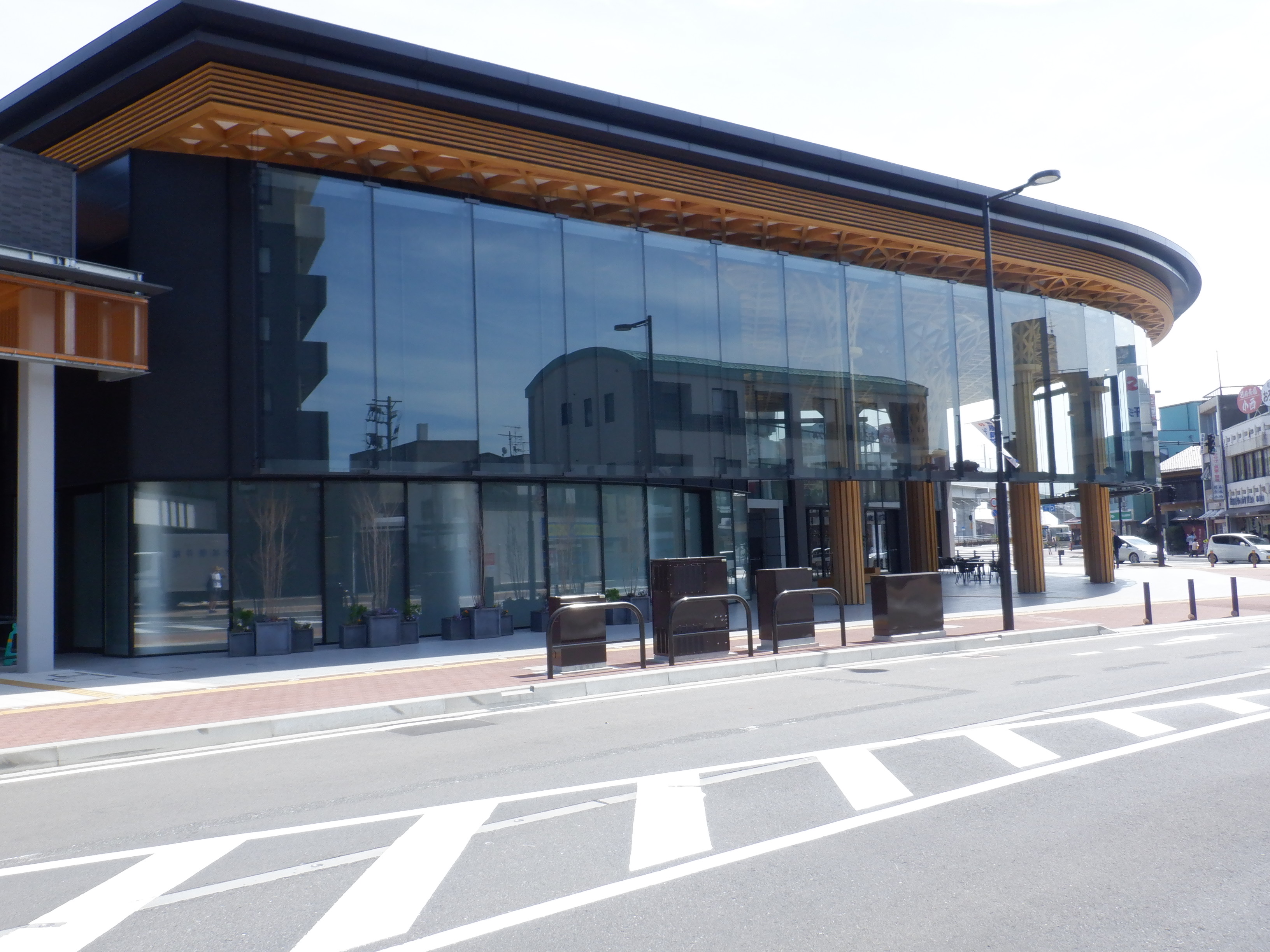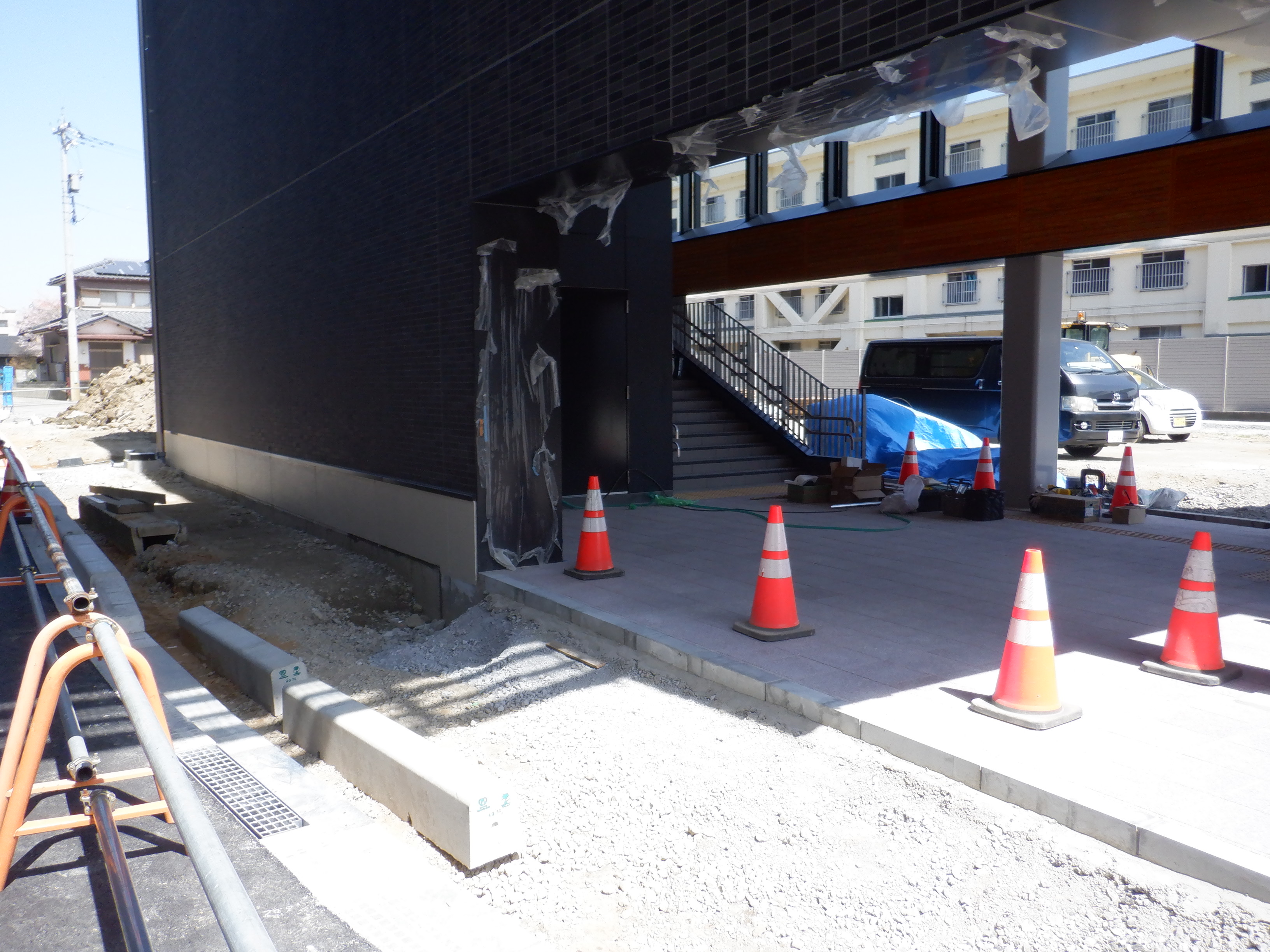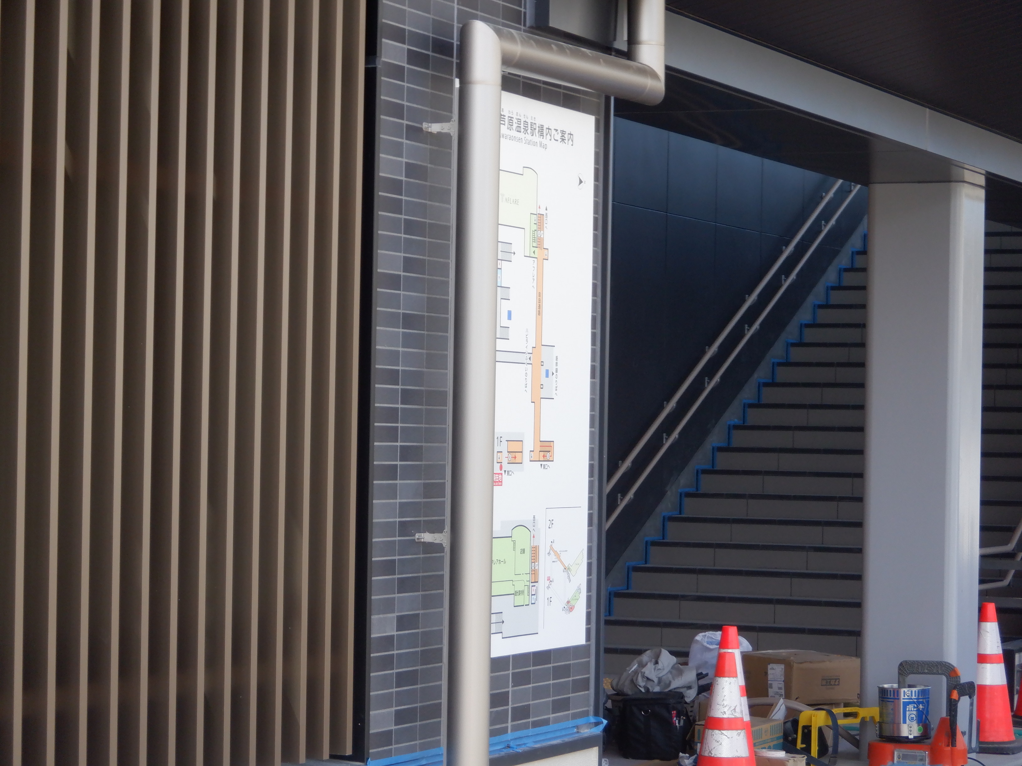 東口の交通広場と新幹線駅舎出入口建設中の様子、東口の出入口側。足場が取れてきれいに見えるようになりました。また、案内板も取り付けられています。
