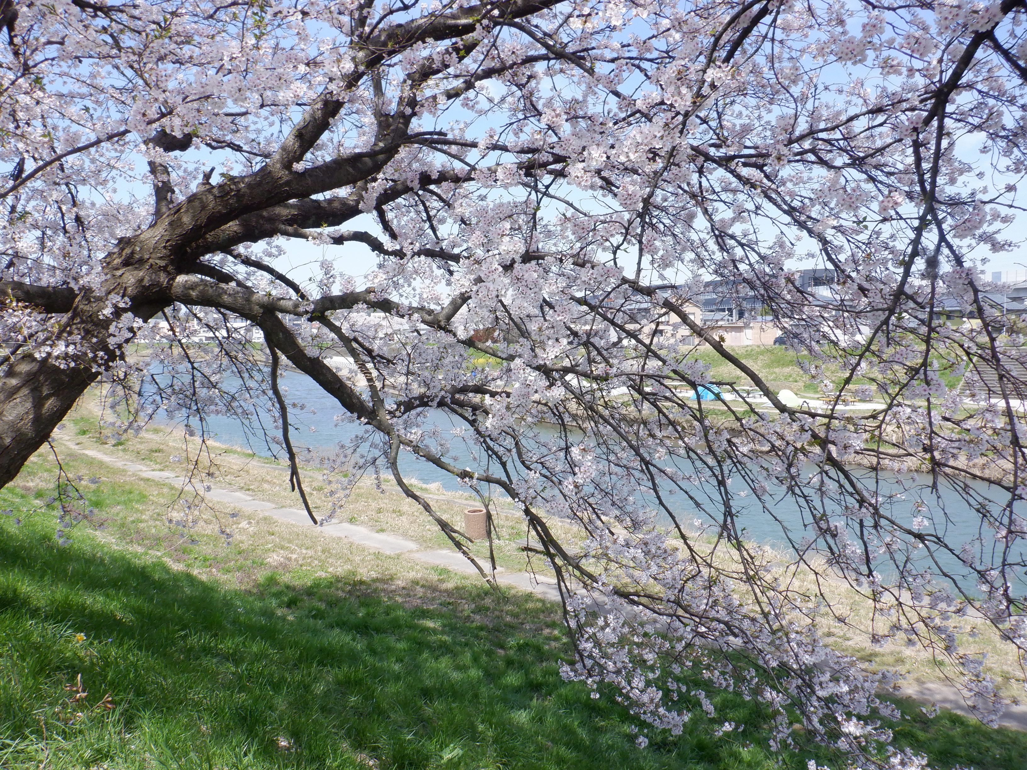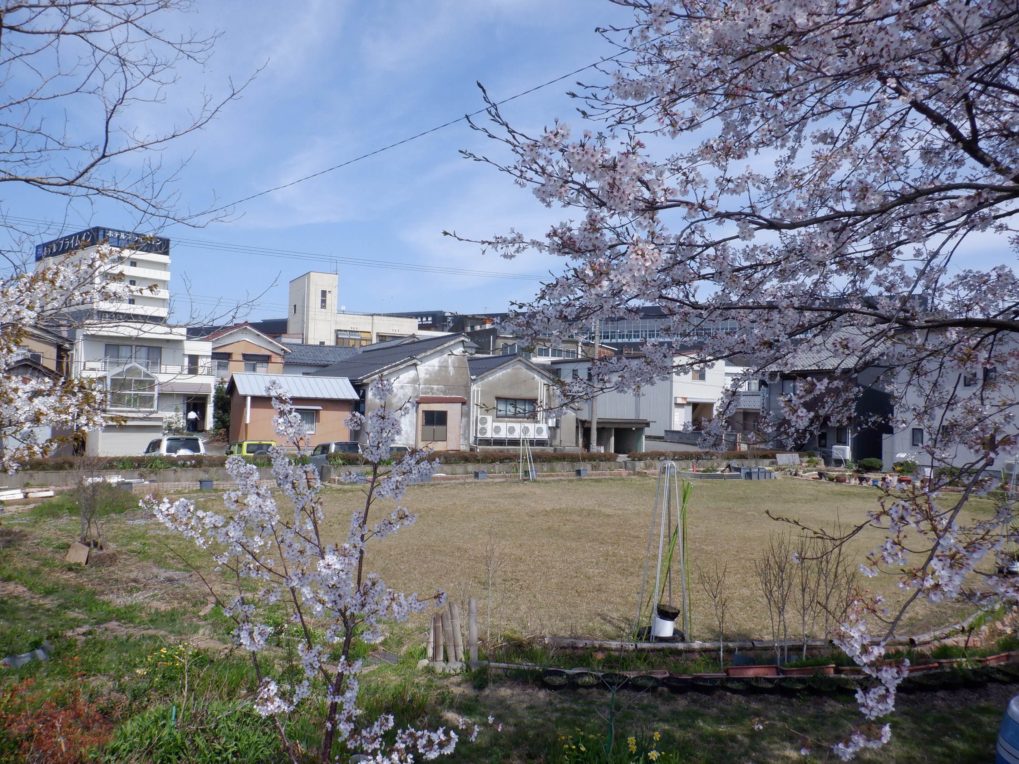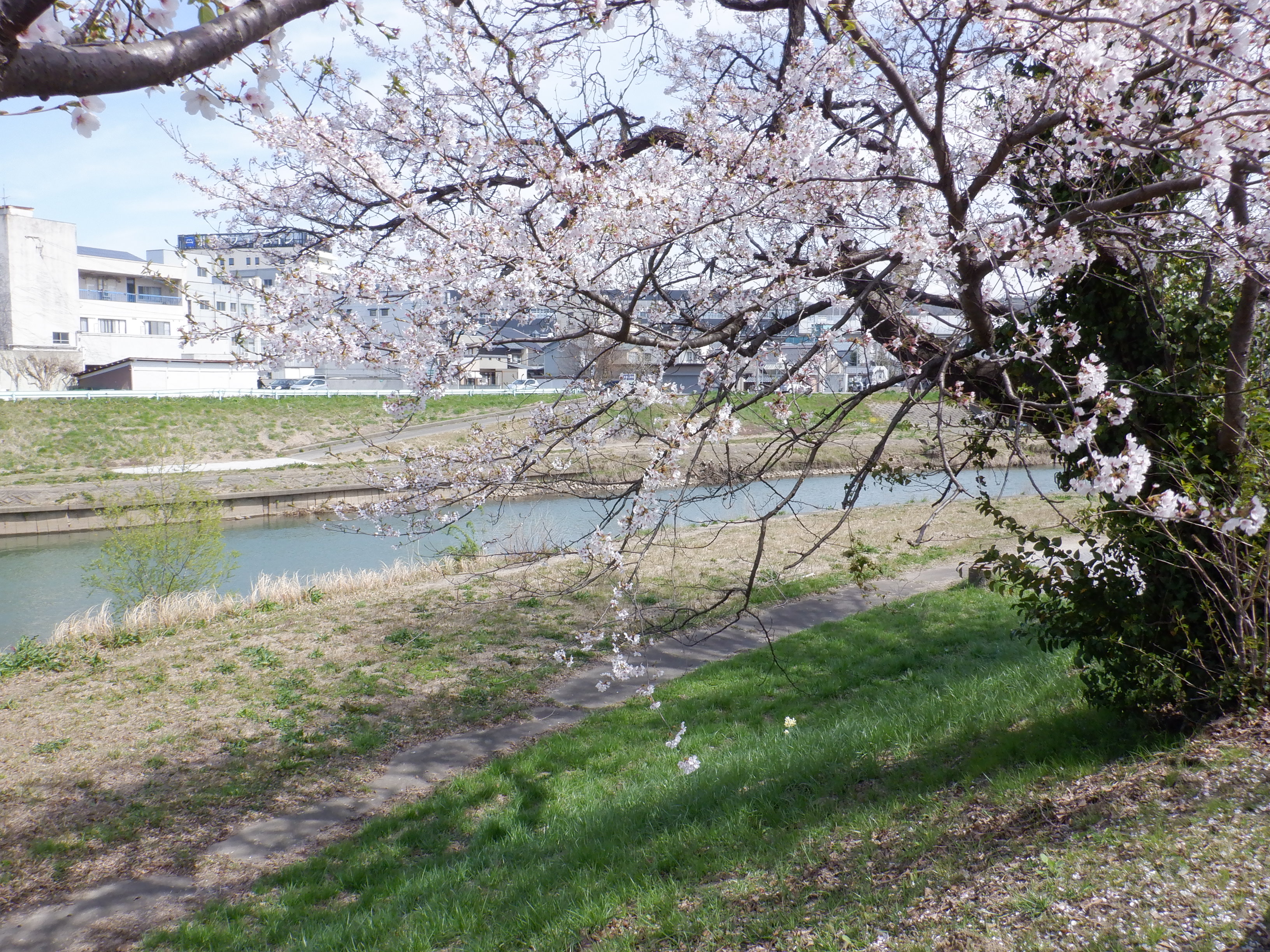 竹田川対岸から見た桜の花と芦原温泉駅。