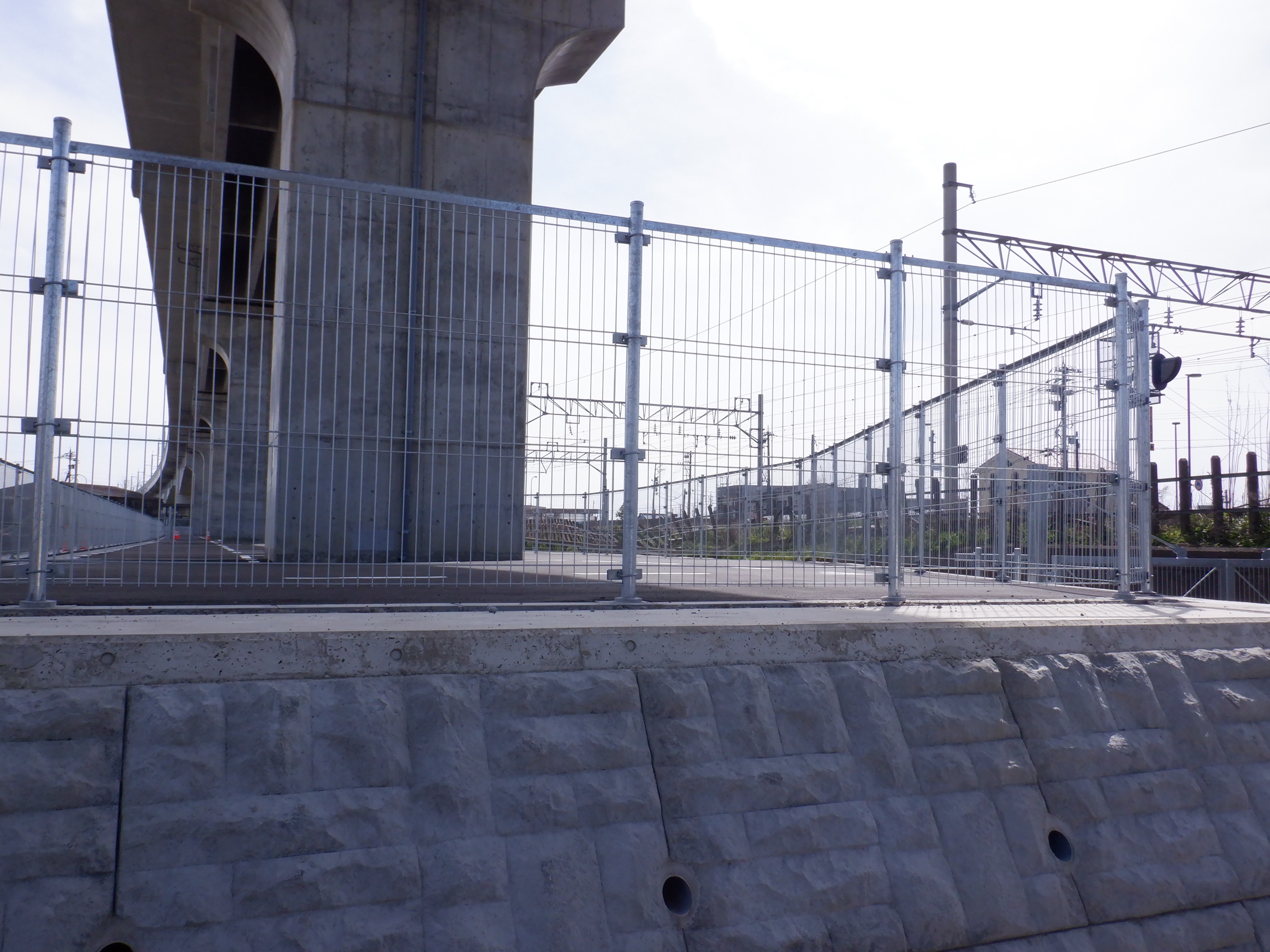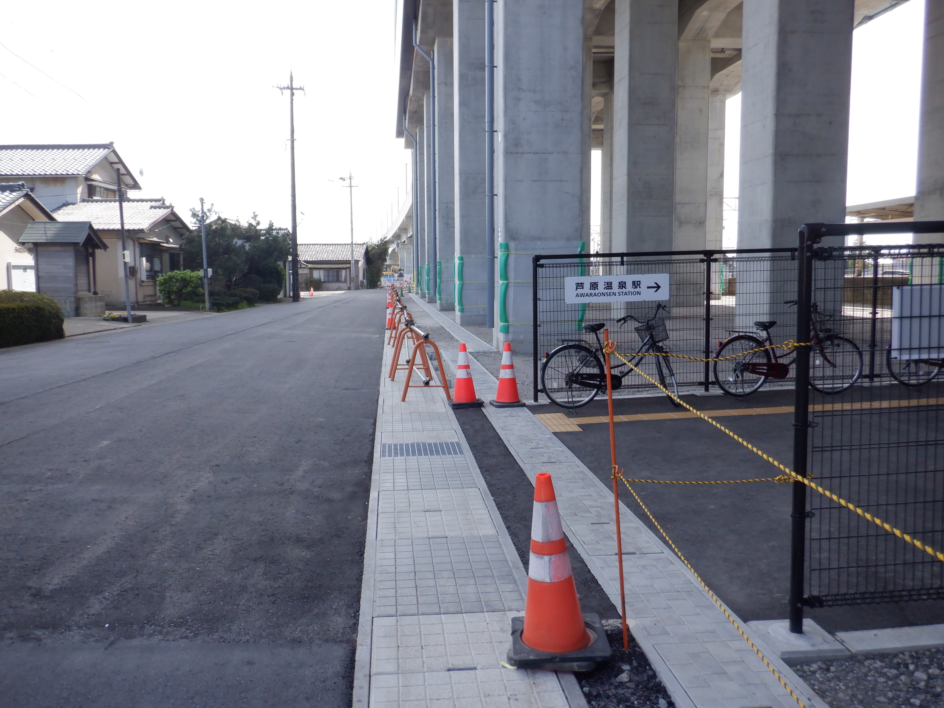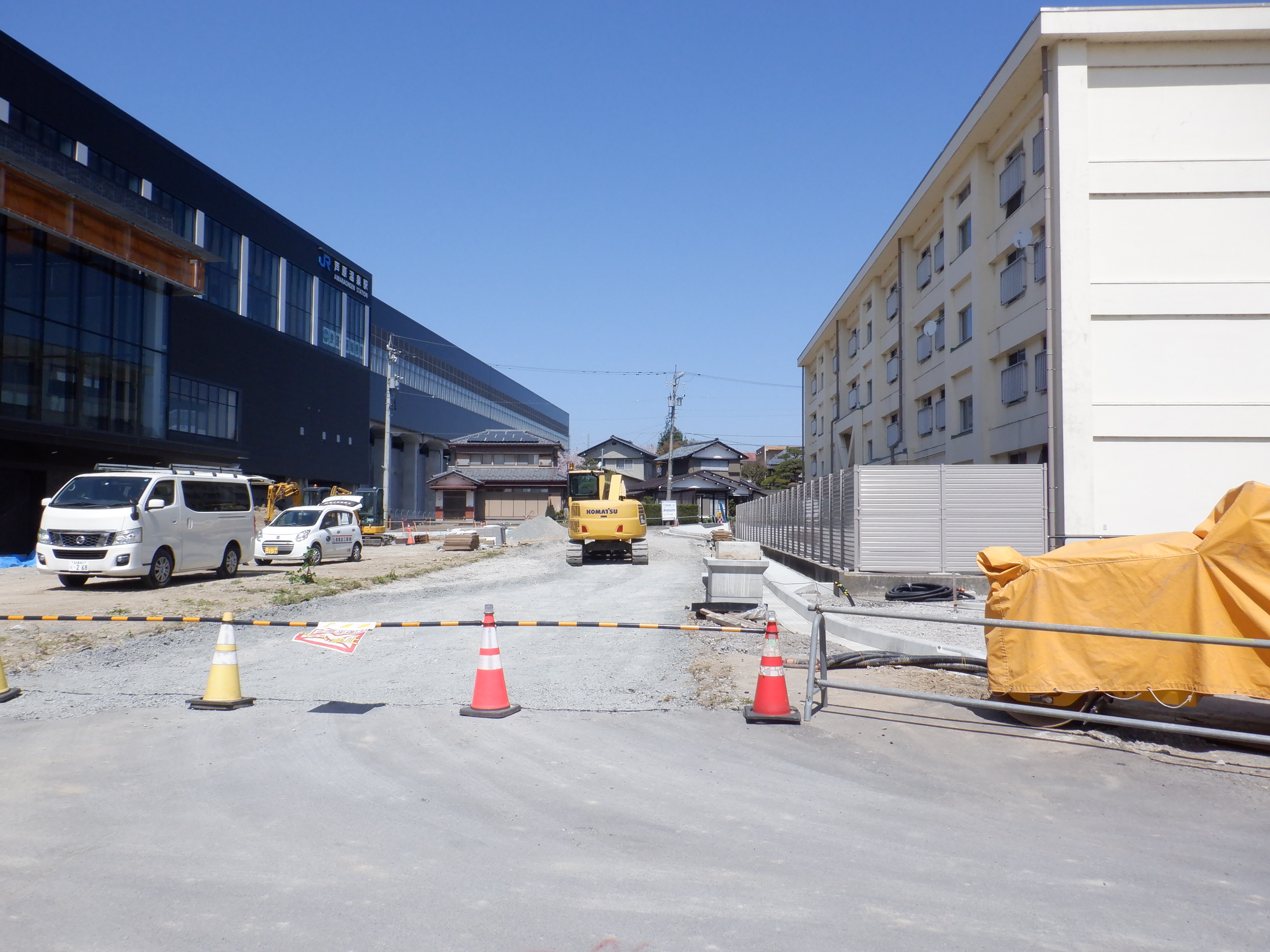 東口の交通広場と新幹線駅舎出入口建設中の様子、細呂木駅側から。陸橋下を通ることができるようになった代わりに、交通広場側の仮設通路は通行止めになり、広場建設が進んでいます。