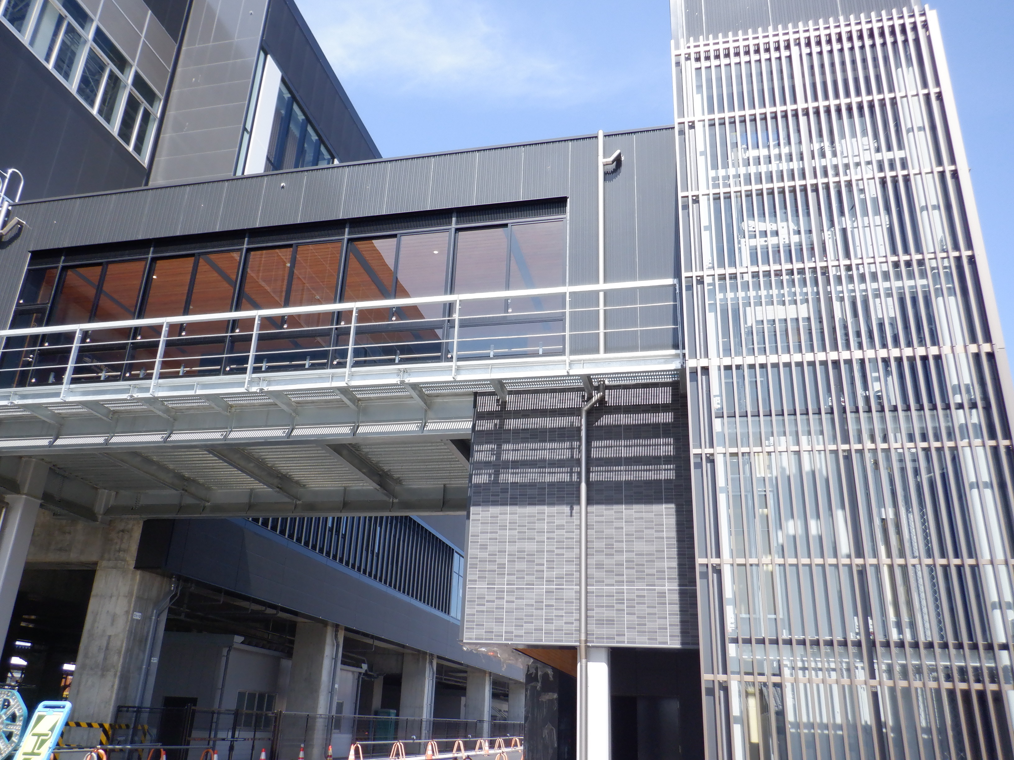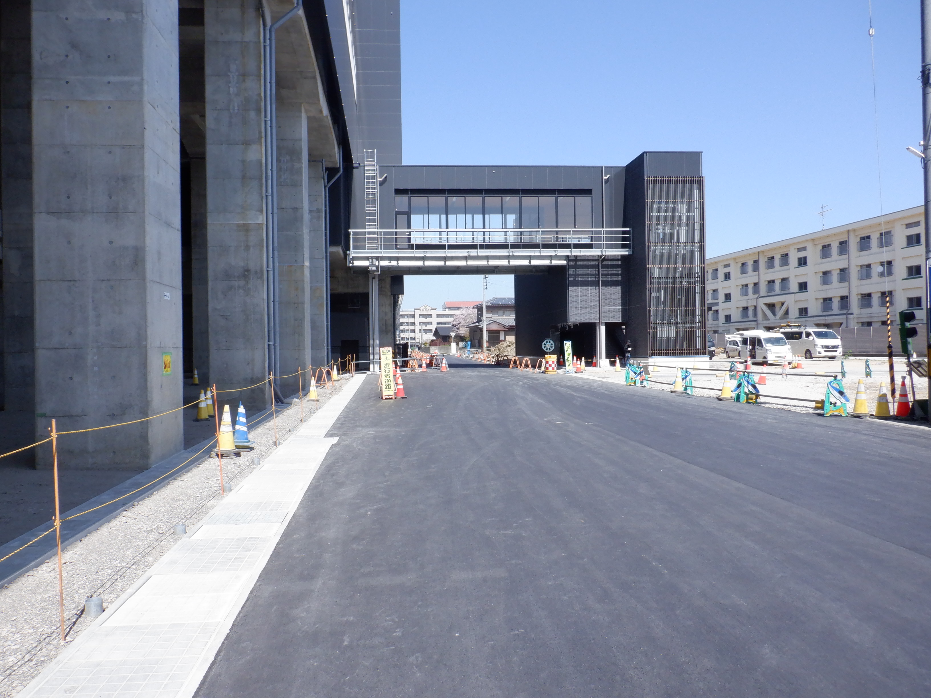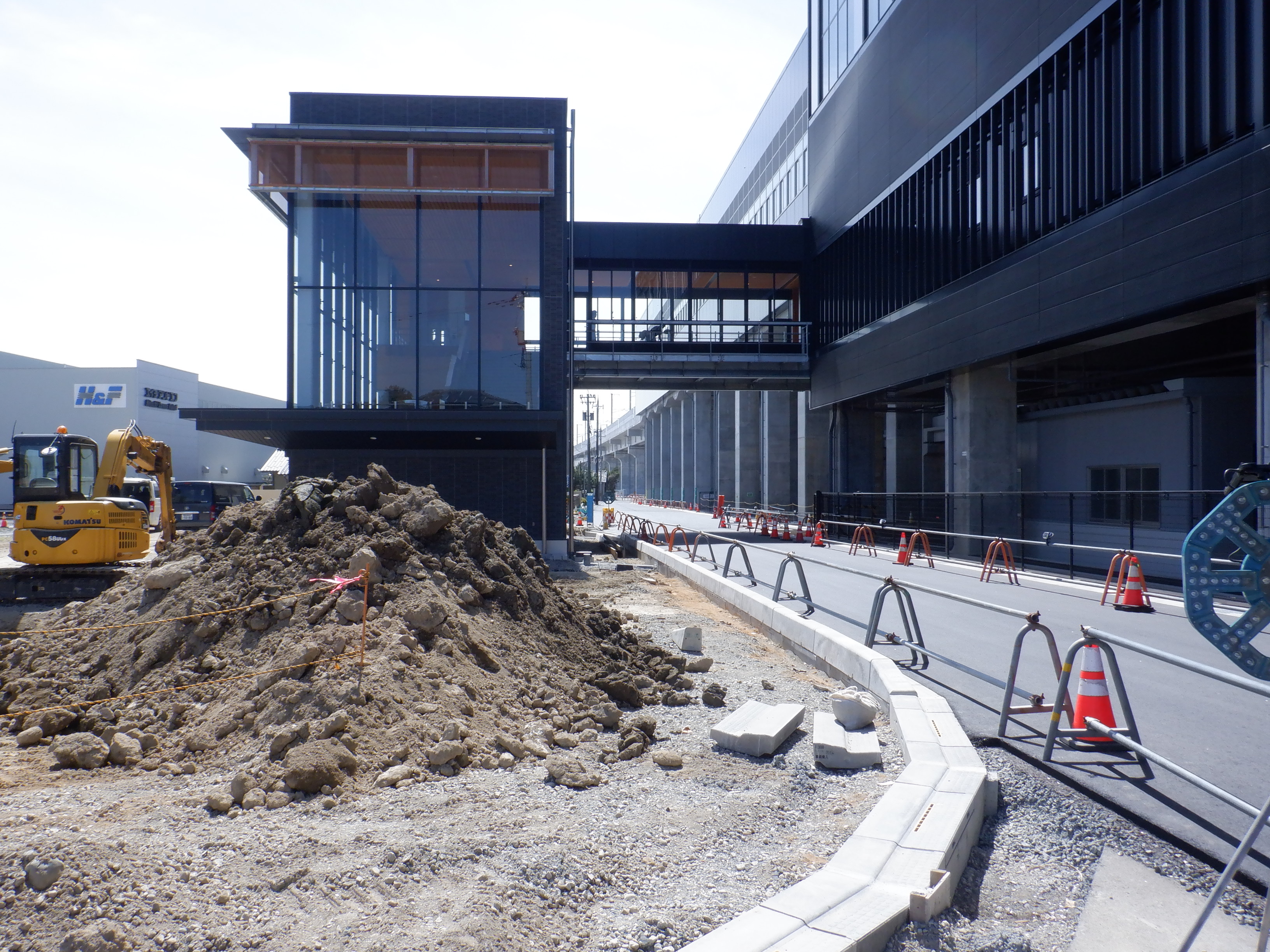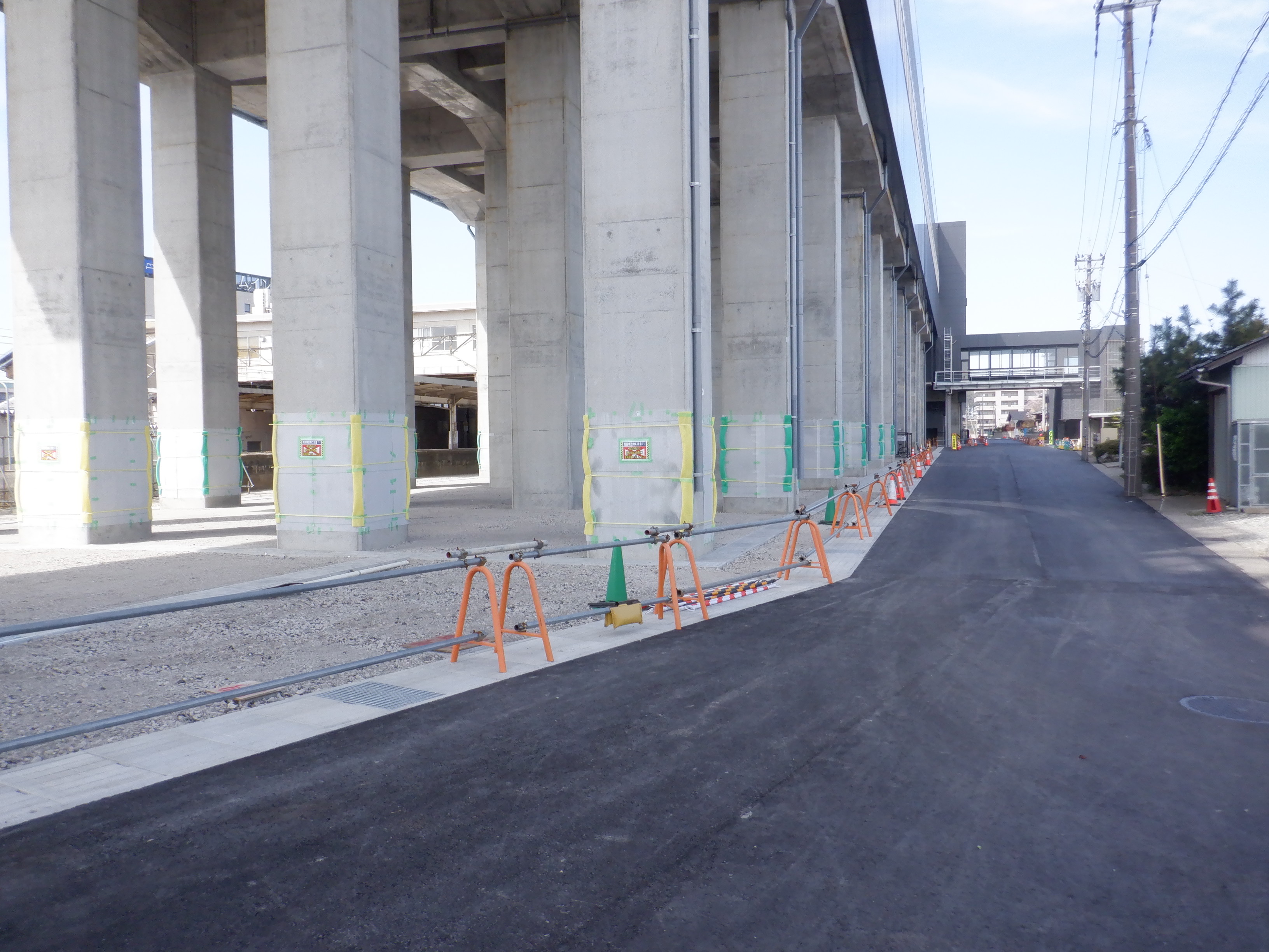 道路の反対側から見た自由通路と新幹線駅舎出入口建設中のところ。