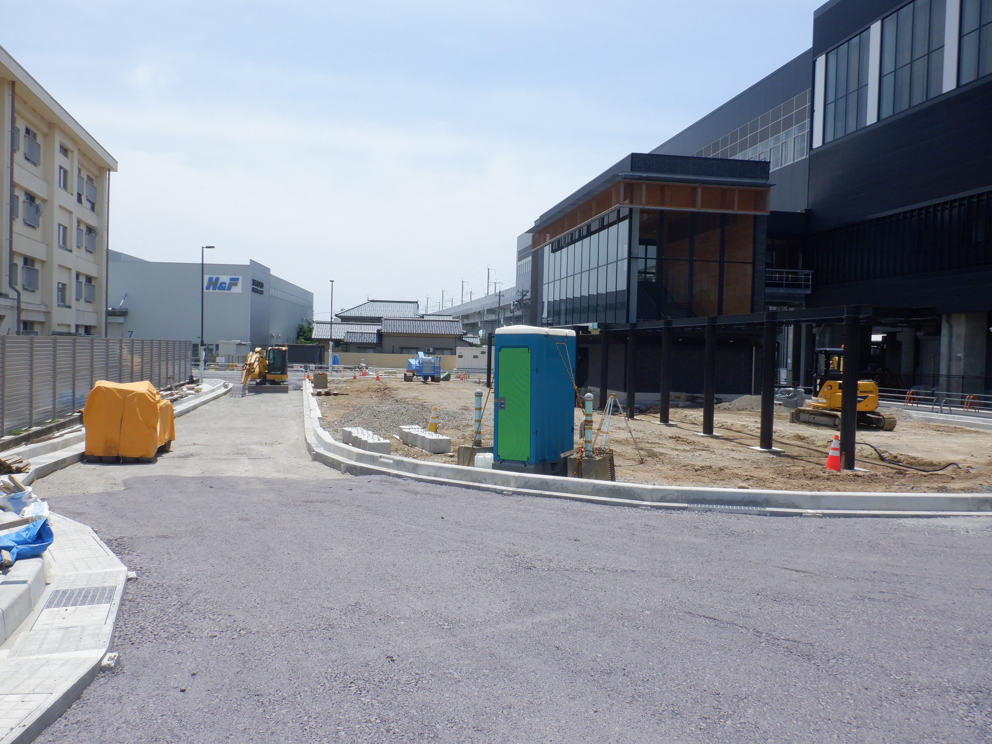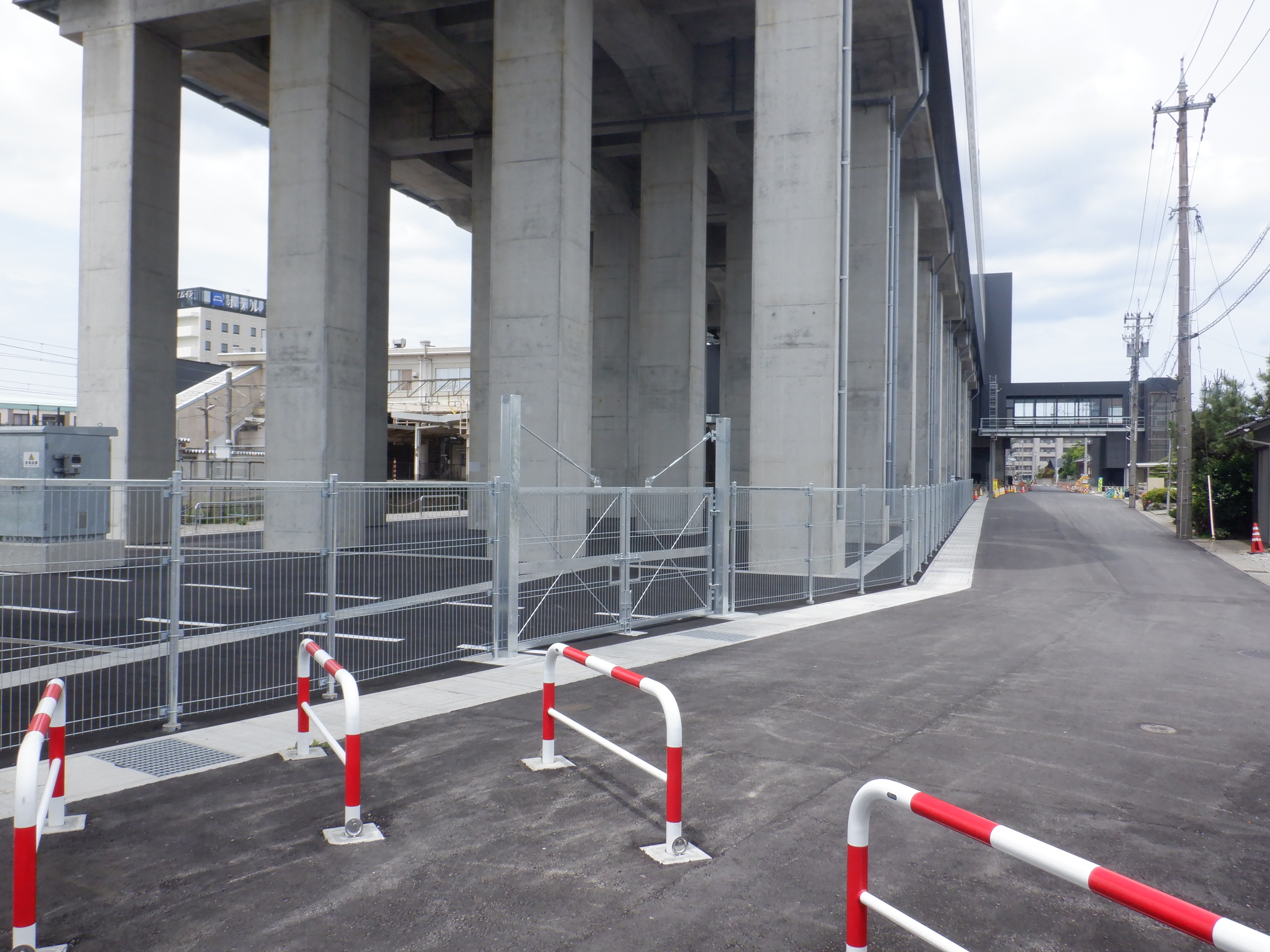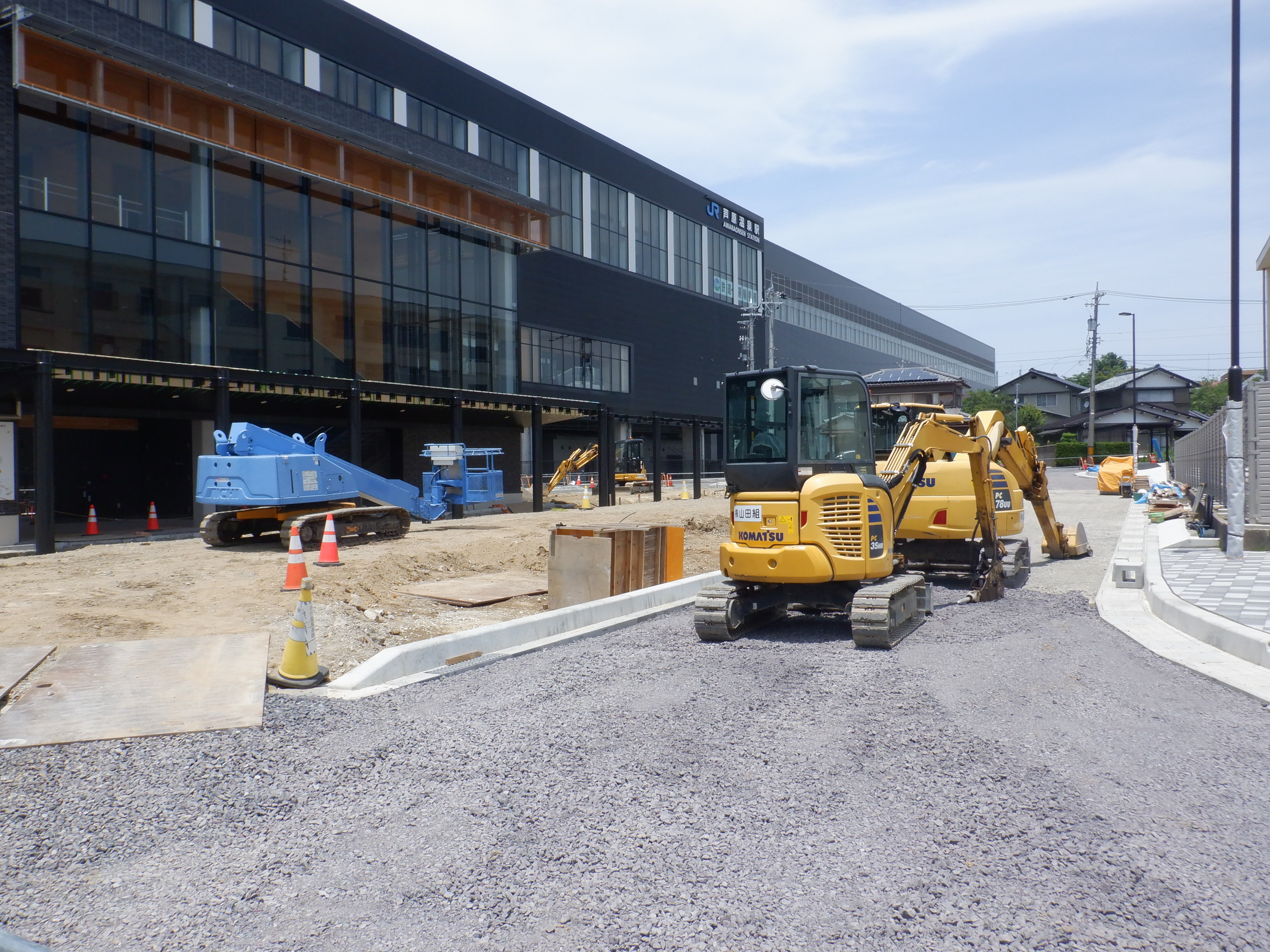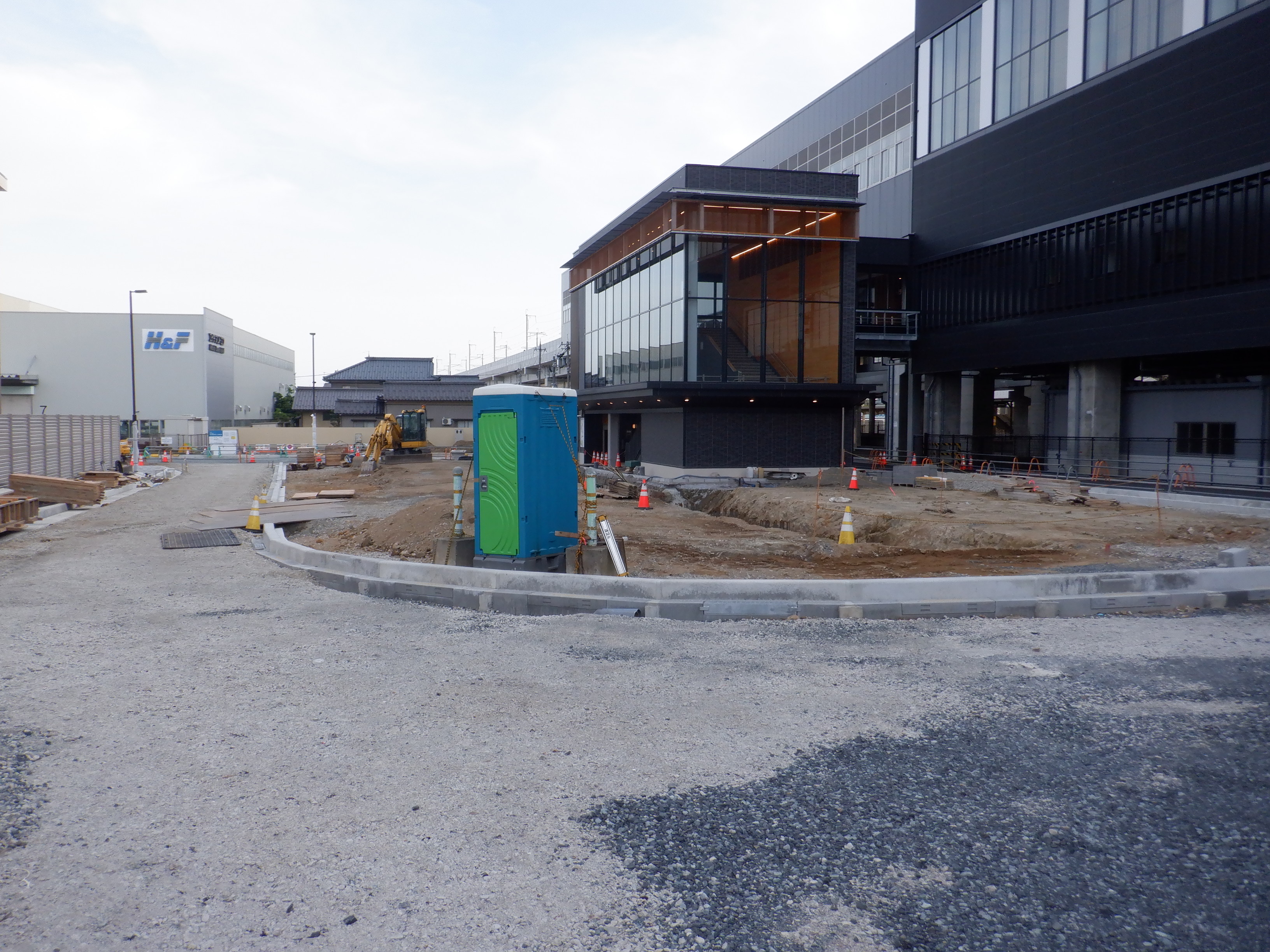 新しい道路から西口へ。駅前の新しいホテルの駐車場もできていました。