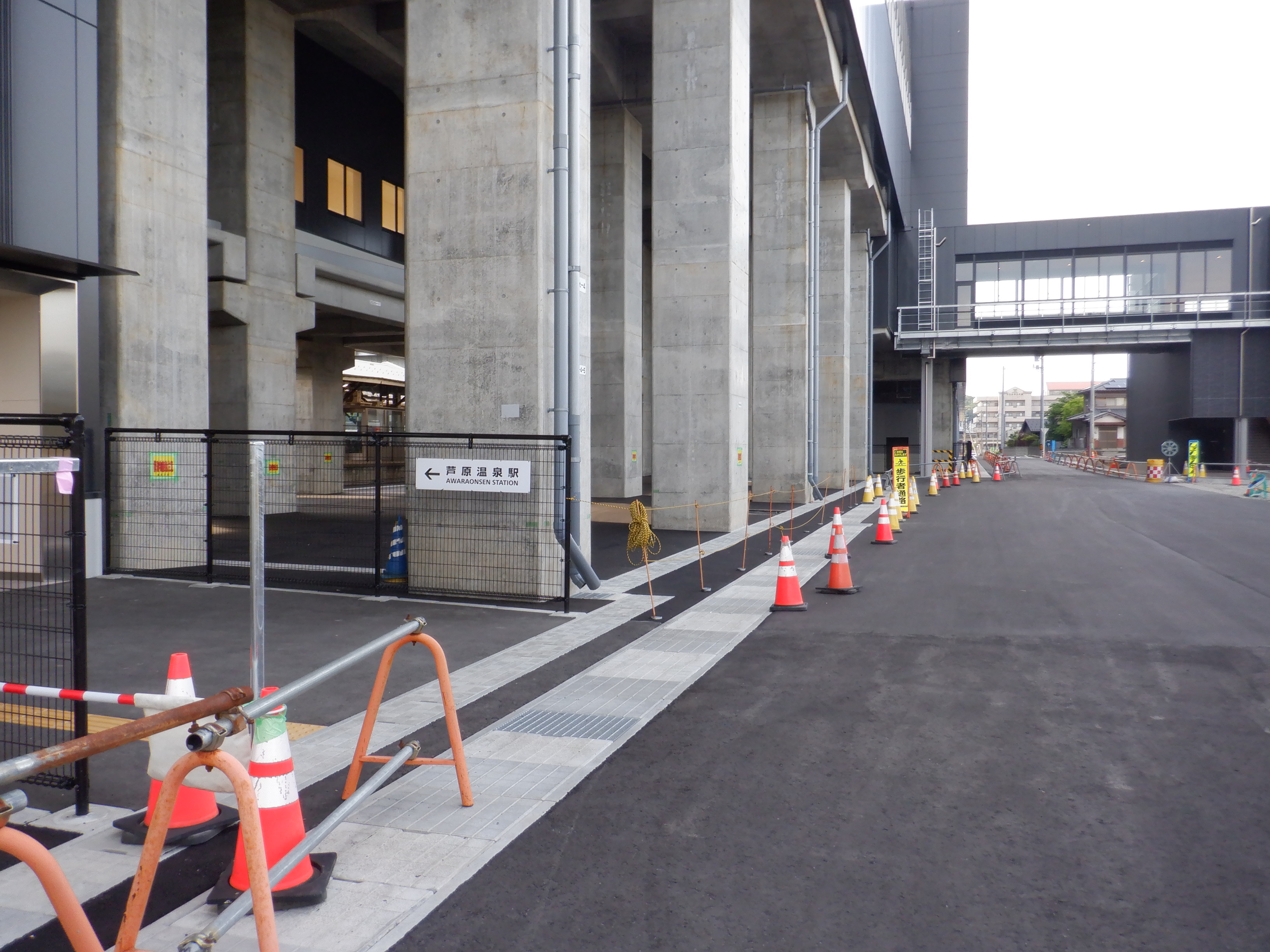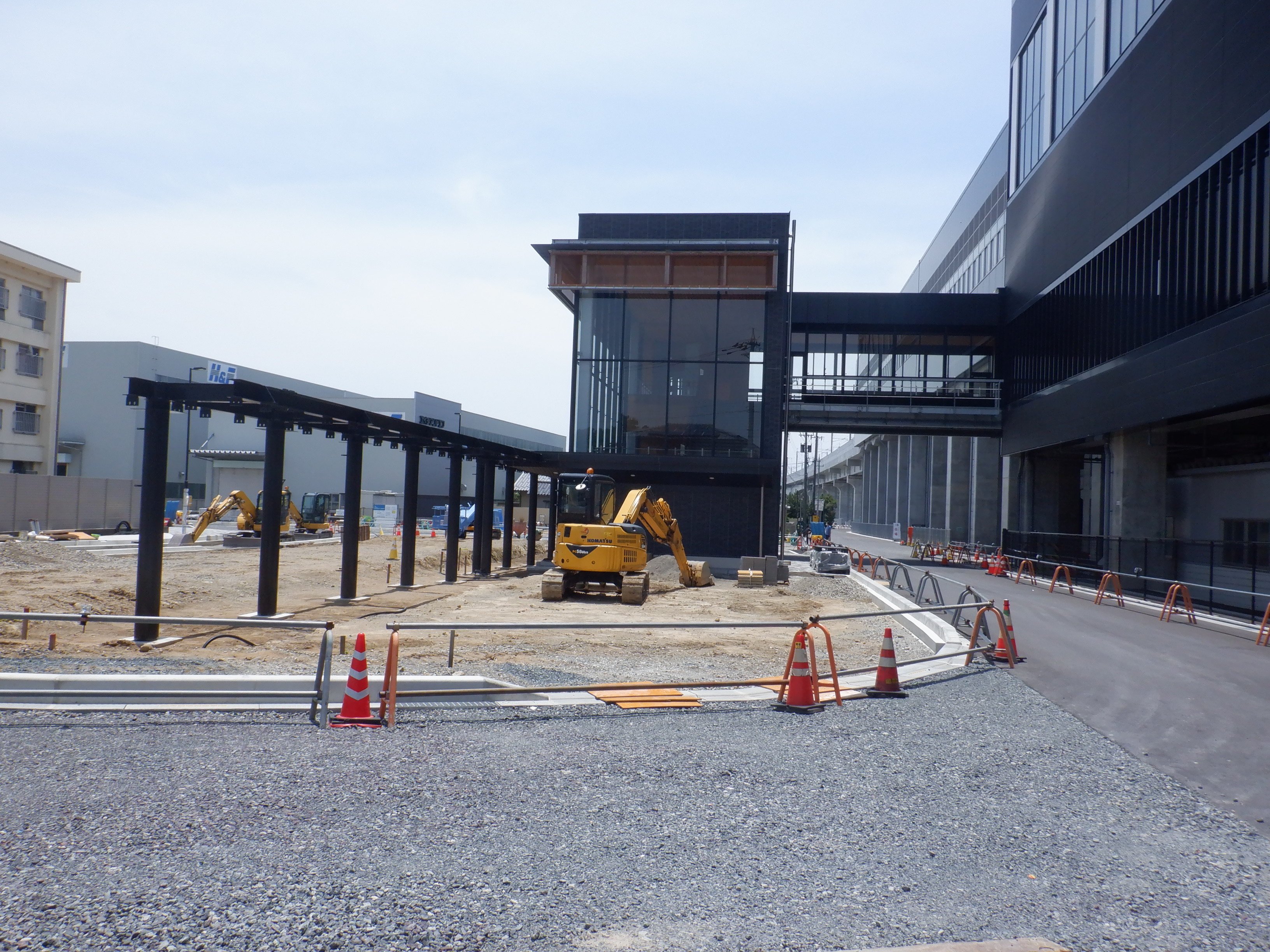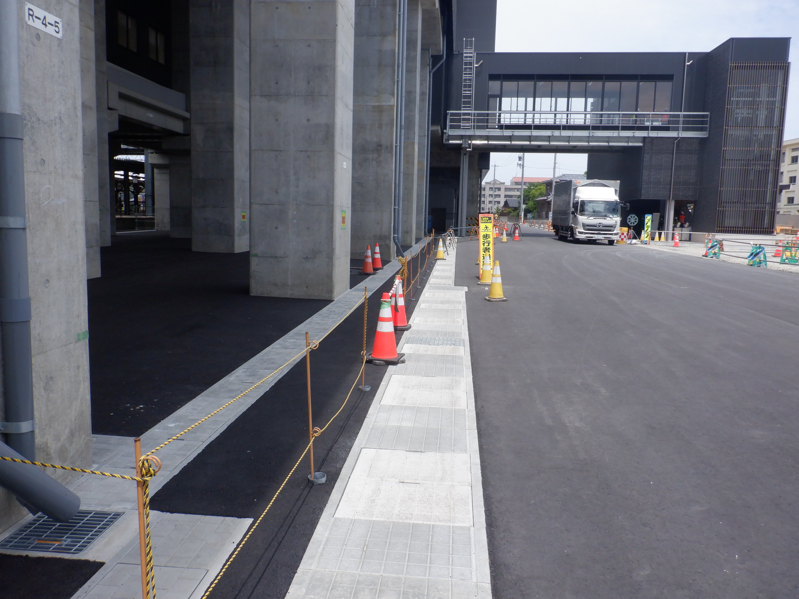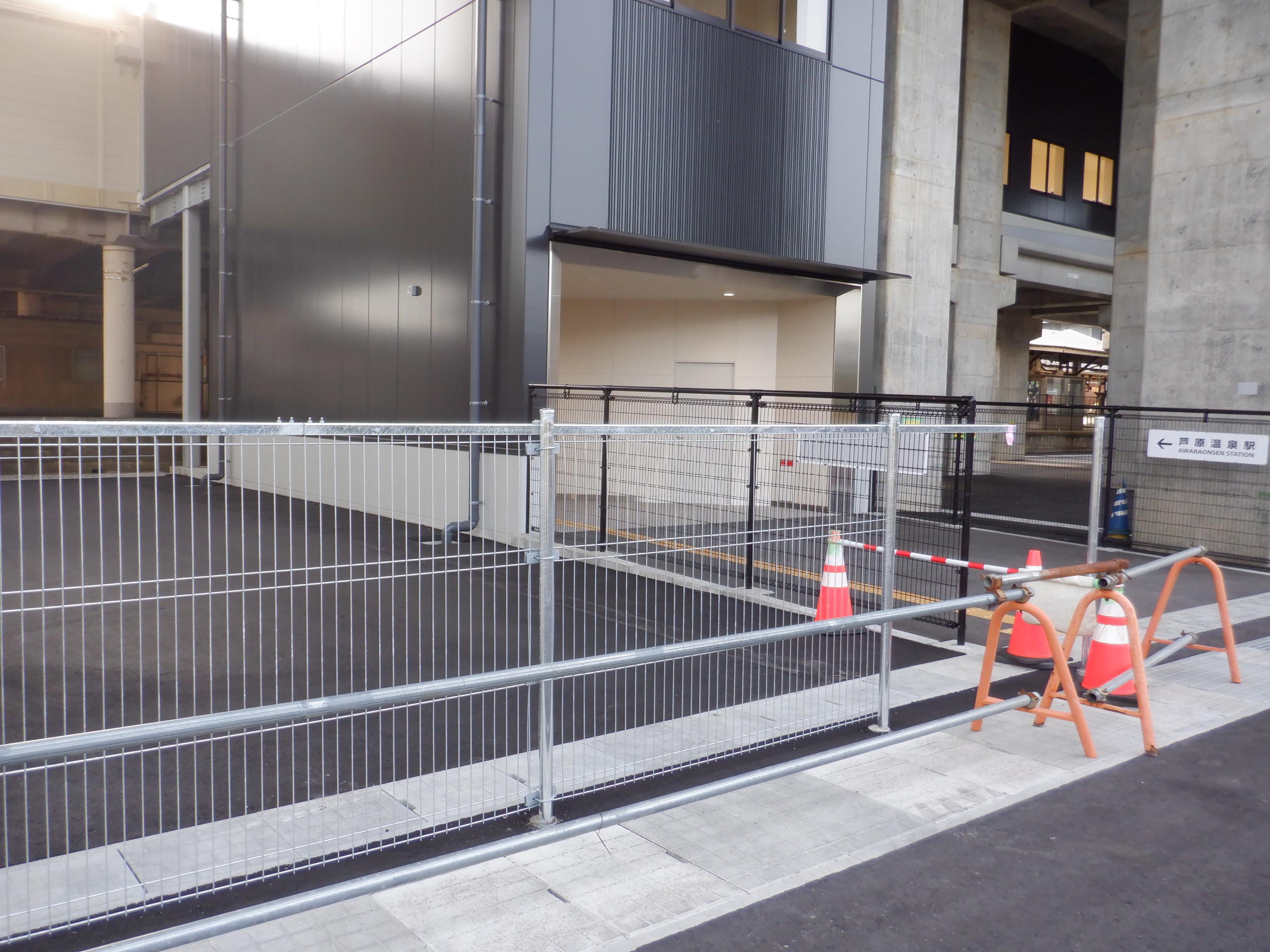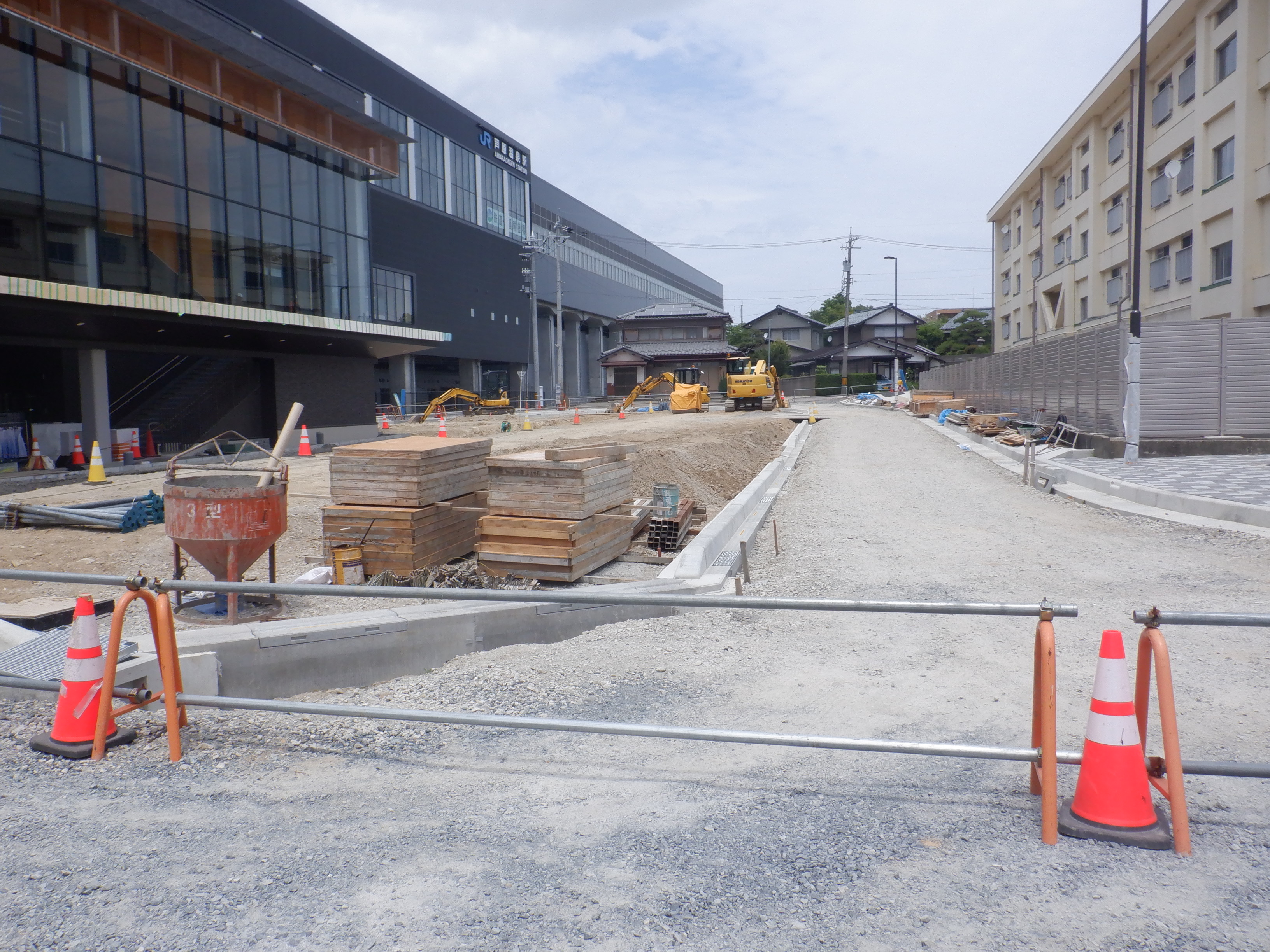 新しい道路から西口へ。駅前の新しいホテルの駐車場もできていました。
