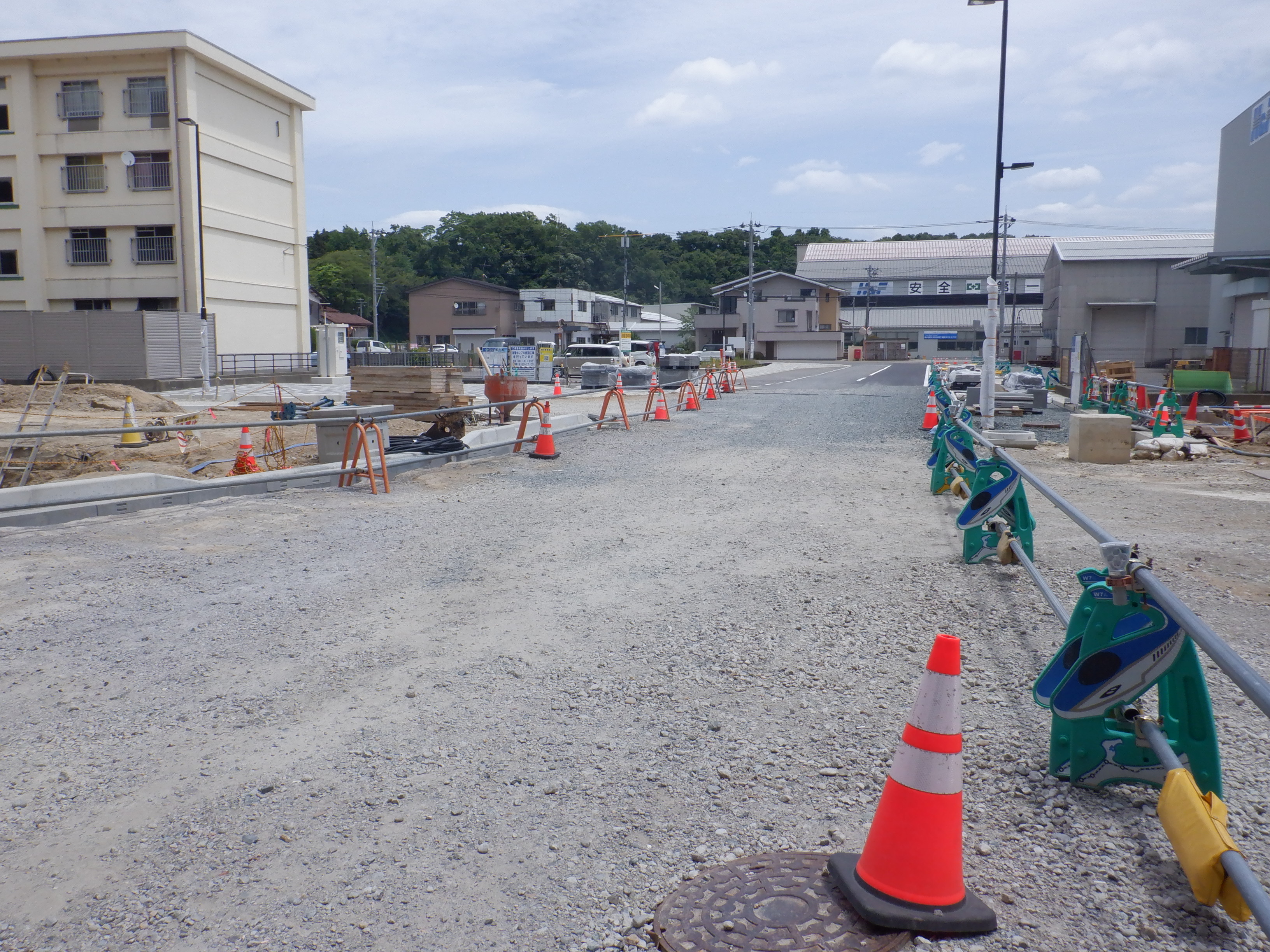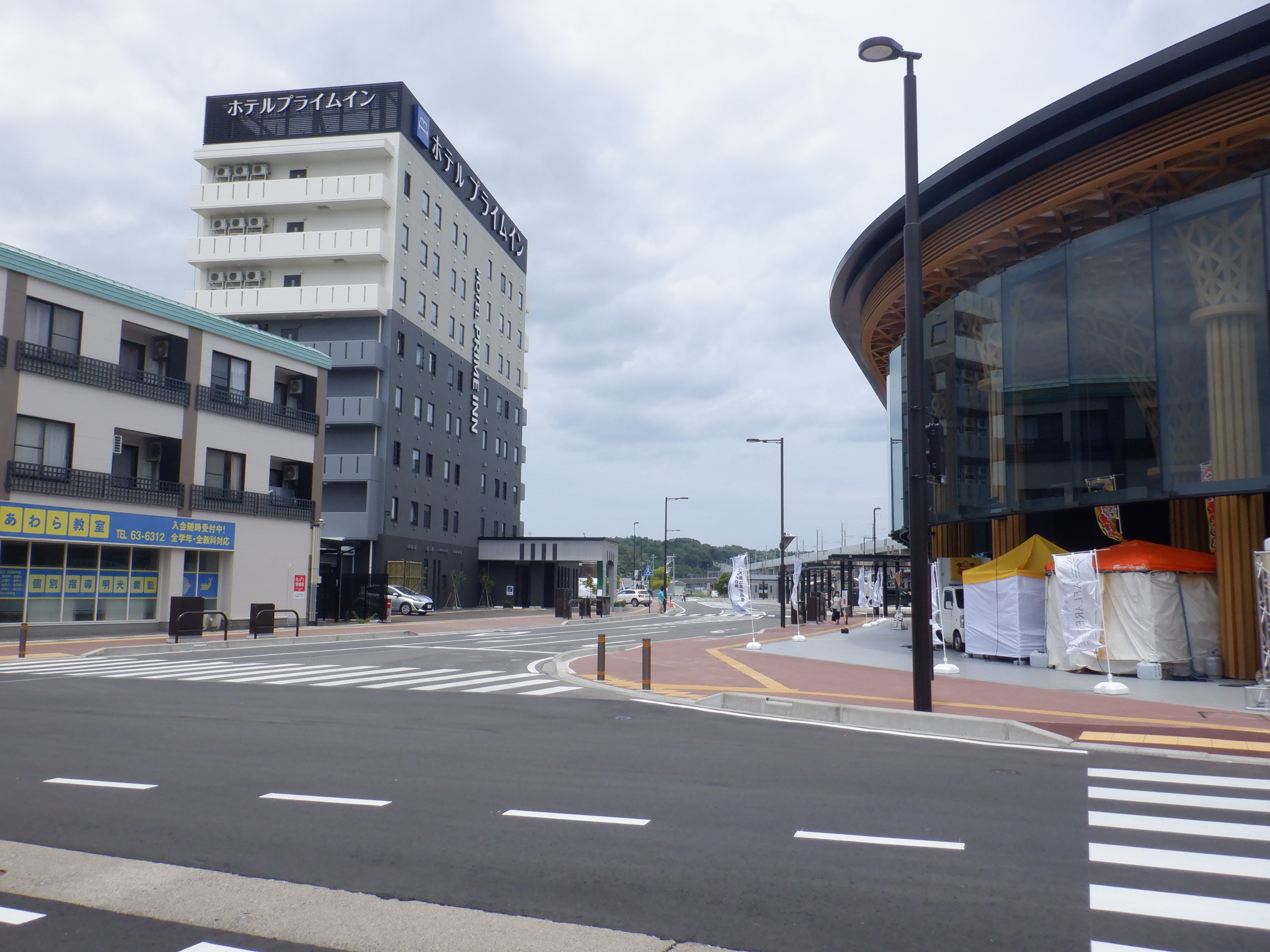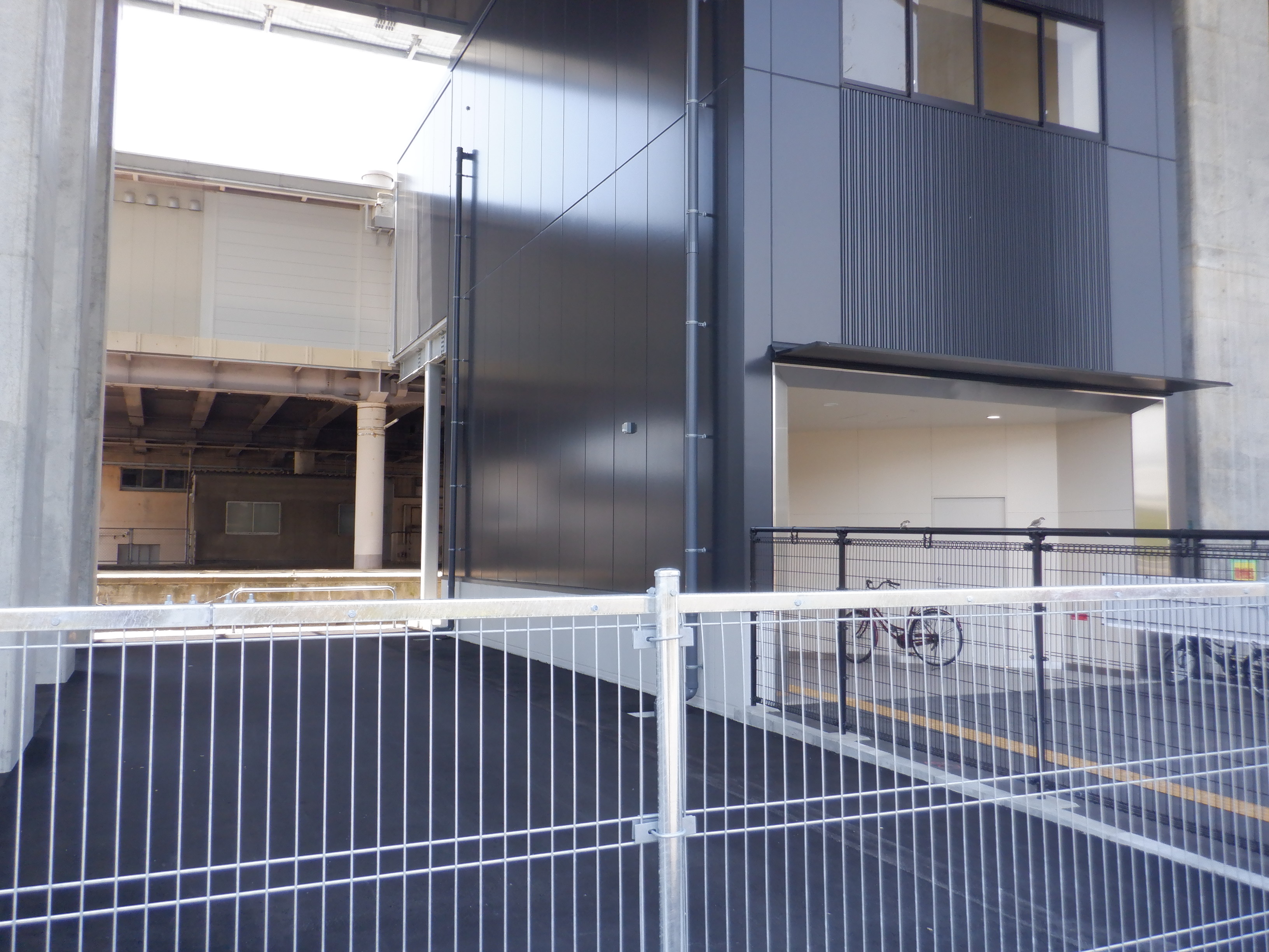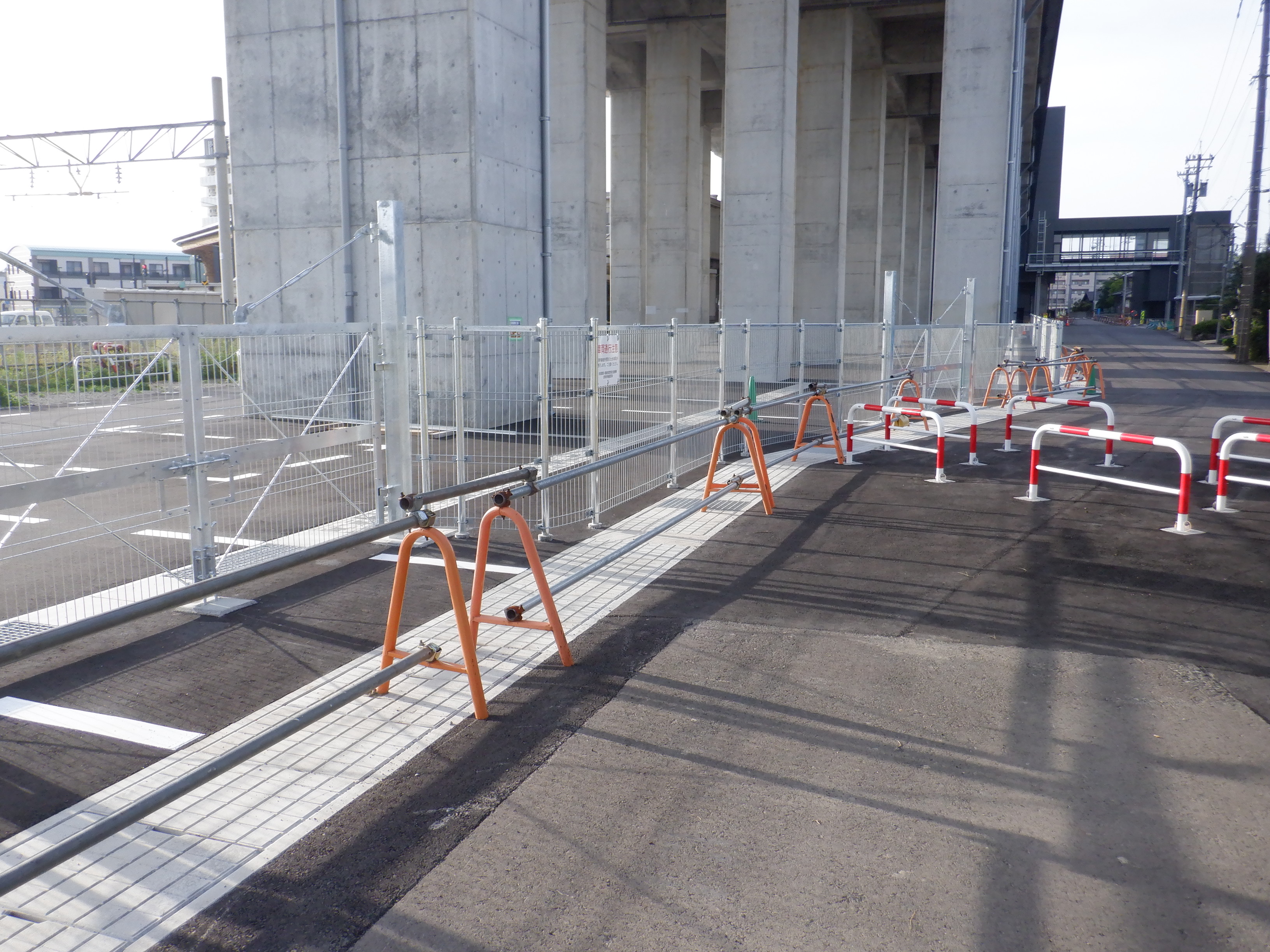 新しい道路から西口へ。駅前の新しいホテルの駐車場もできていました。