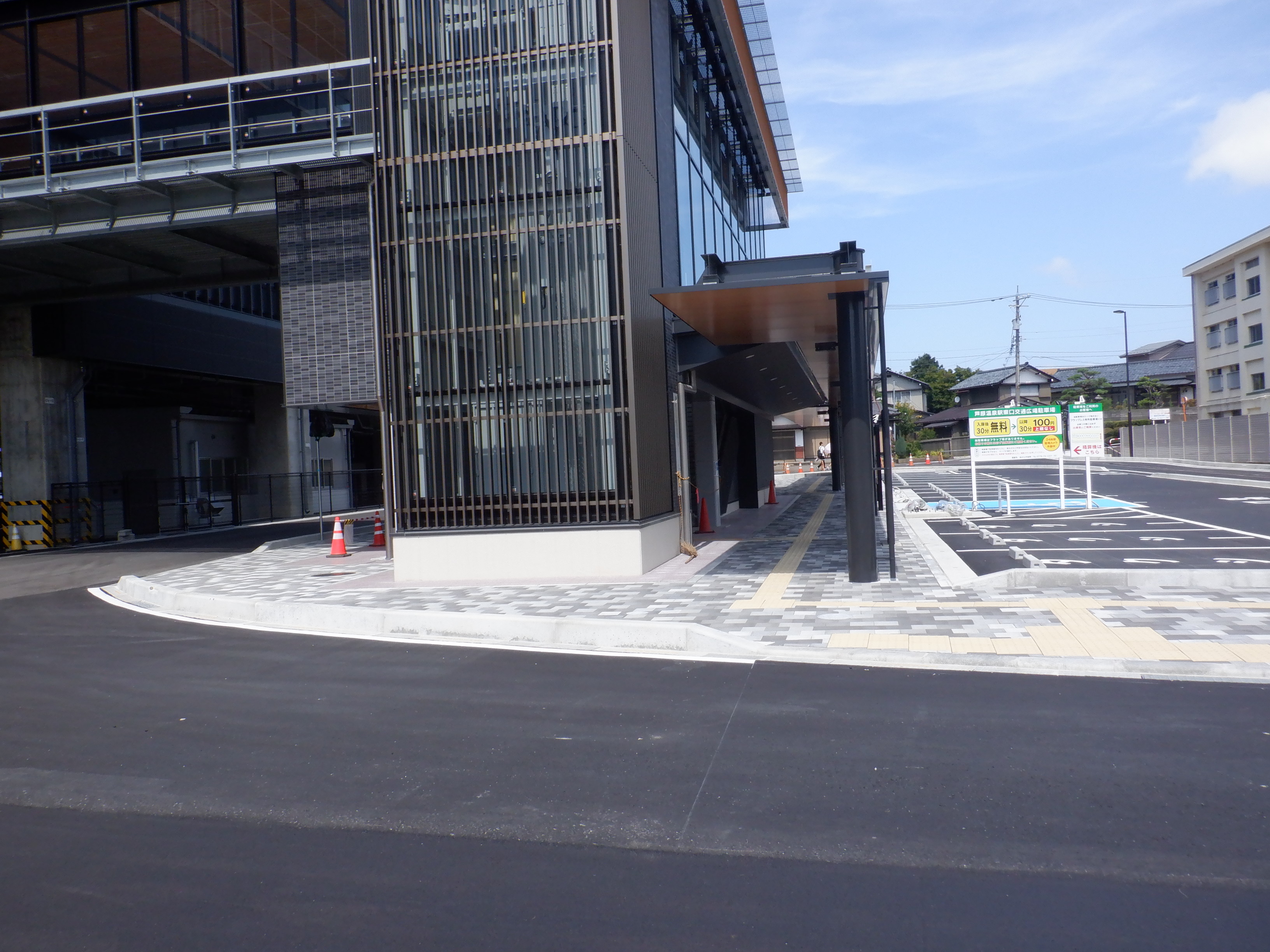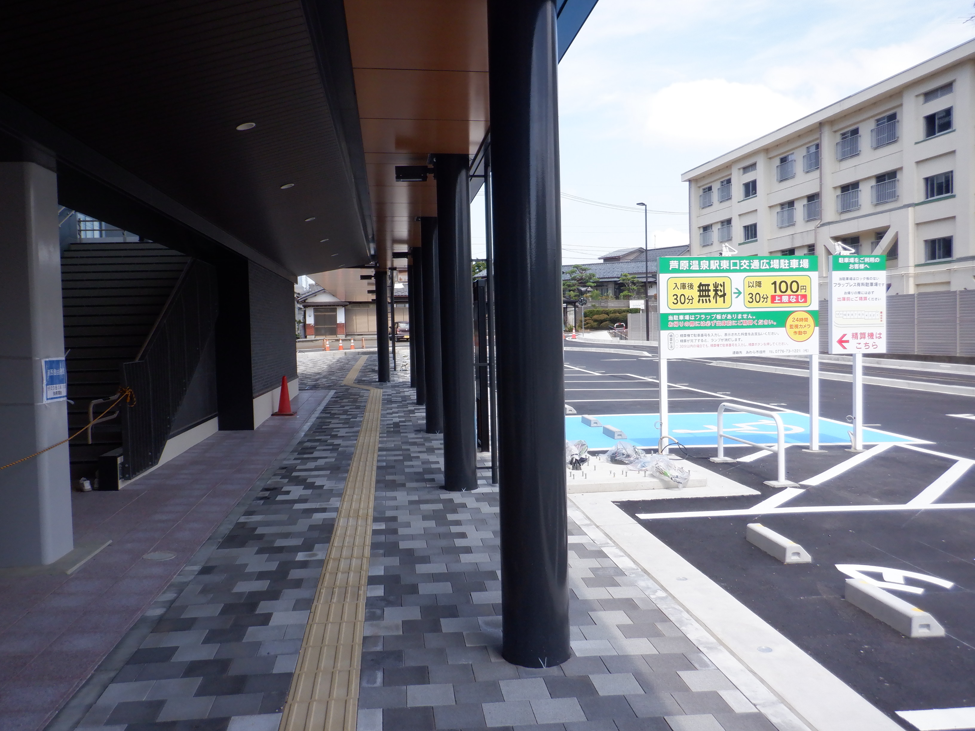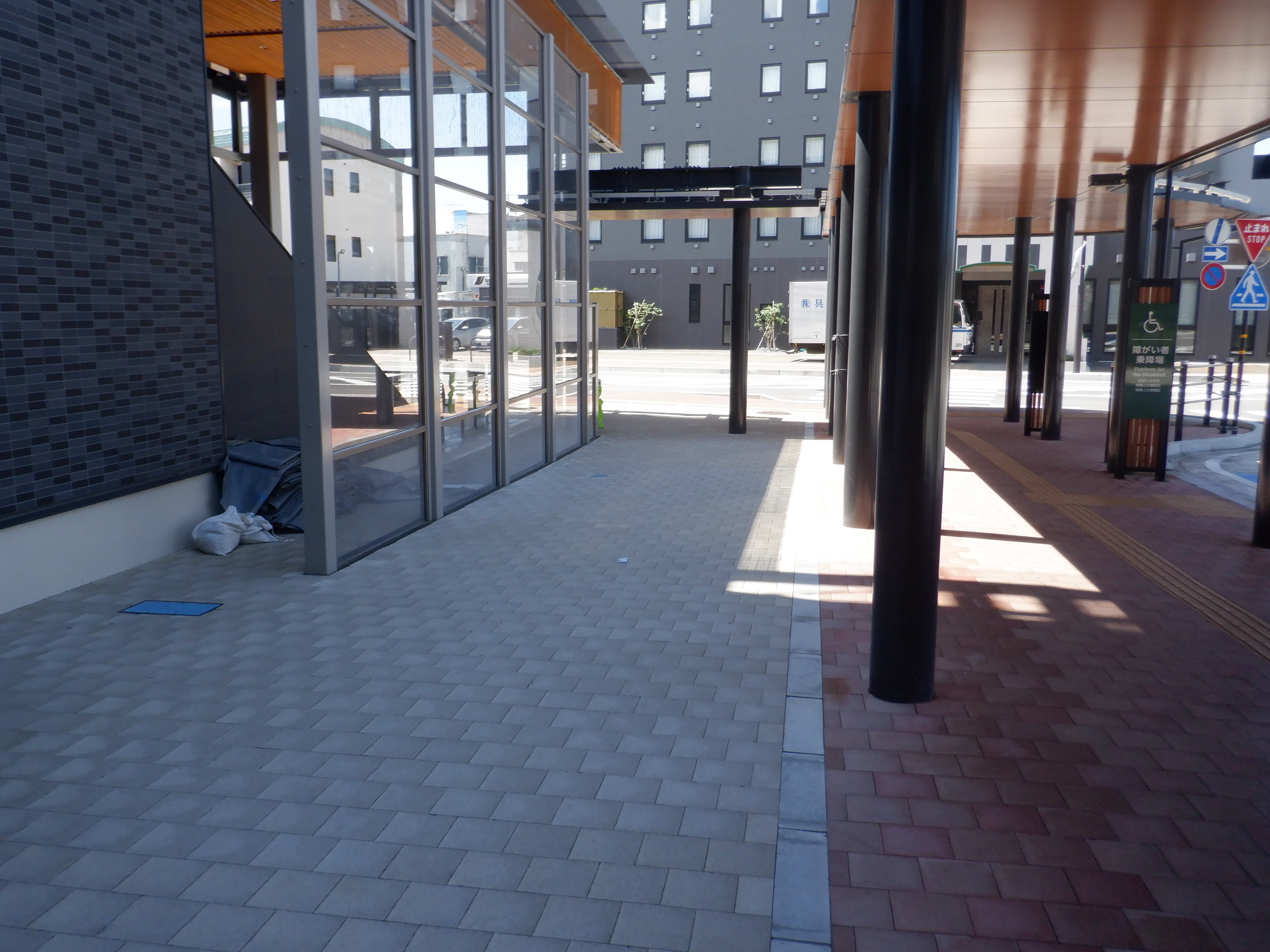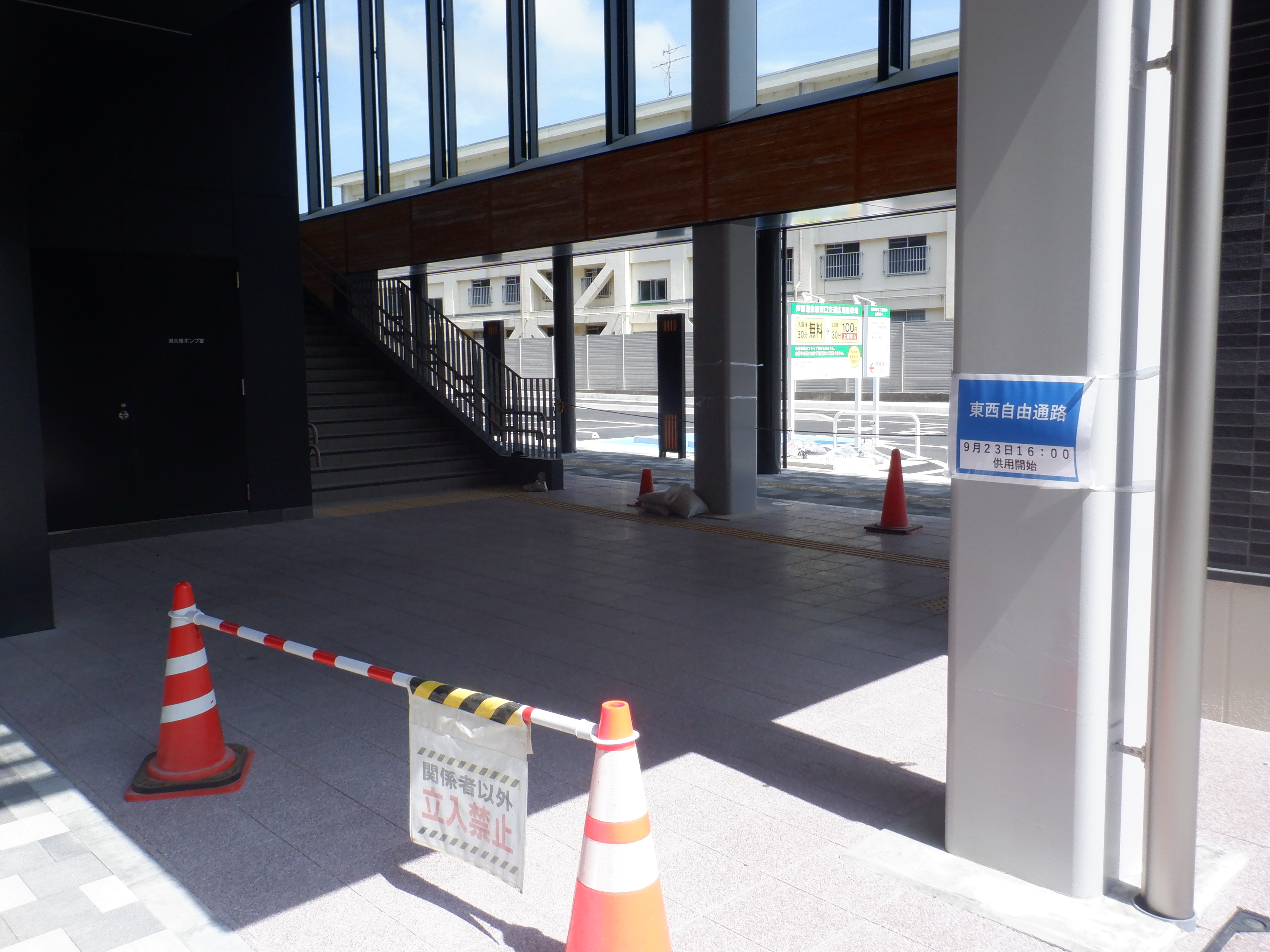 今回より東口の自由通路出入口の前が歩道として供用開始していました。