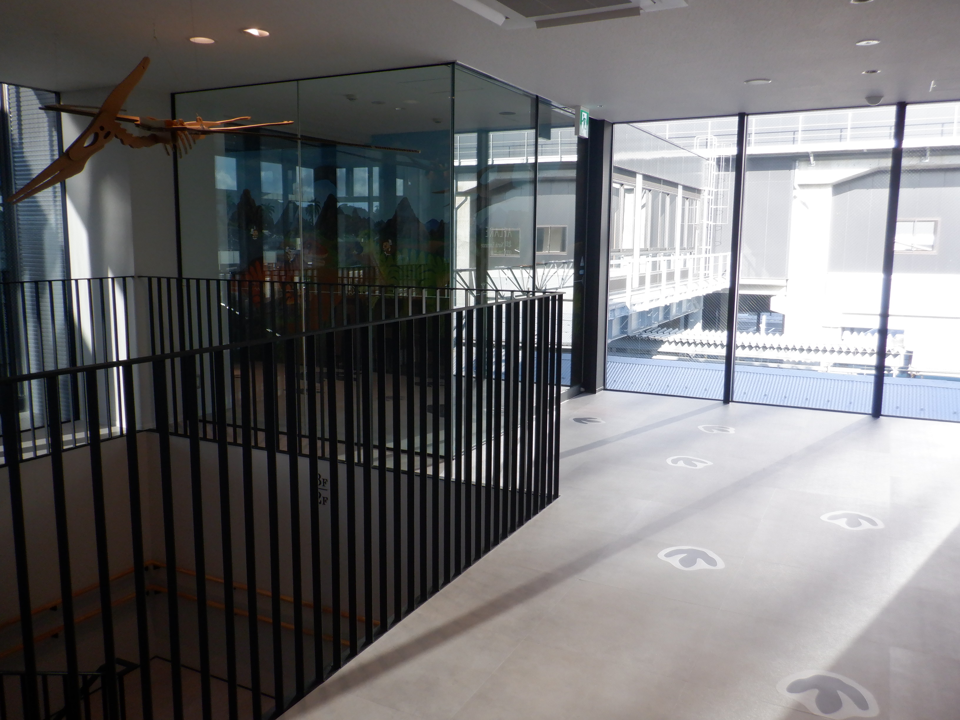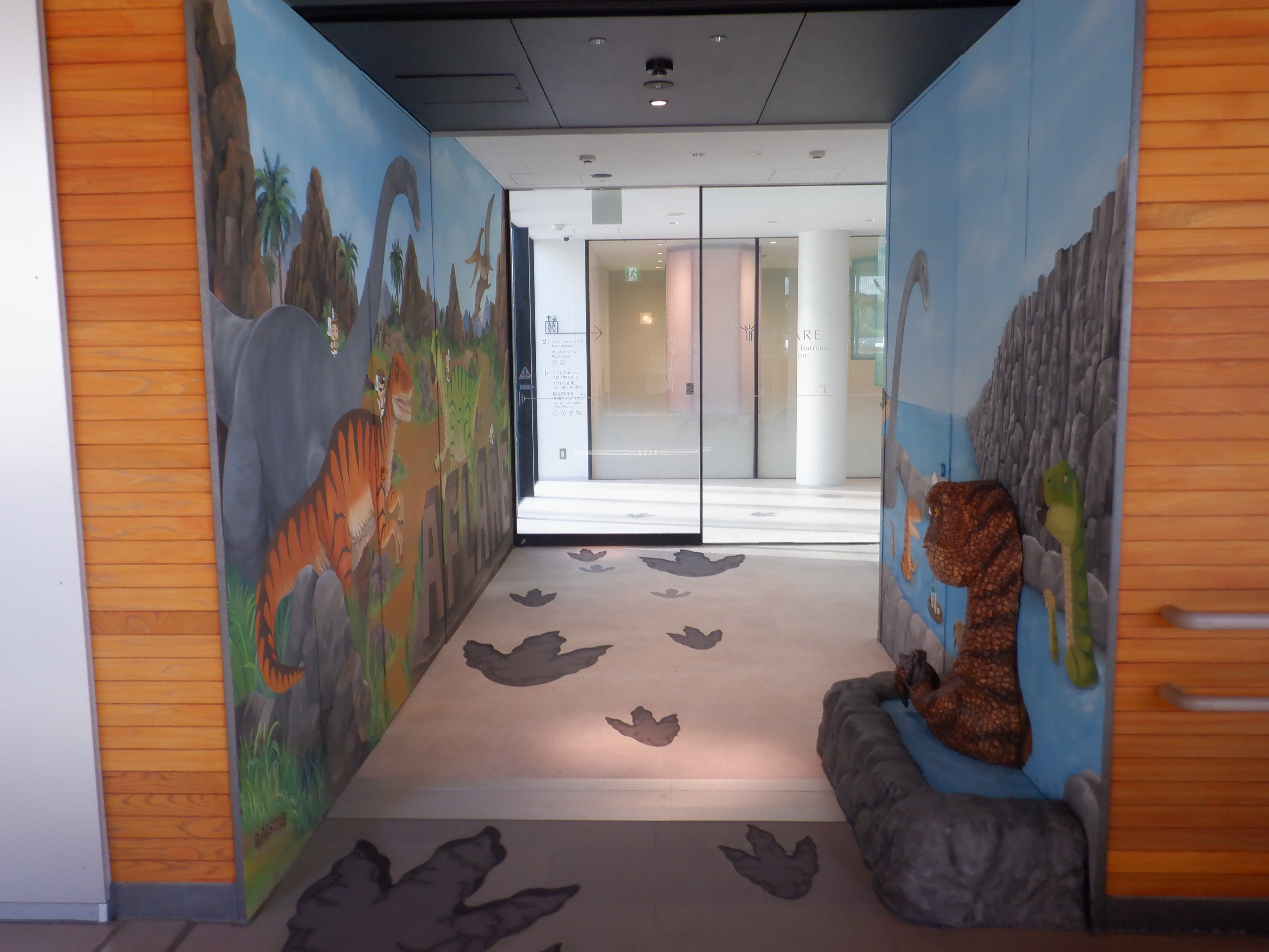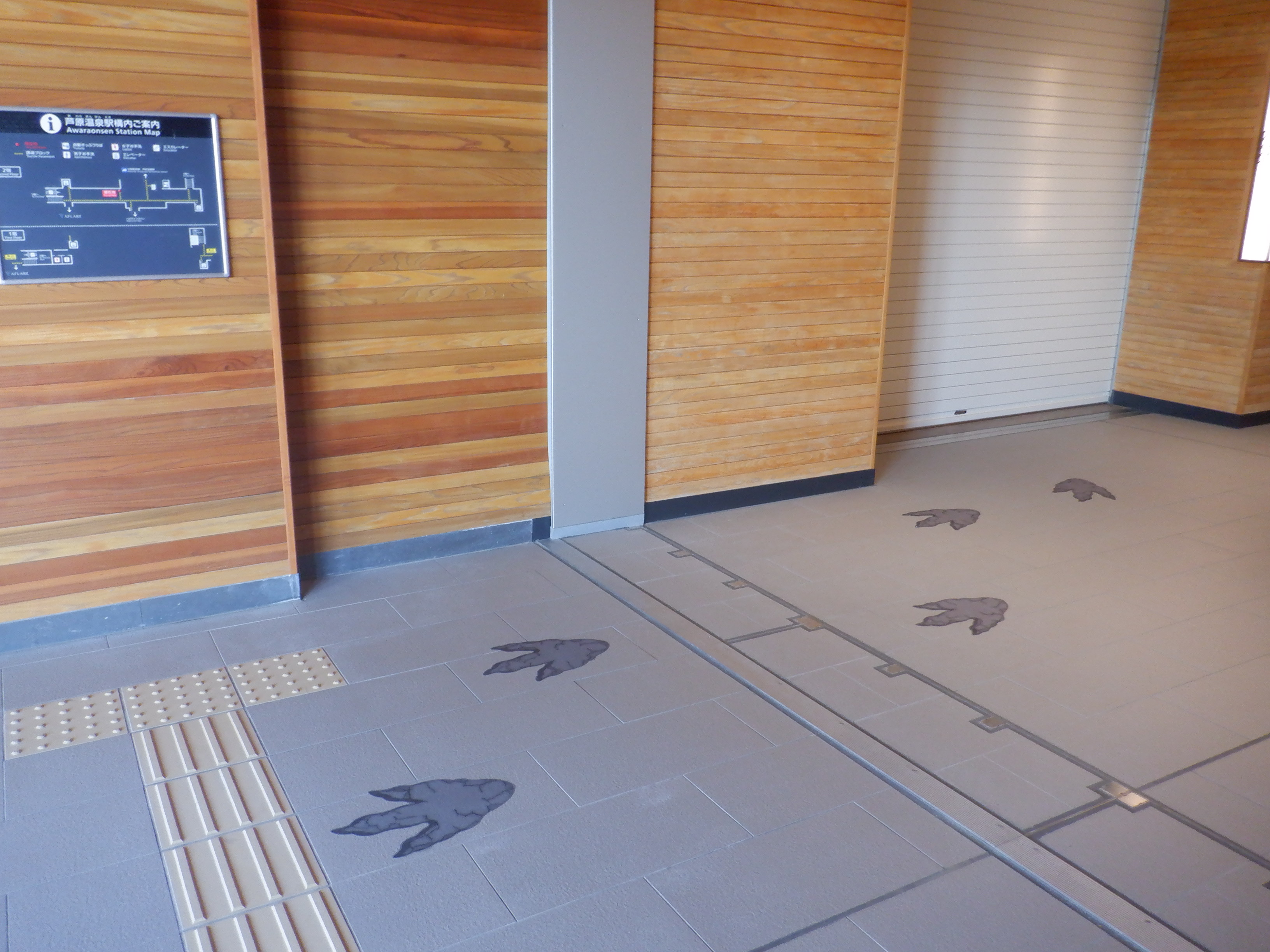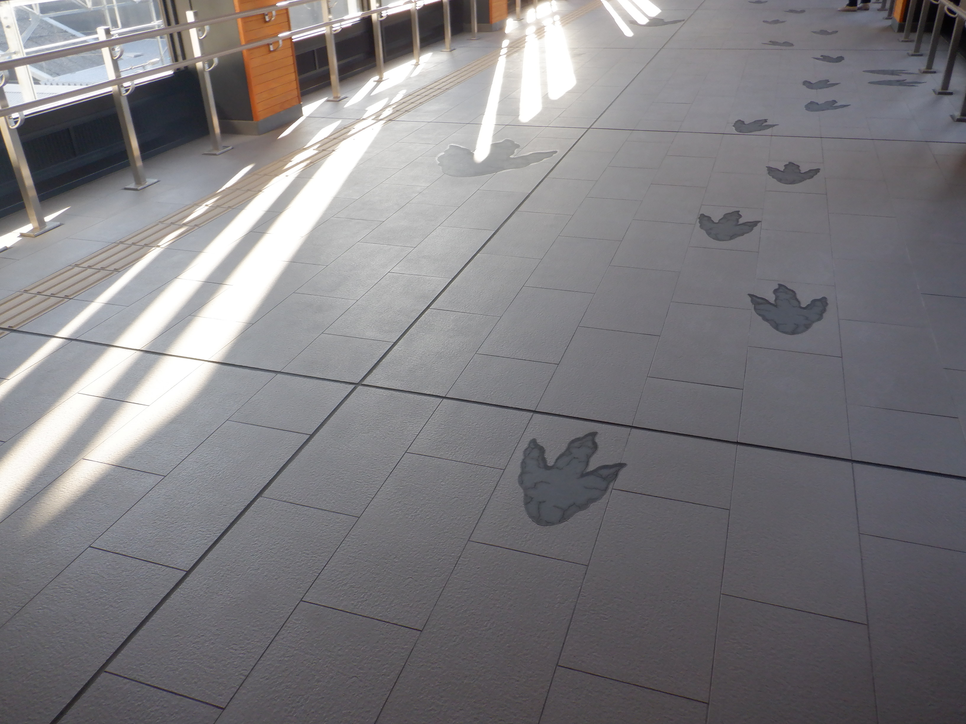 新幹線のりばから西口へは恐竜の足跡が描かれています。