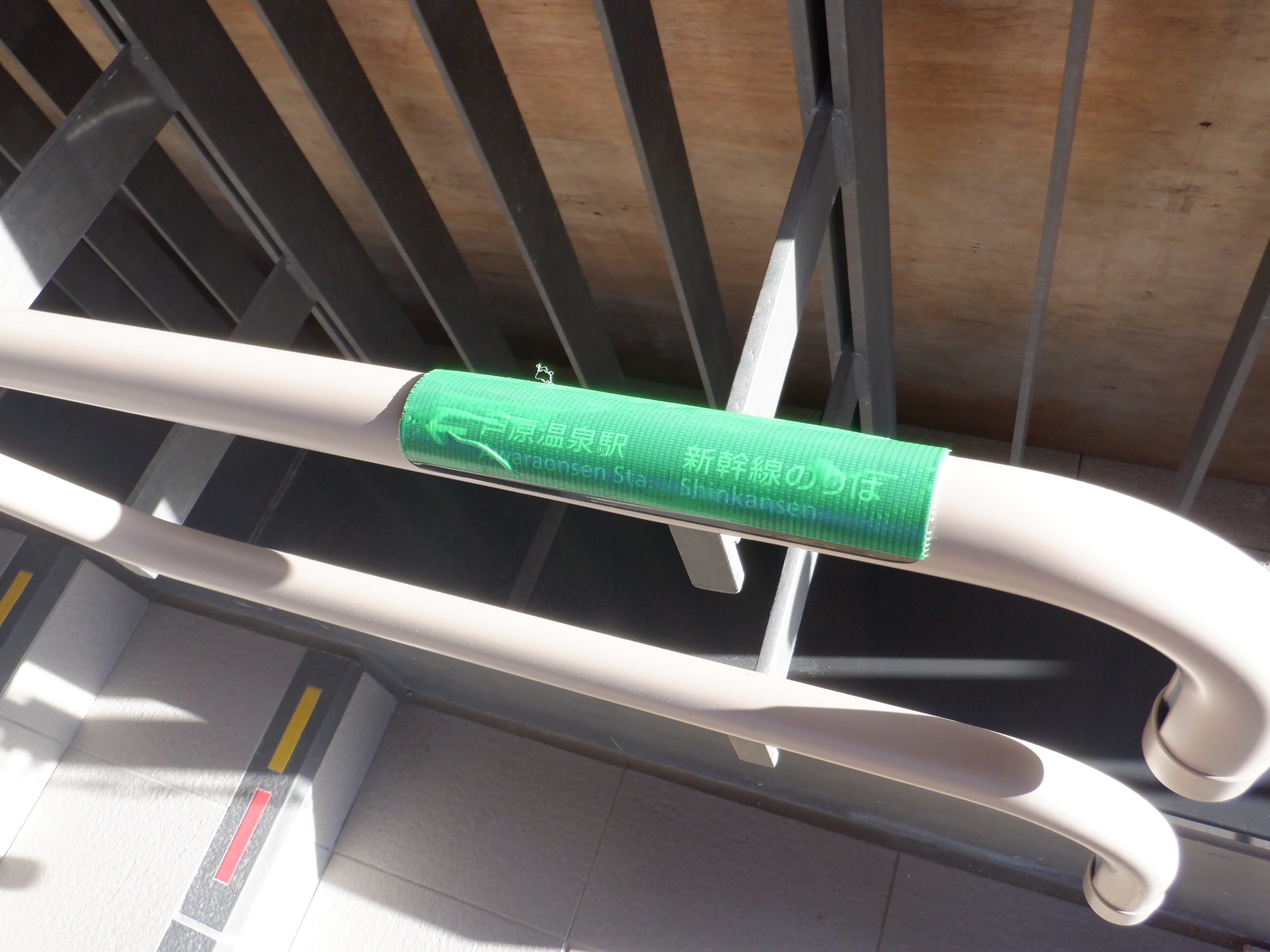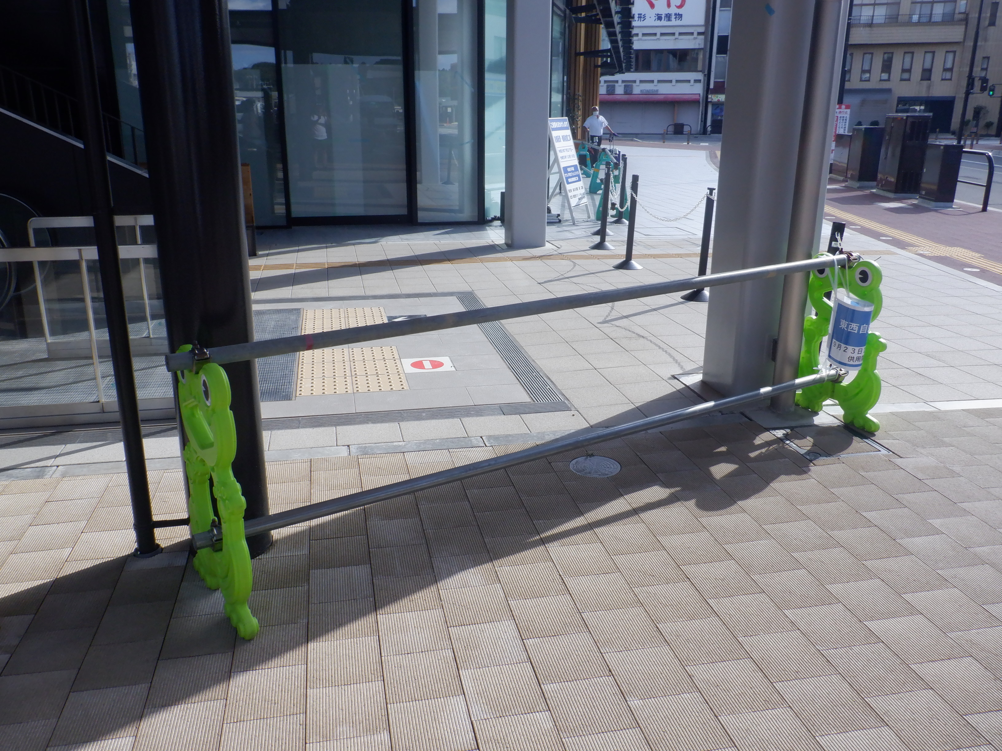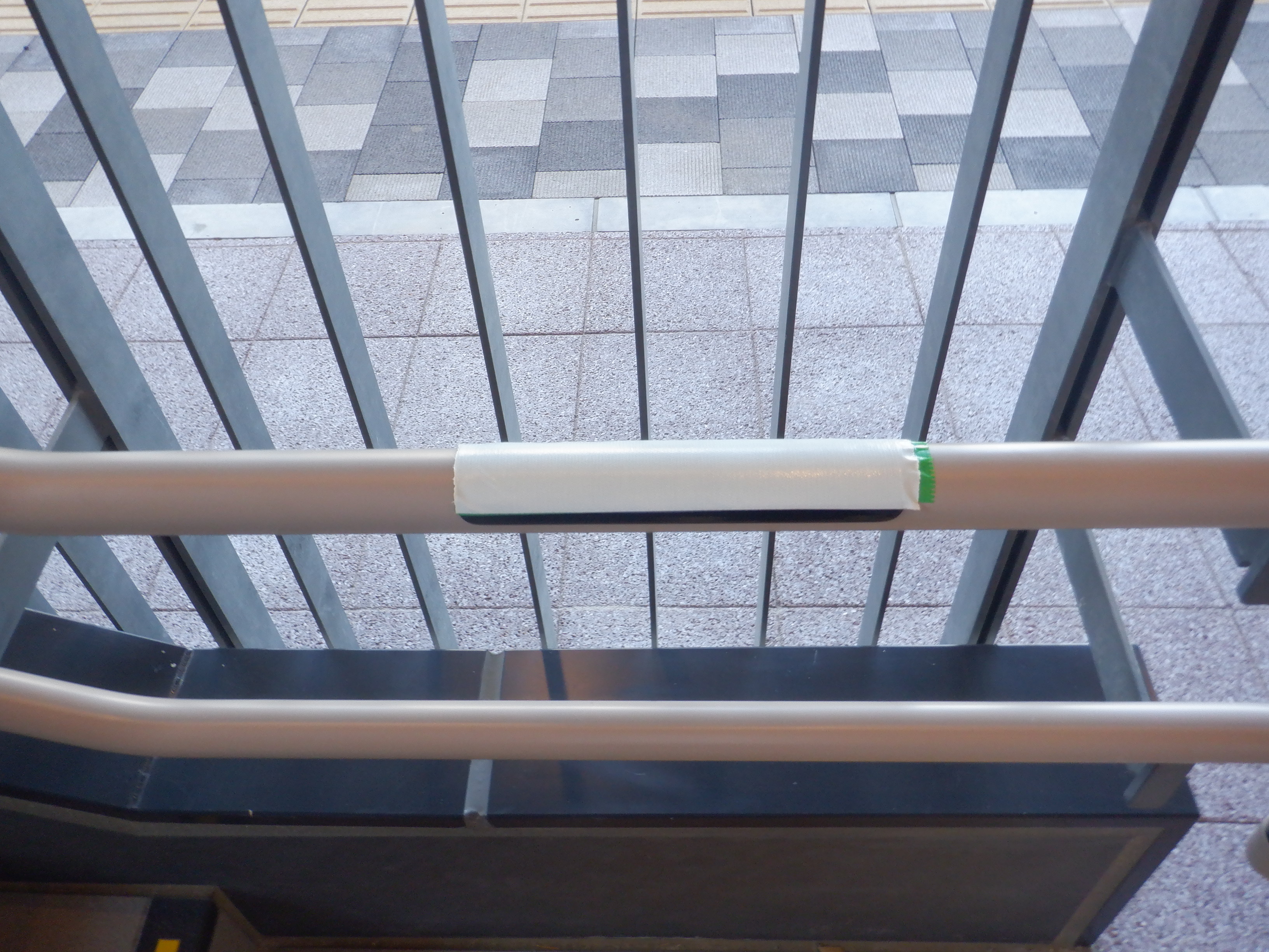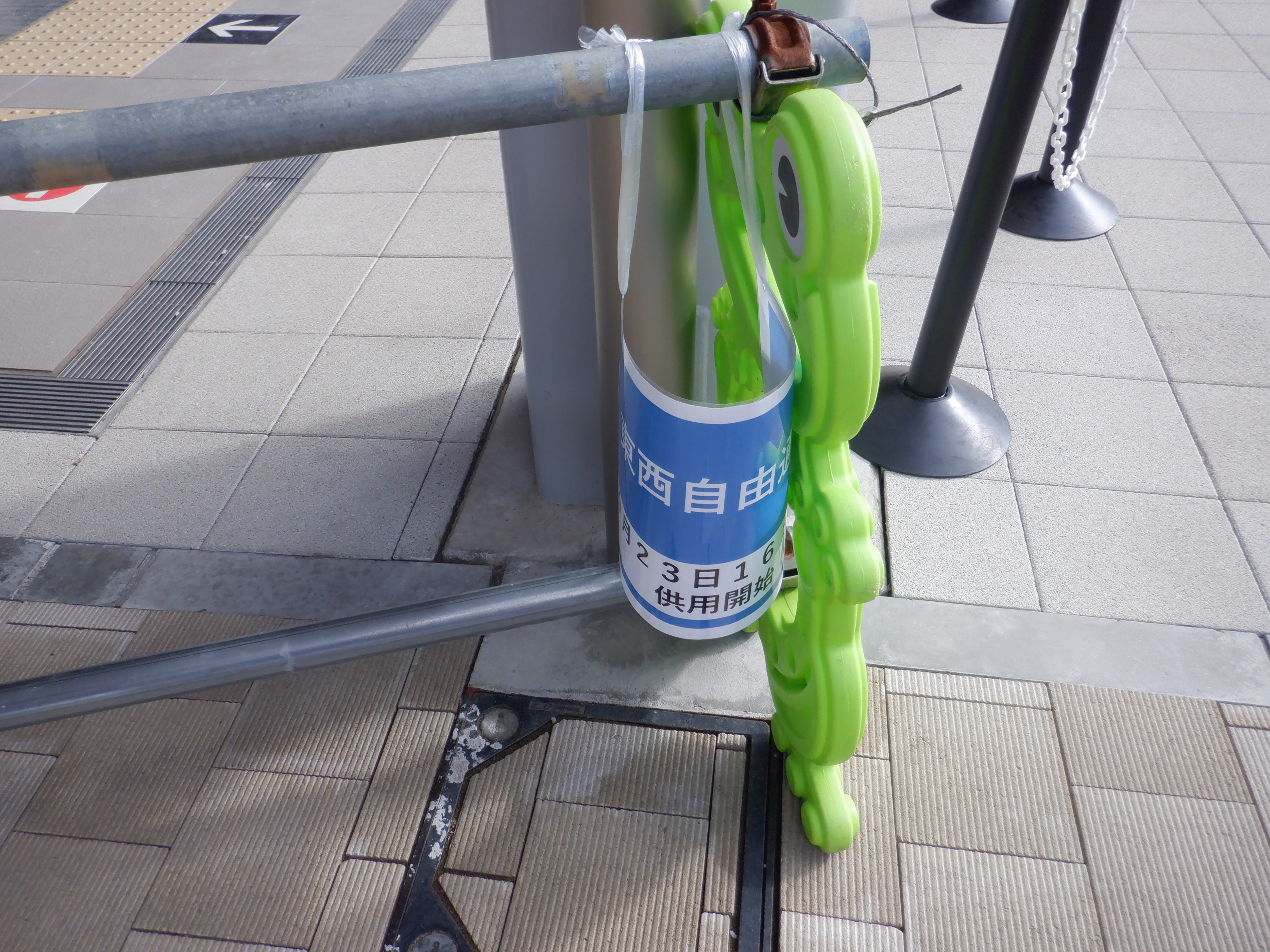 西口側の自由通路出入口の手すりの案内も隠されています。