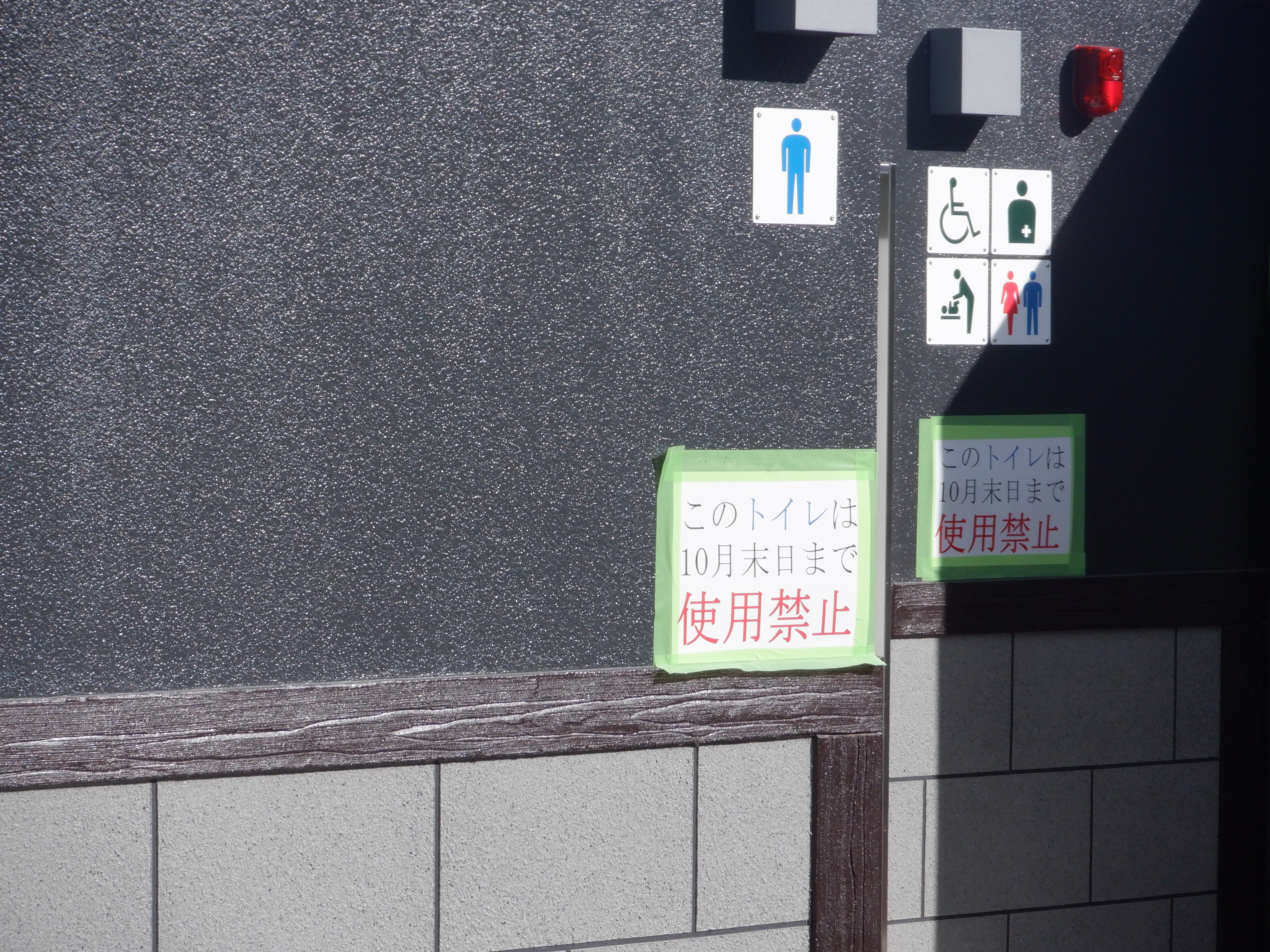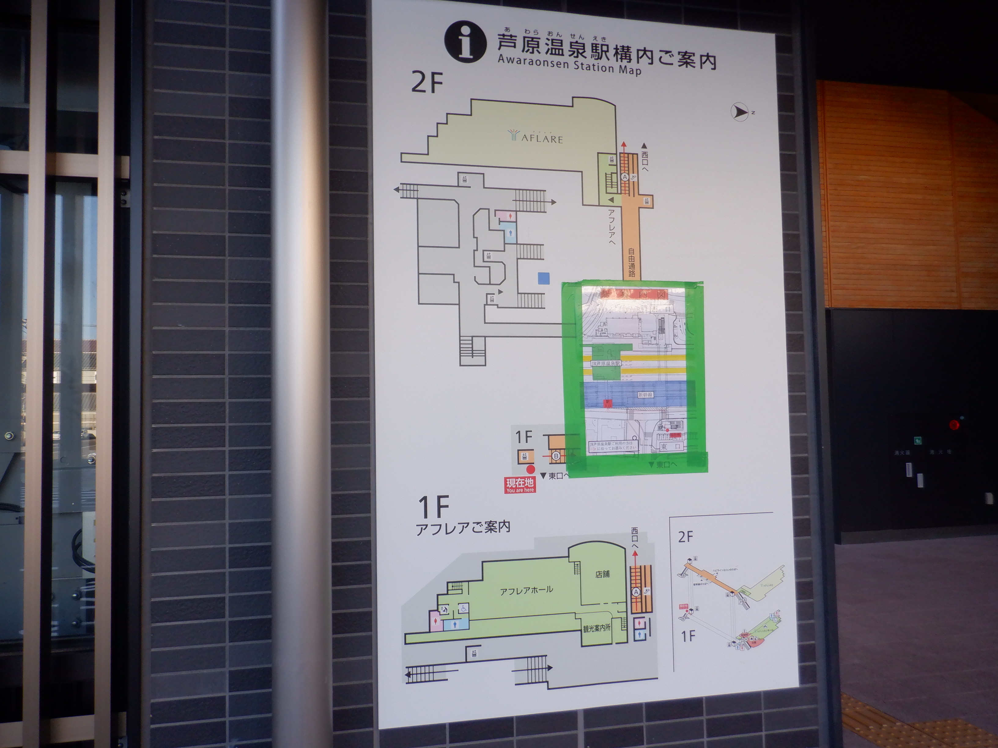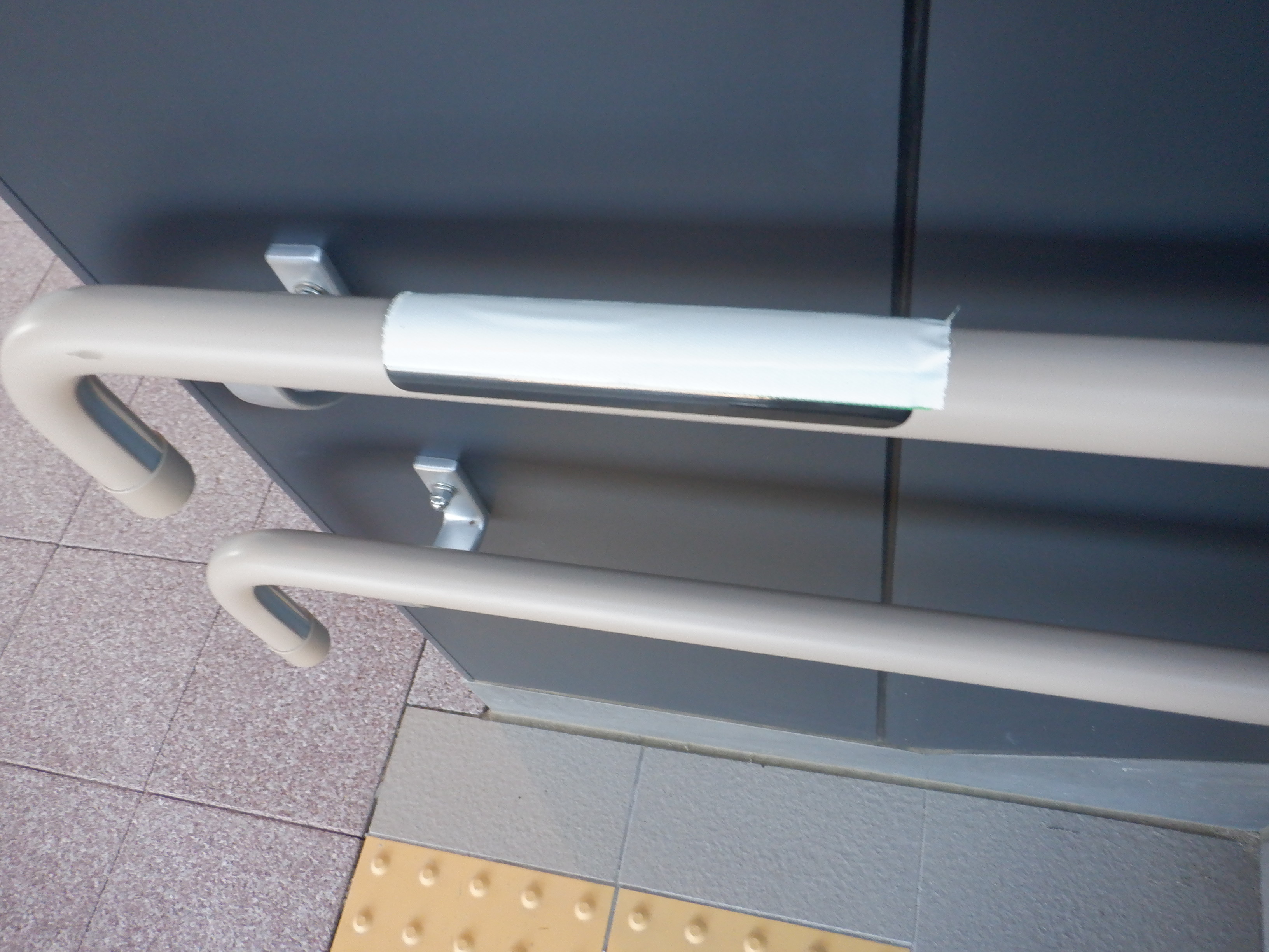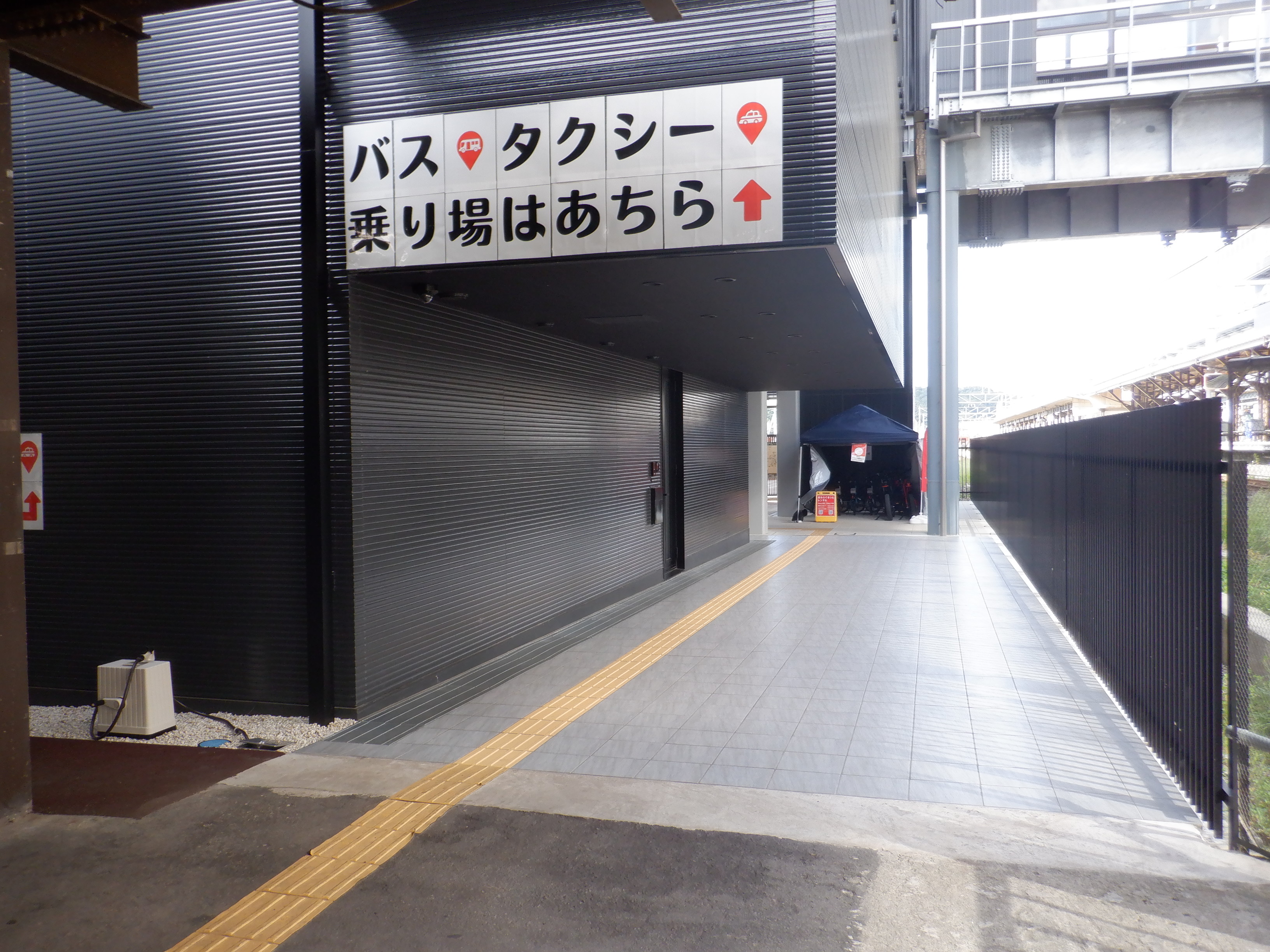 西口側の自由通路出入口の手すりの案内も隠されています。