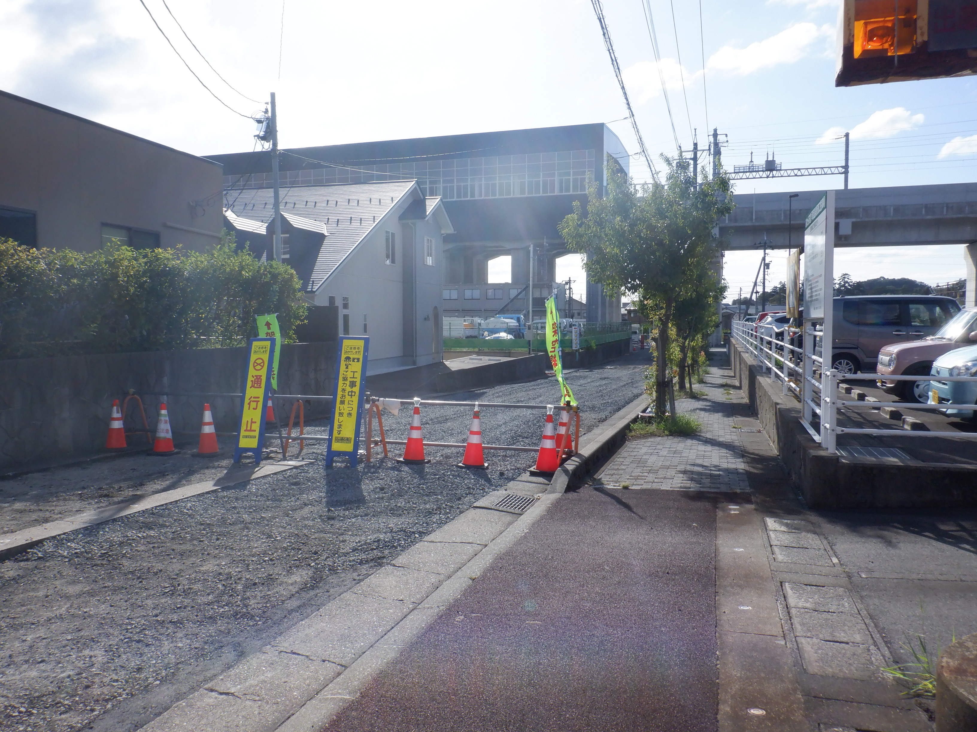 東口の細呂木駅側。毎回通る道であり、東口の駐車場との間の道が工事中です。