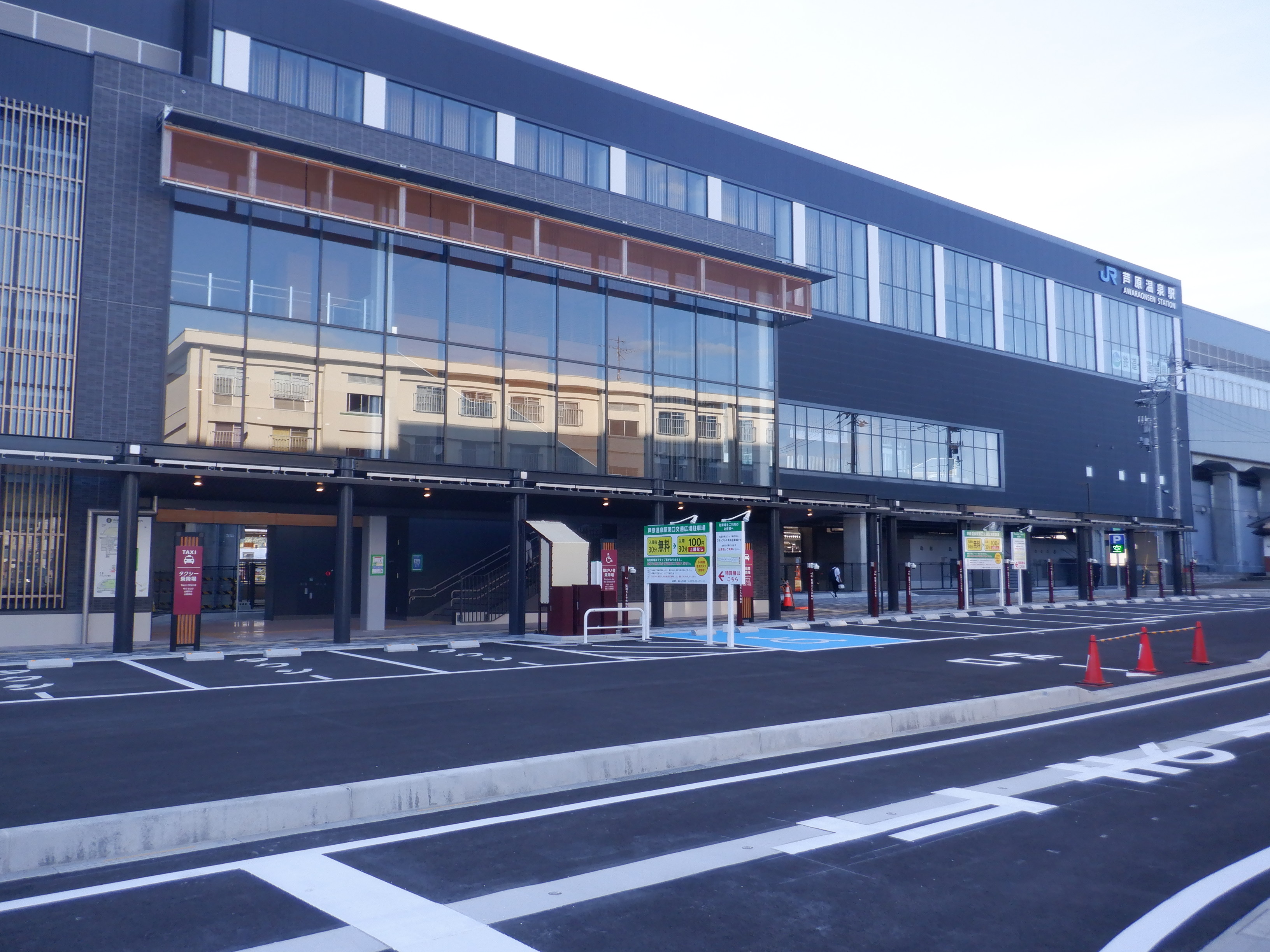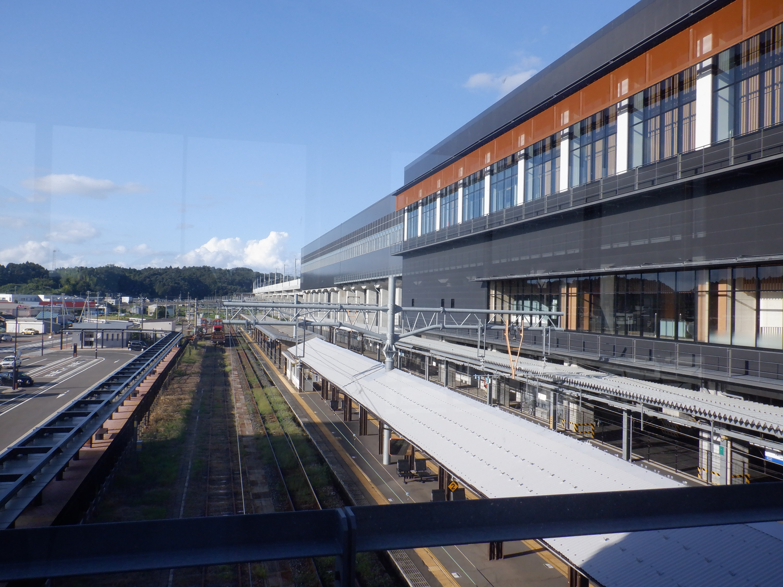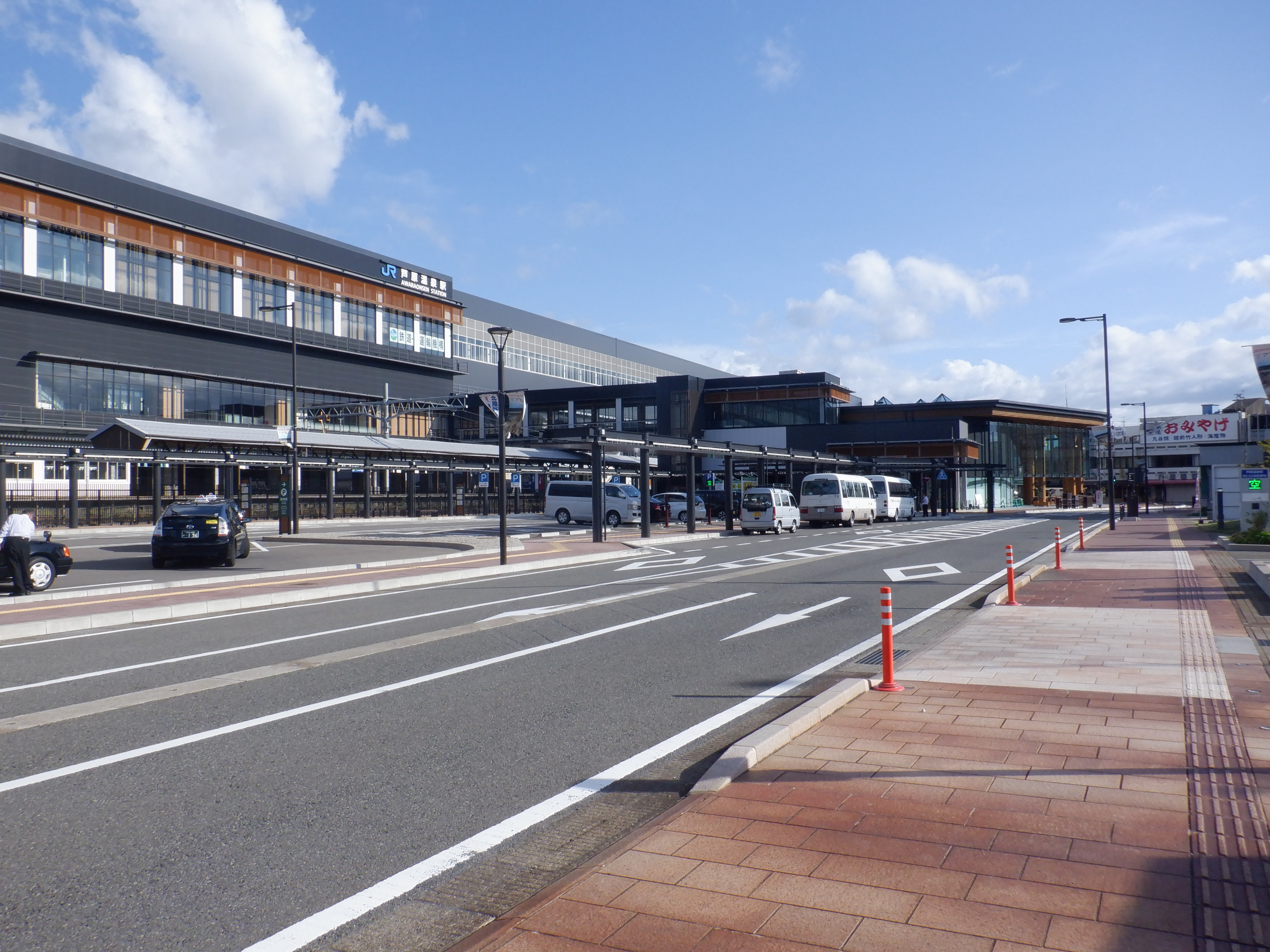 西口の新幹線駅舎と交通広場。