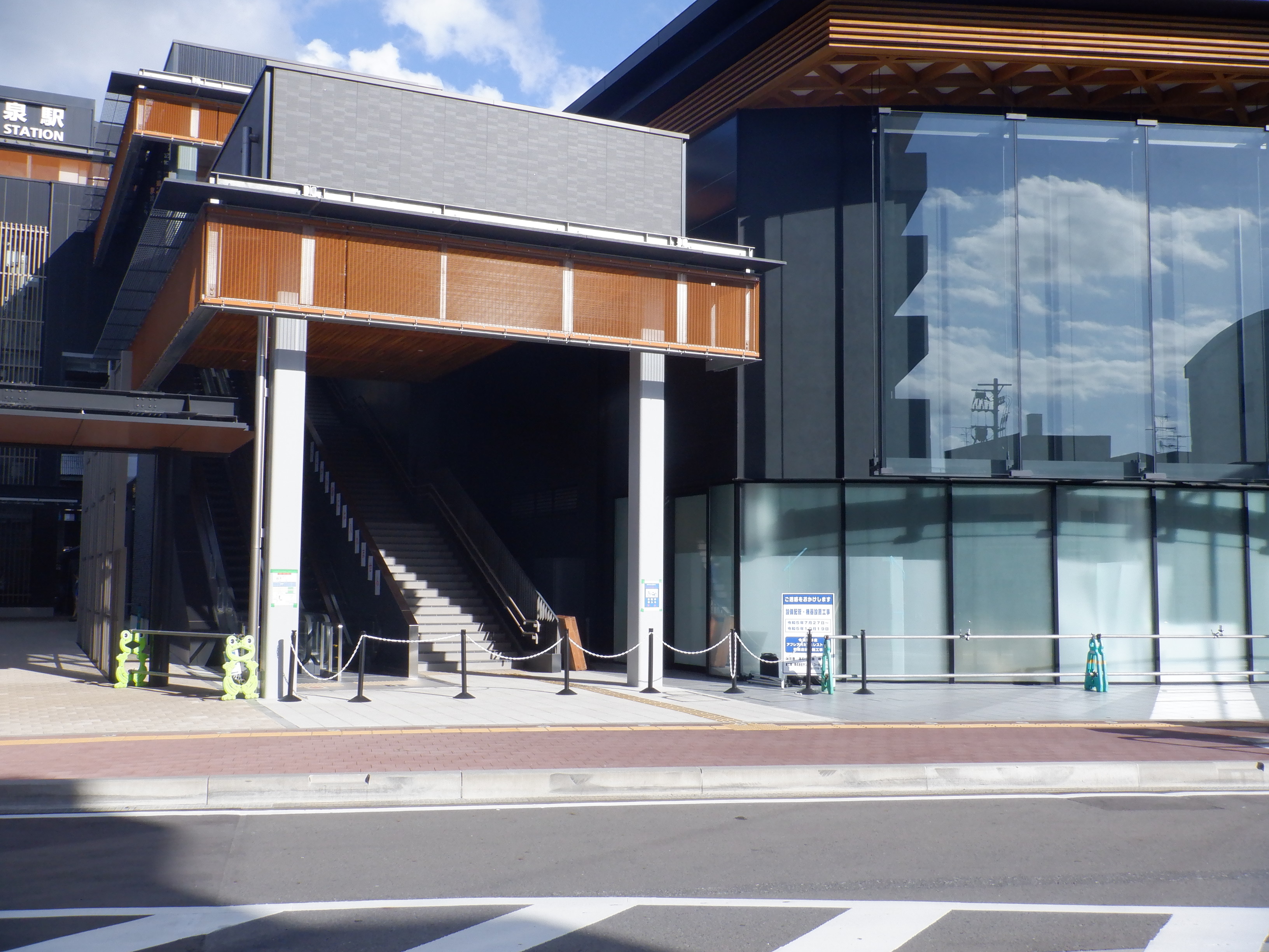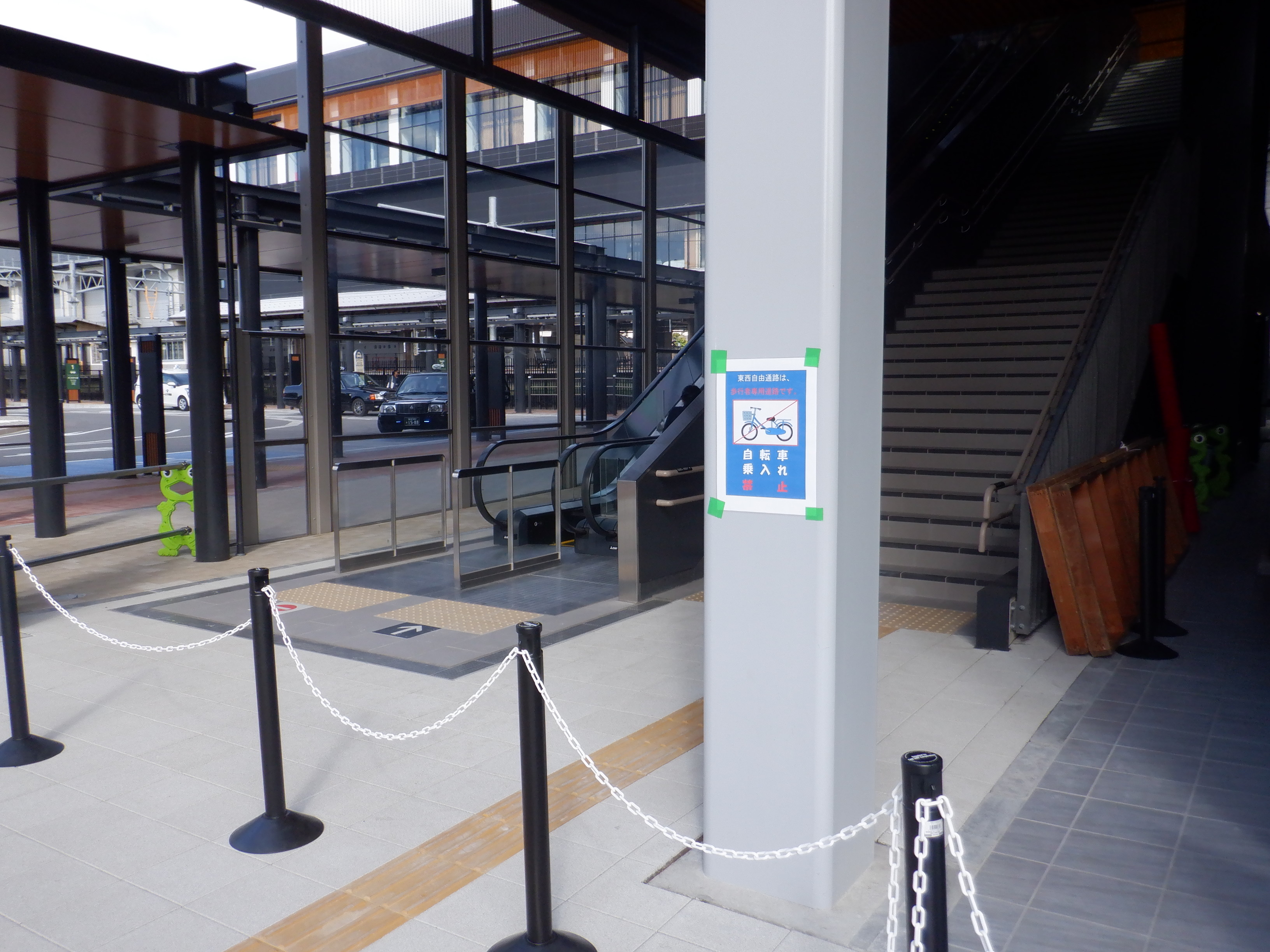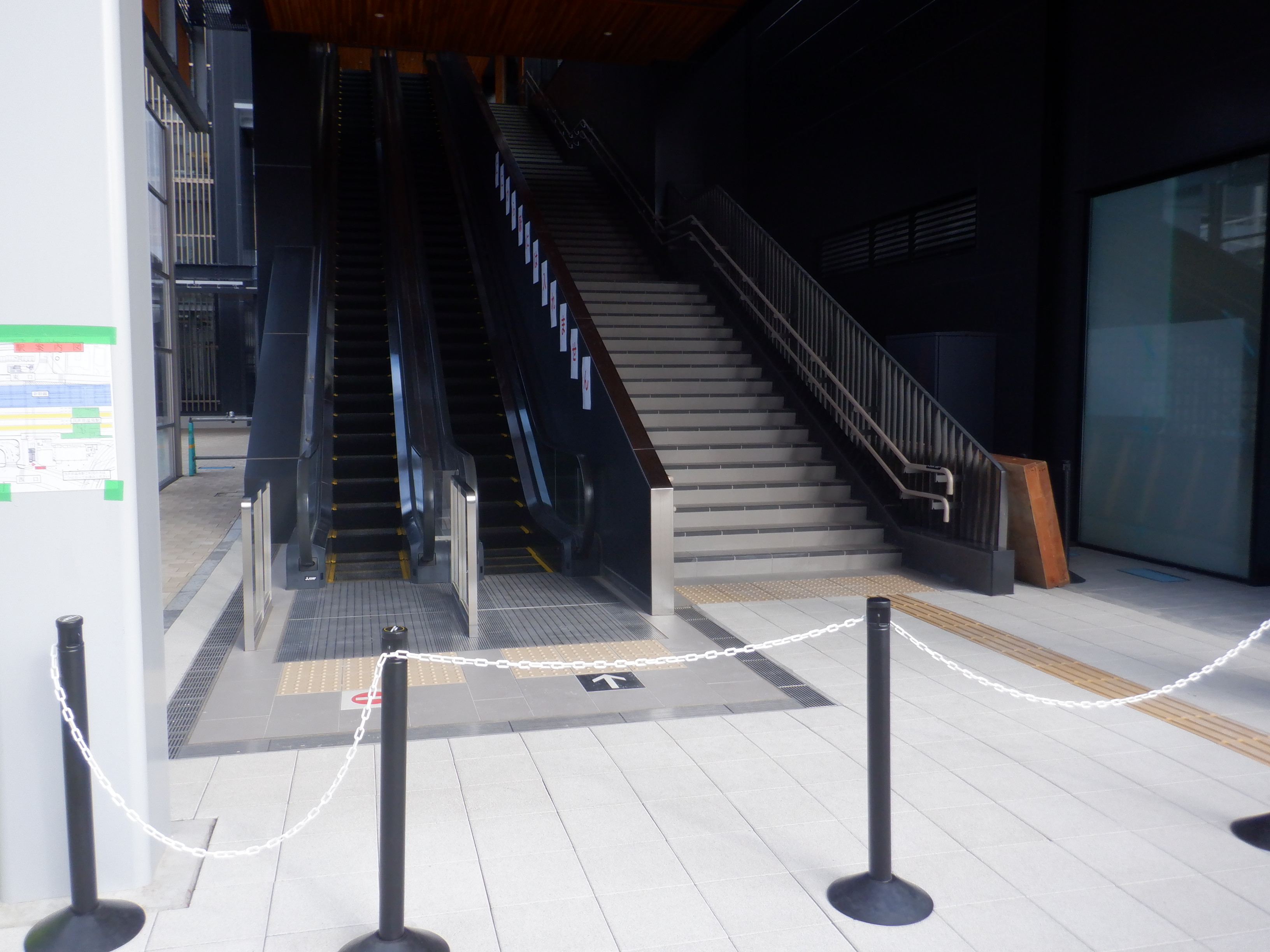 供用開始直前の自由通路出入口。駅に行けない旨の案内がエスカレーター横に貼られています。