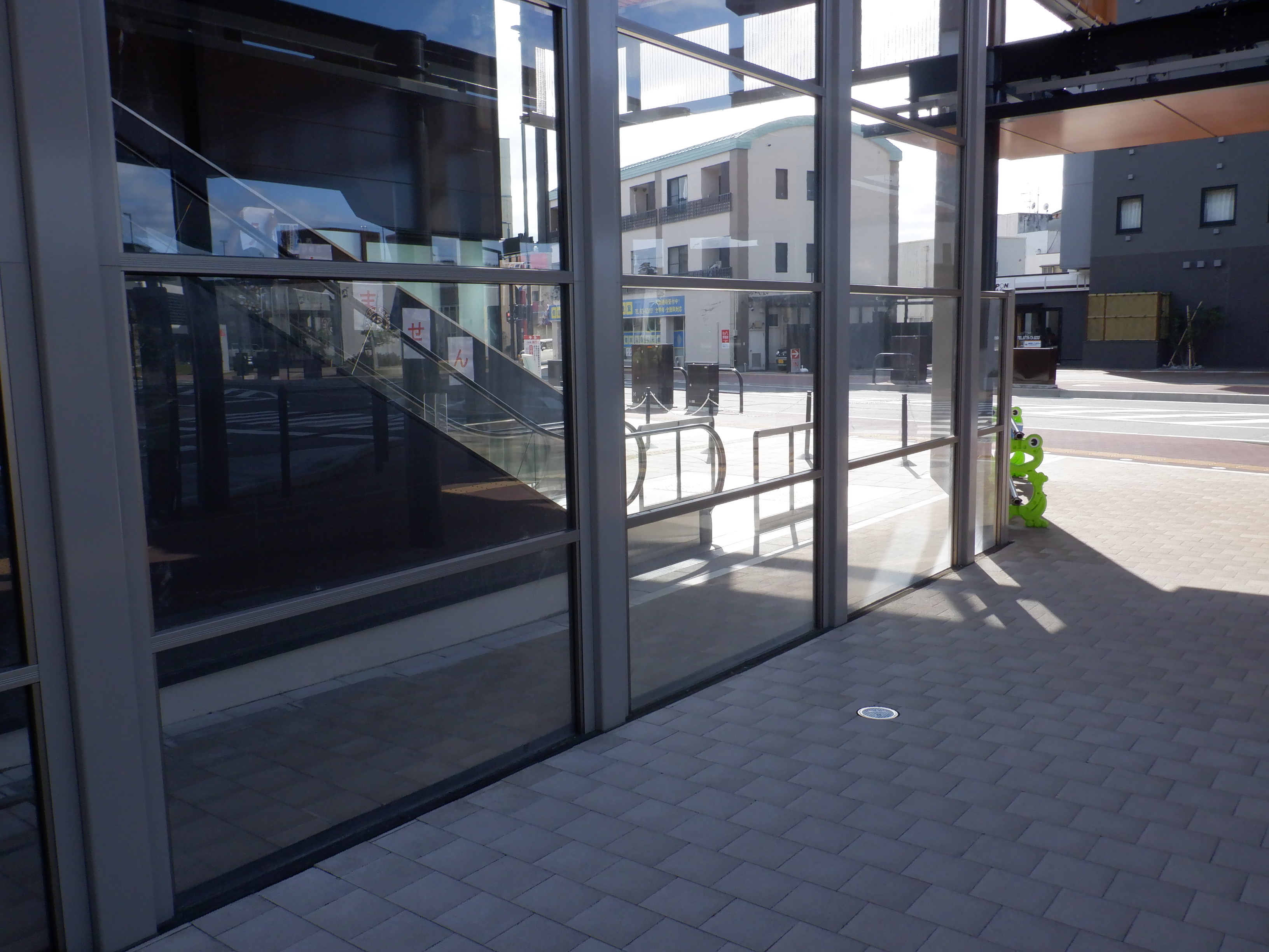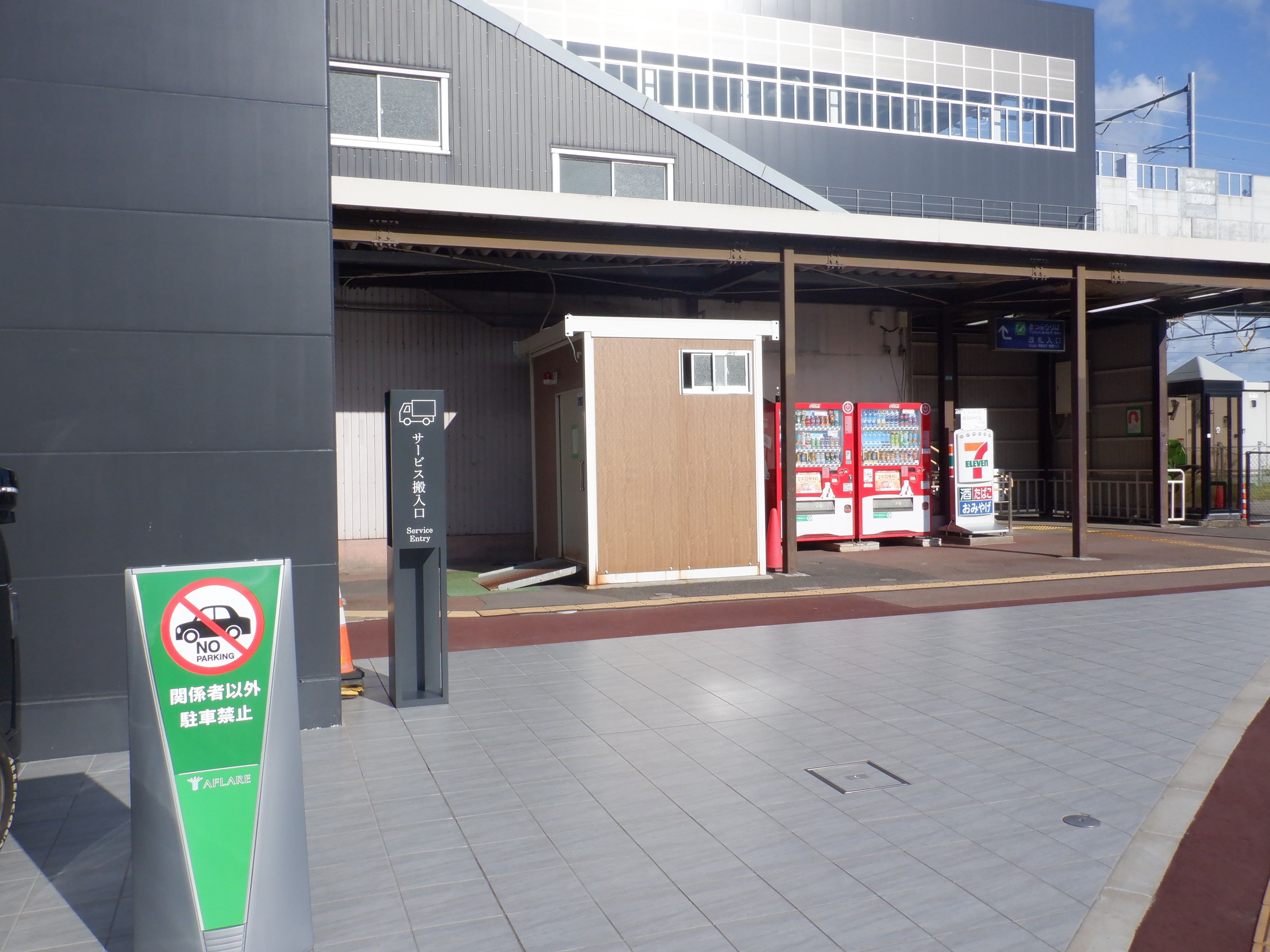 道路の反対側から自由通路の出入口とアフレア。