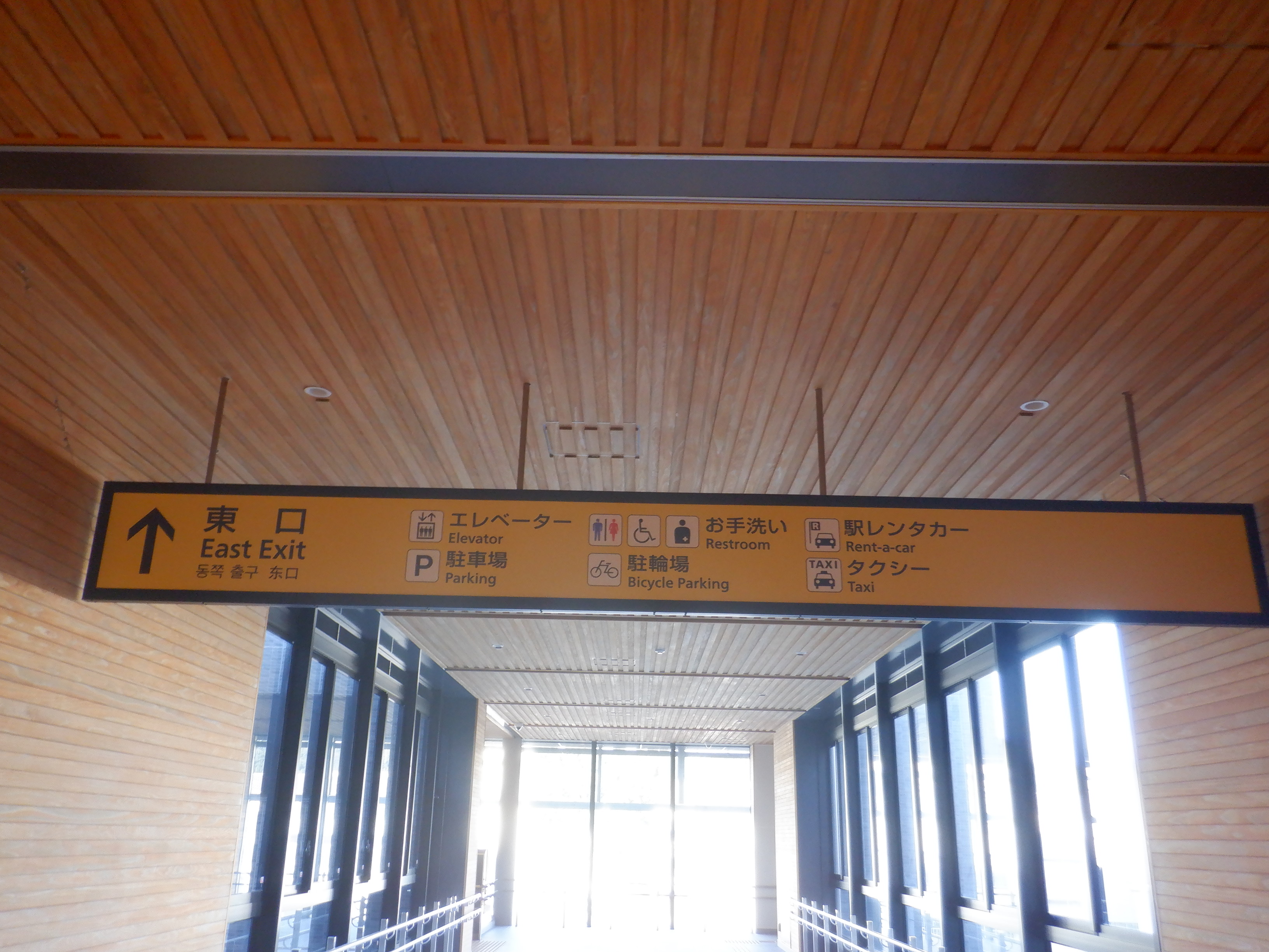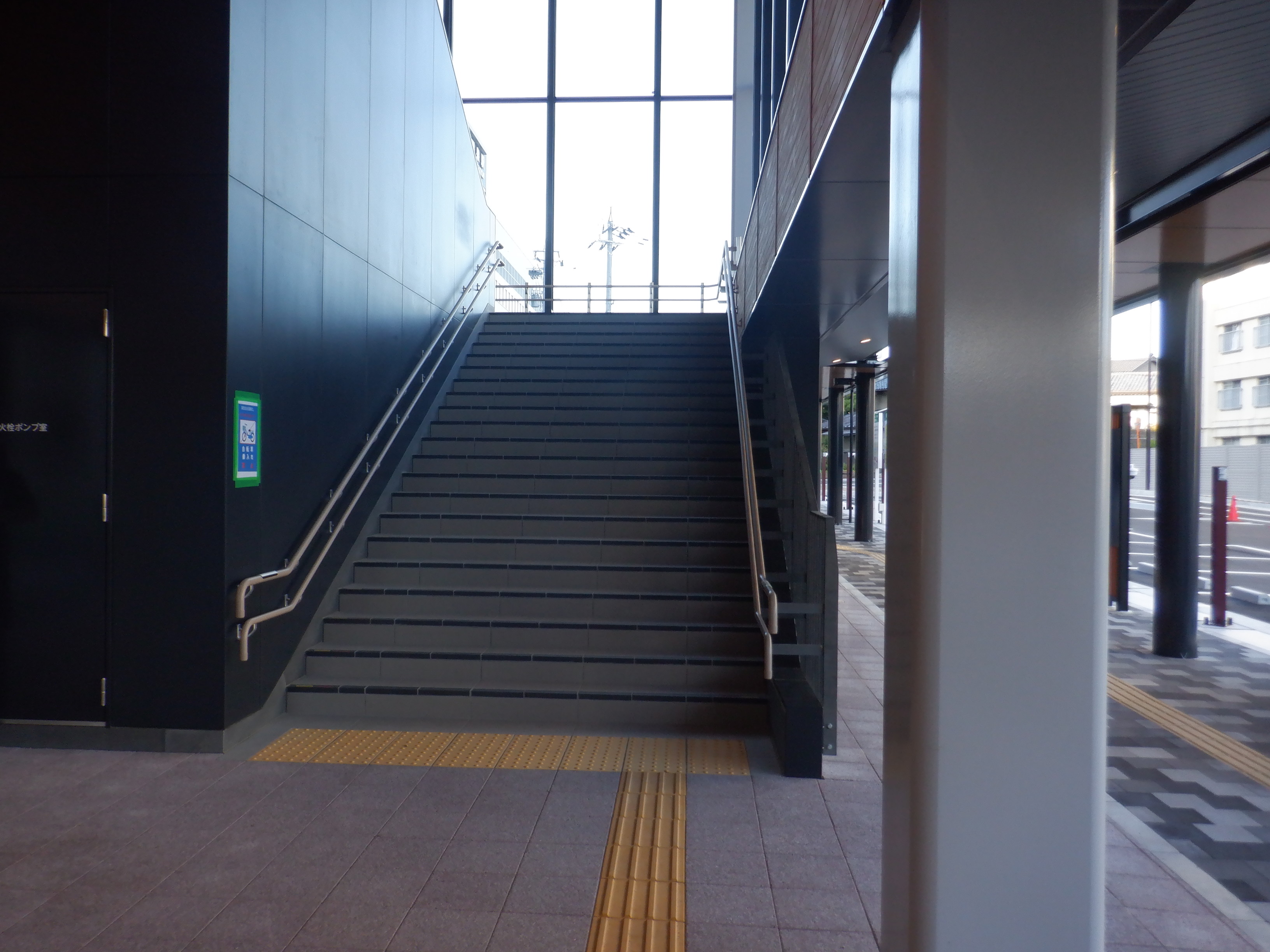 東口側の自由通路出入口の手すりの案内は隠されています。