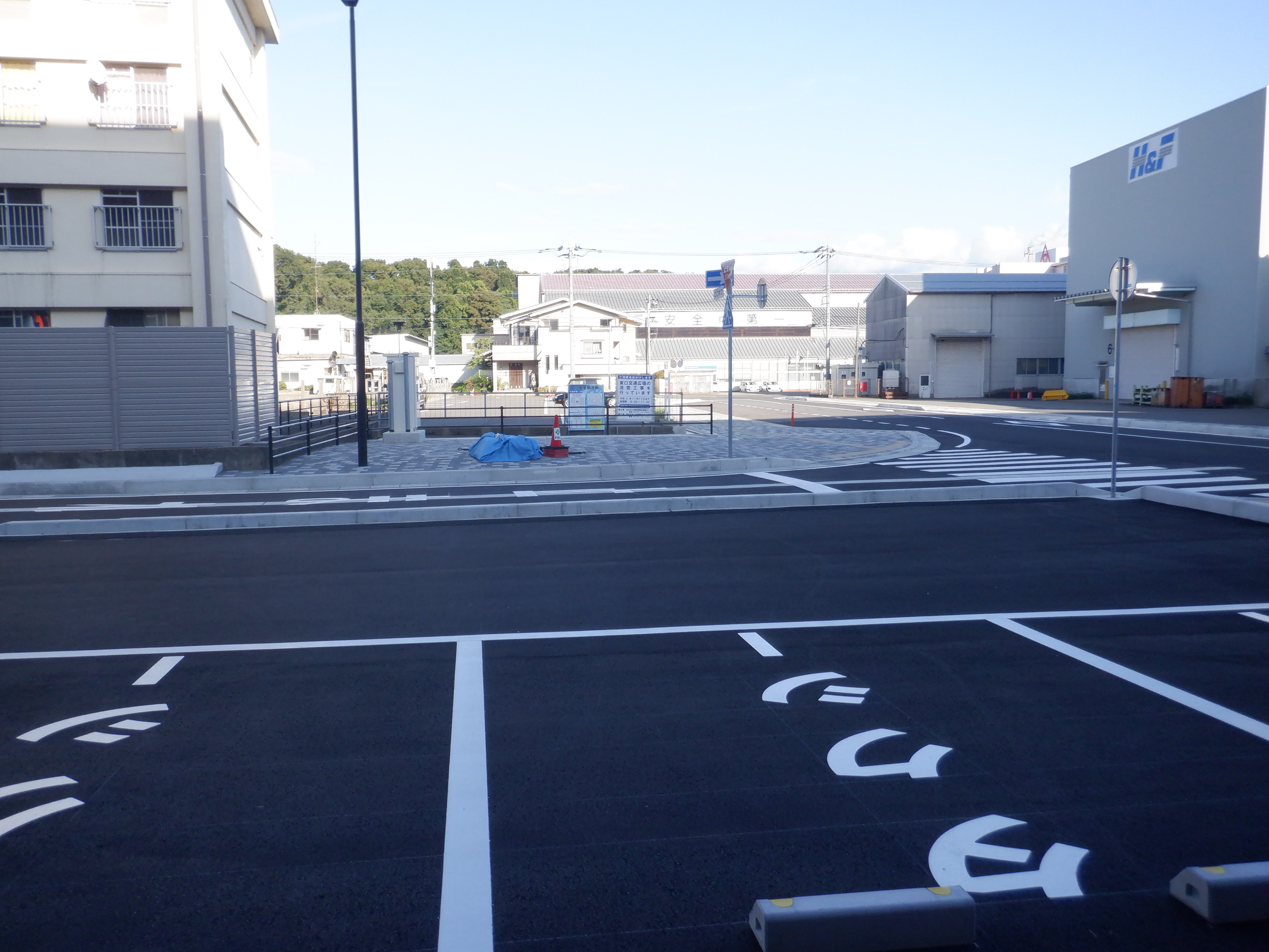 東口に出たところ。歩道となる部分が緑色に塗装されました。