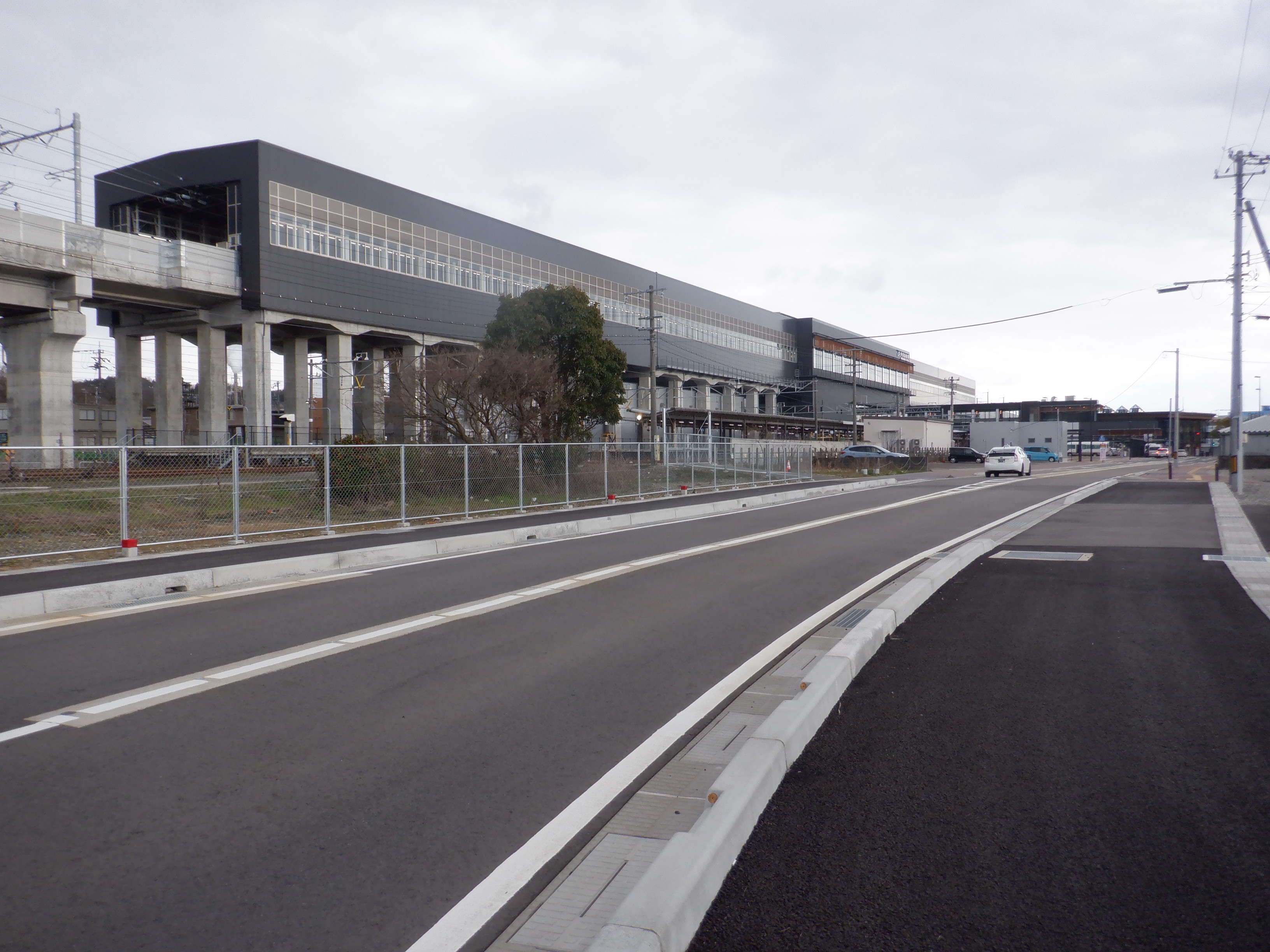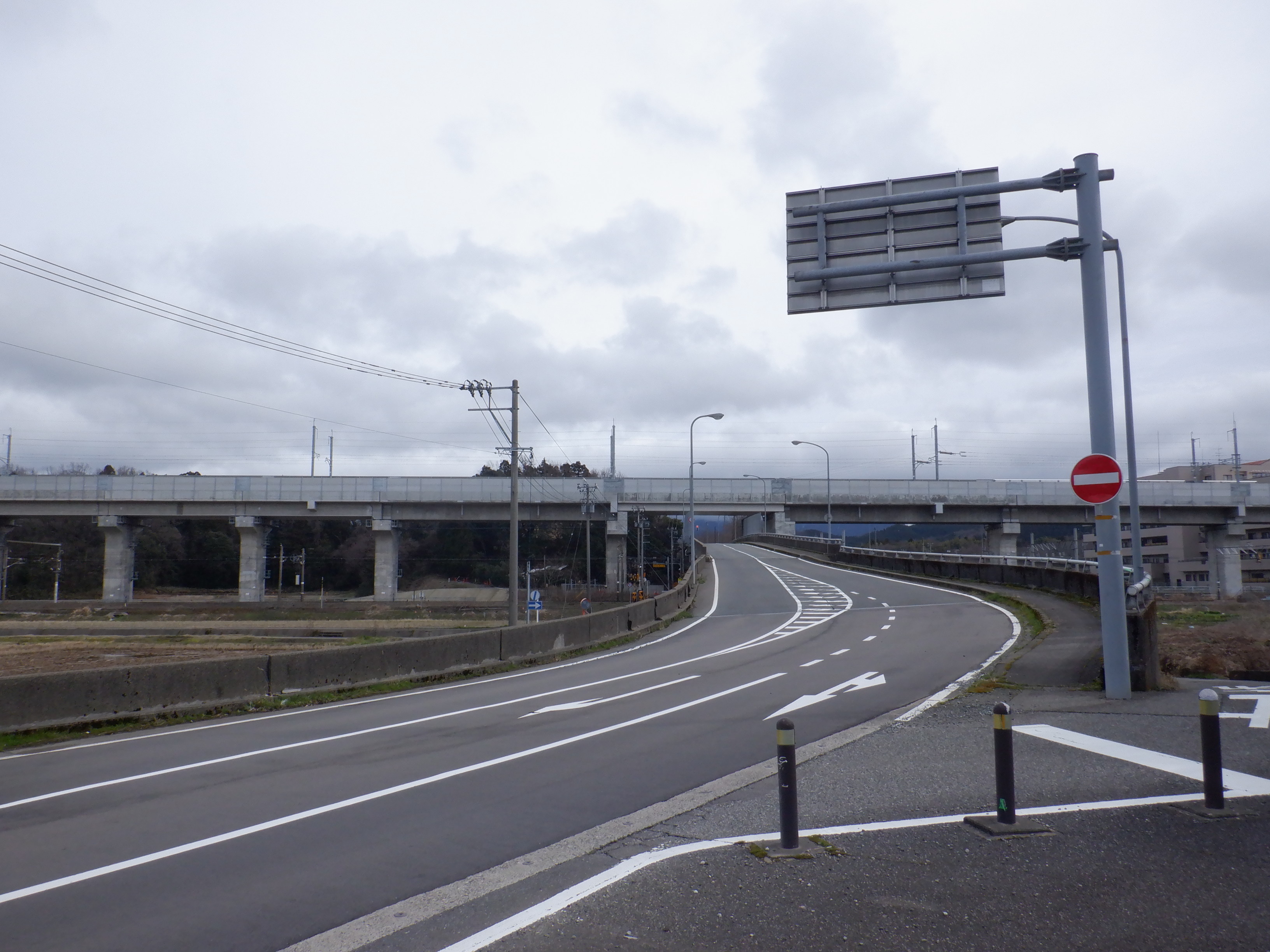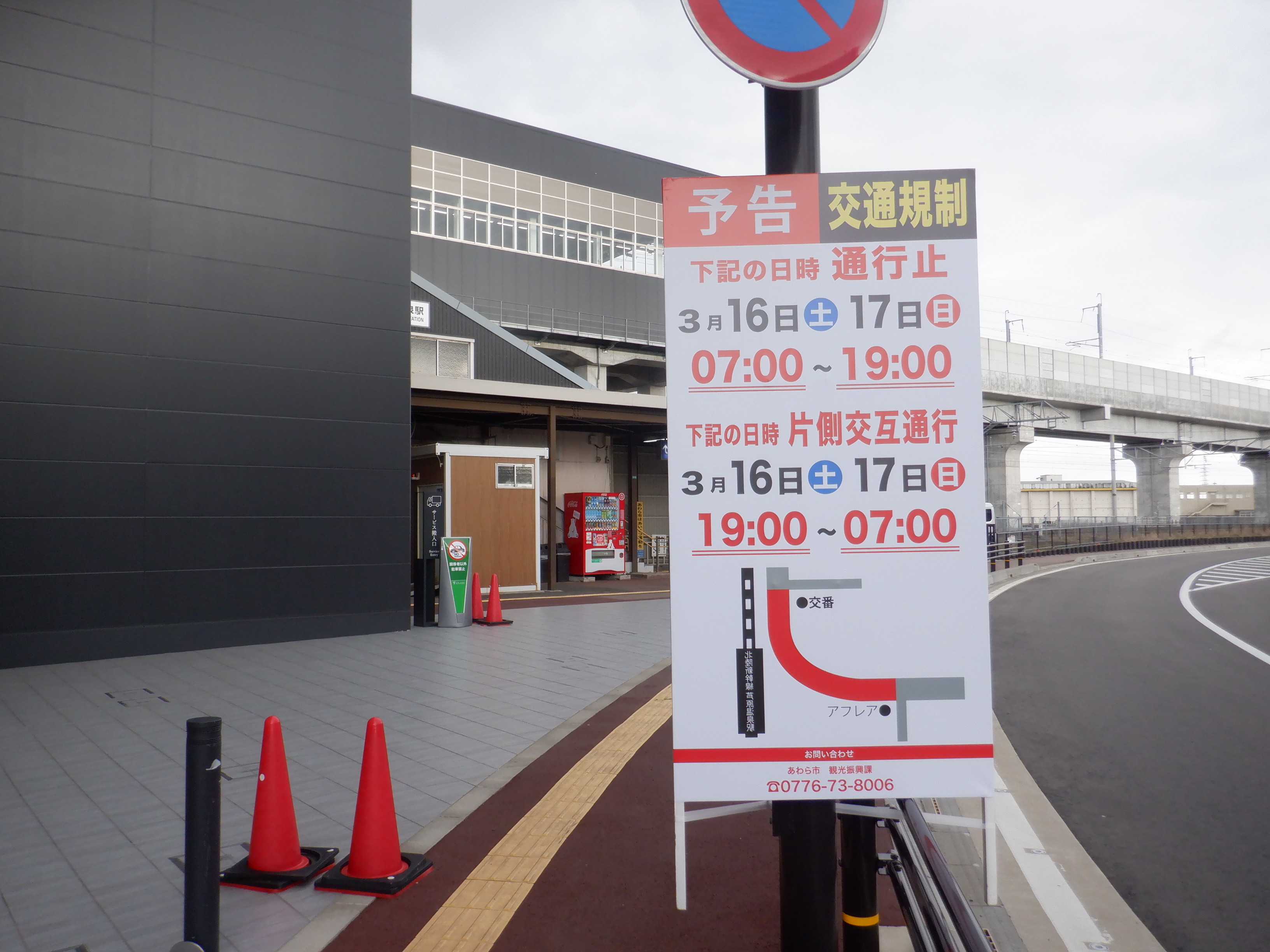 新しい道の出入口のスーパーの前。新幹線開業日の交通規制が予告されていました。