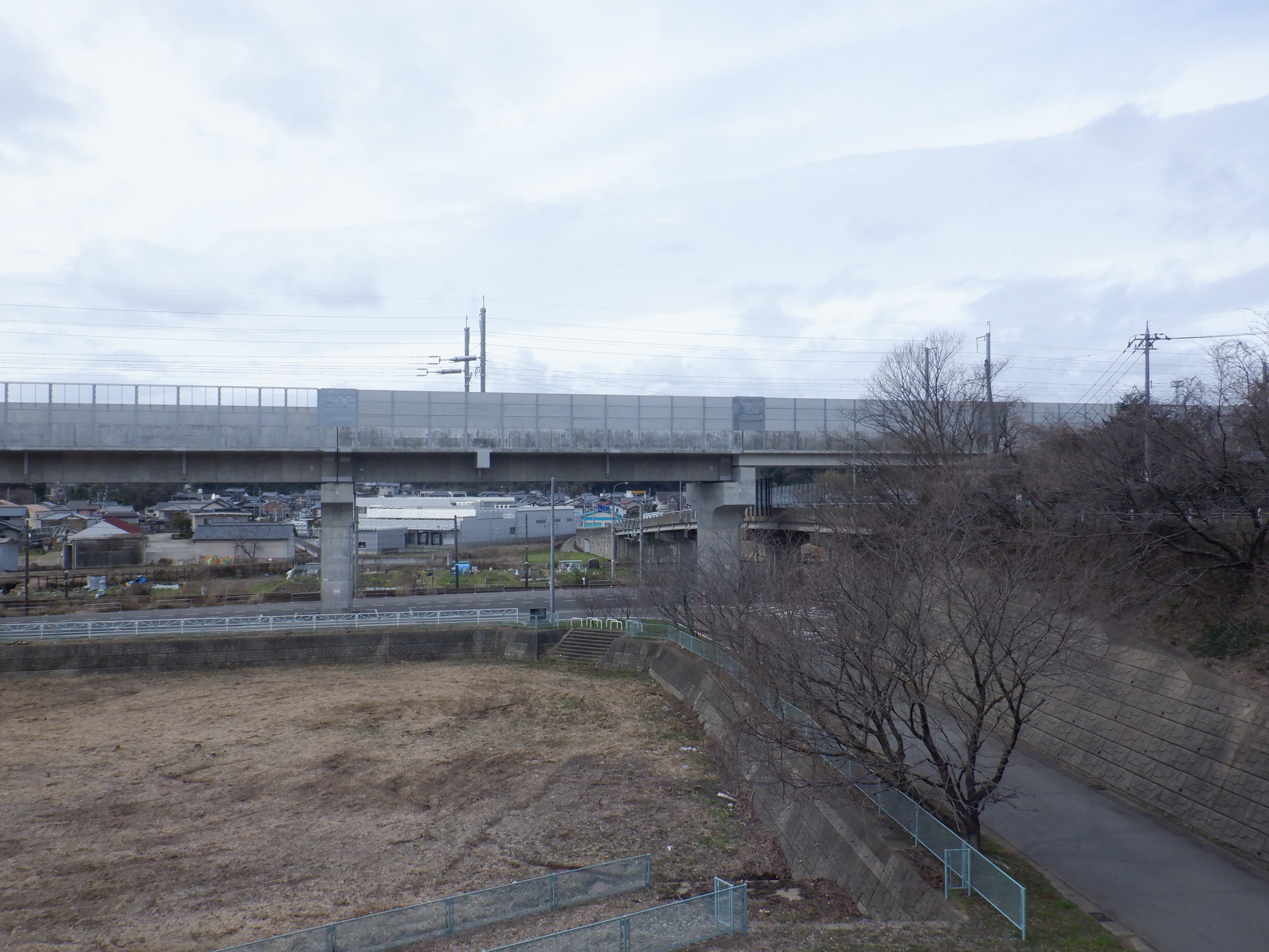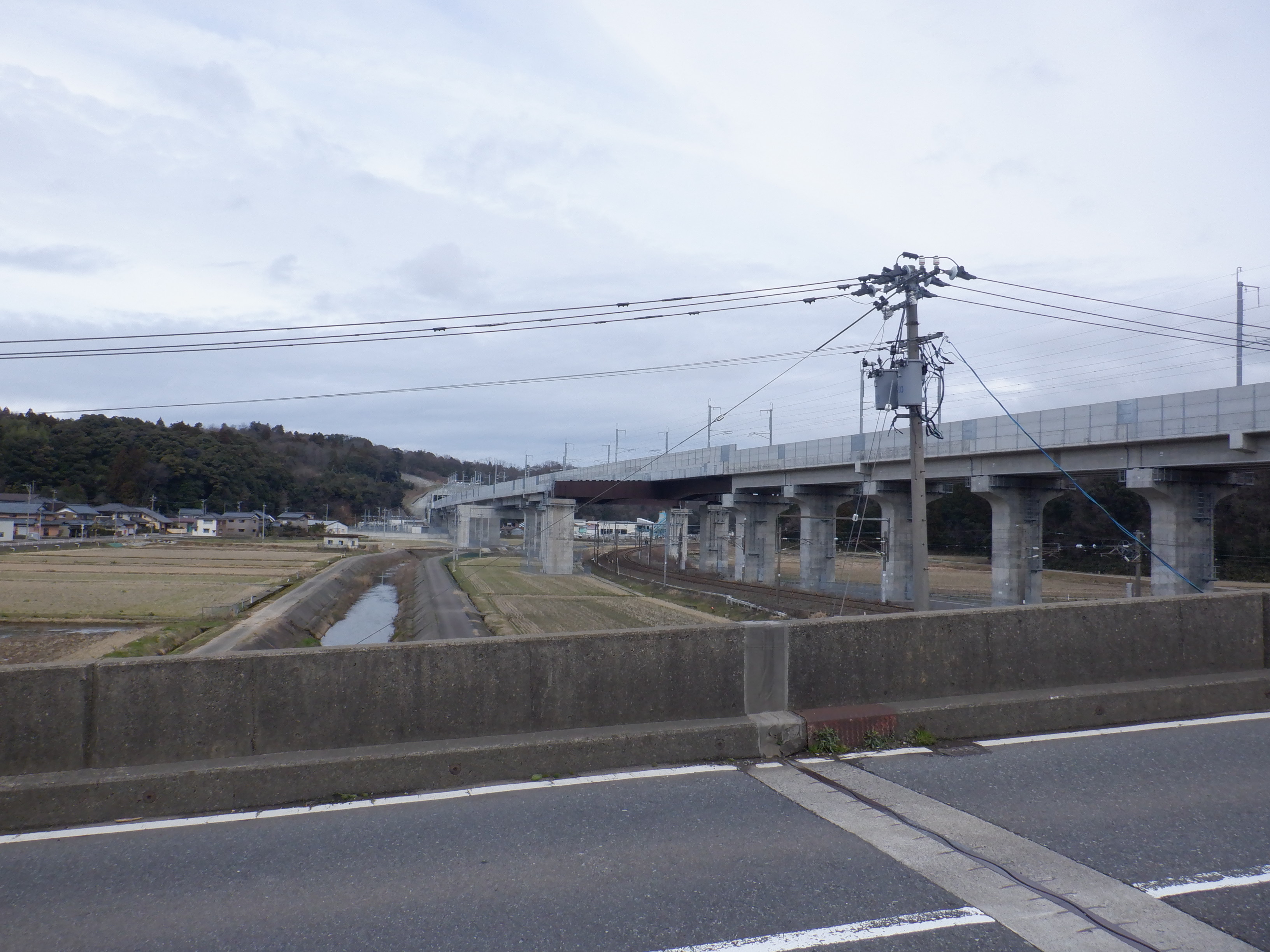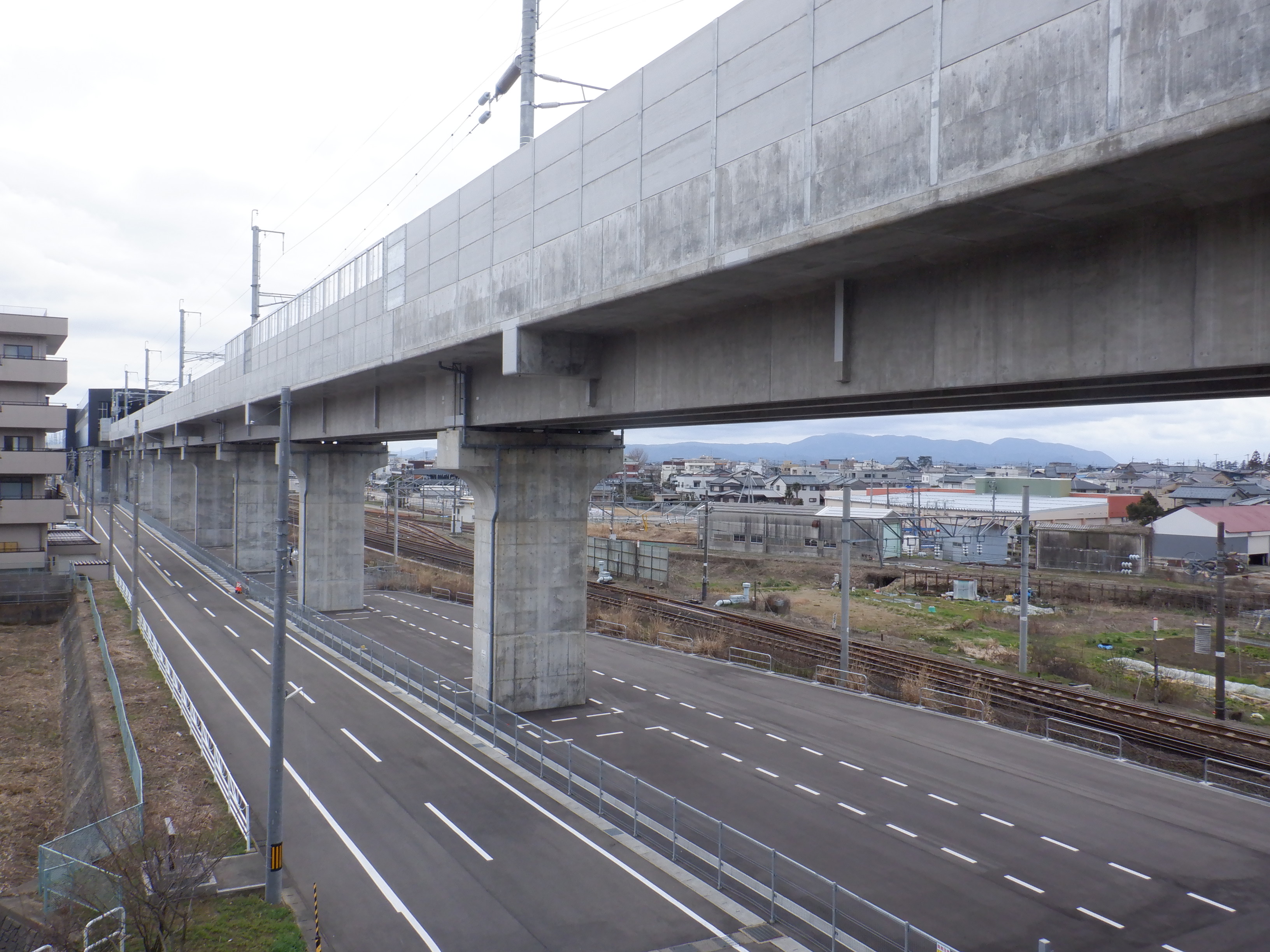 新しい道の出入口のスーパーの前。新幹線開業日の交通規制が予告されていました。