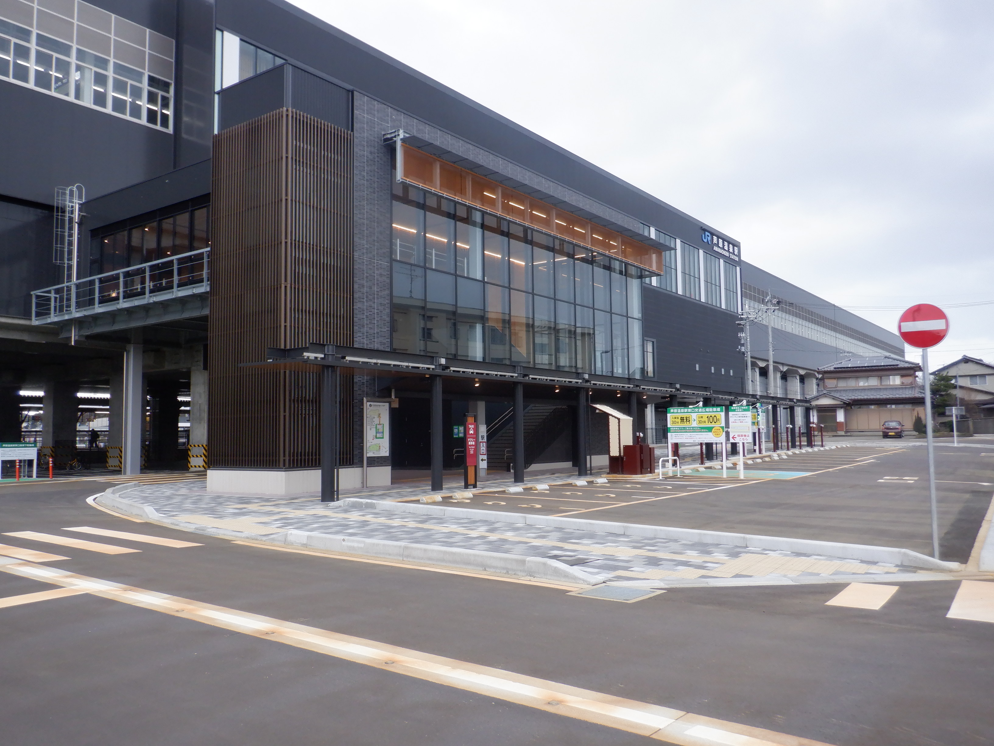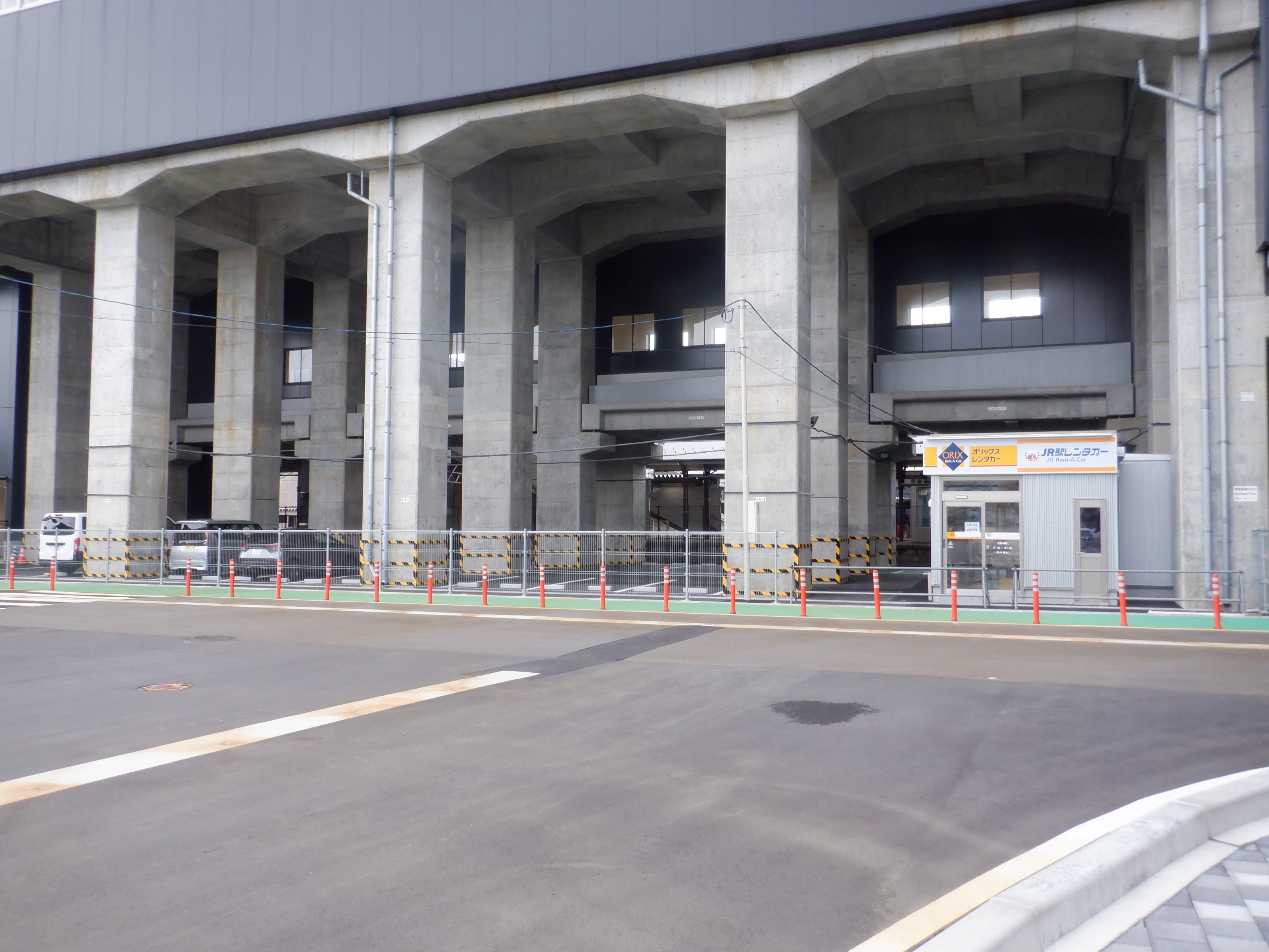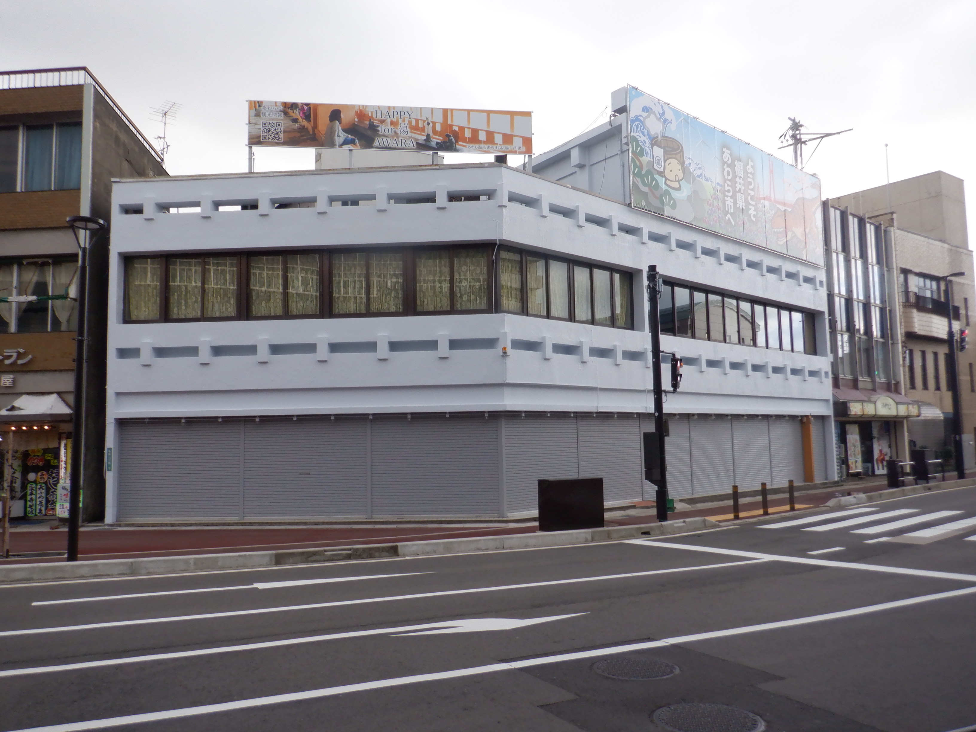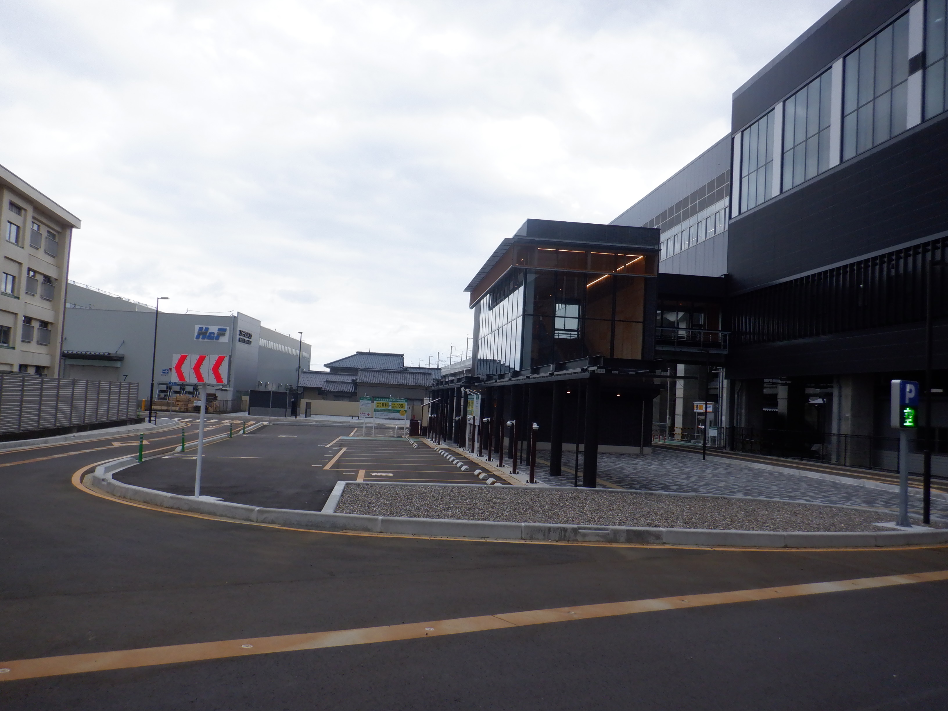 囲いがされていた駅前の飲食店だったところ。新幹線開業を前に閉店し、表を整備して誤解を与えない形になったようです。