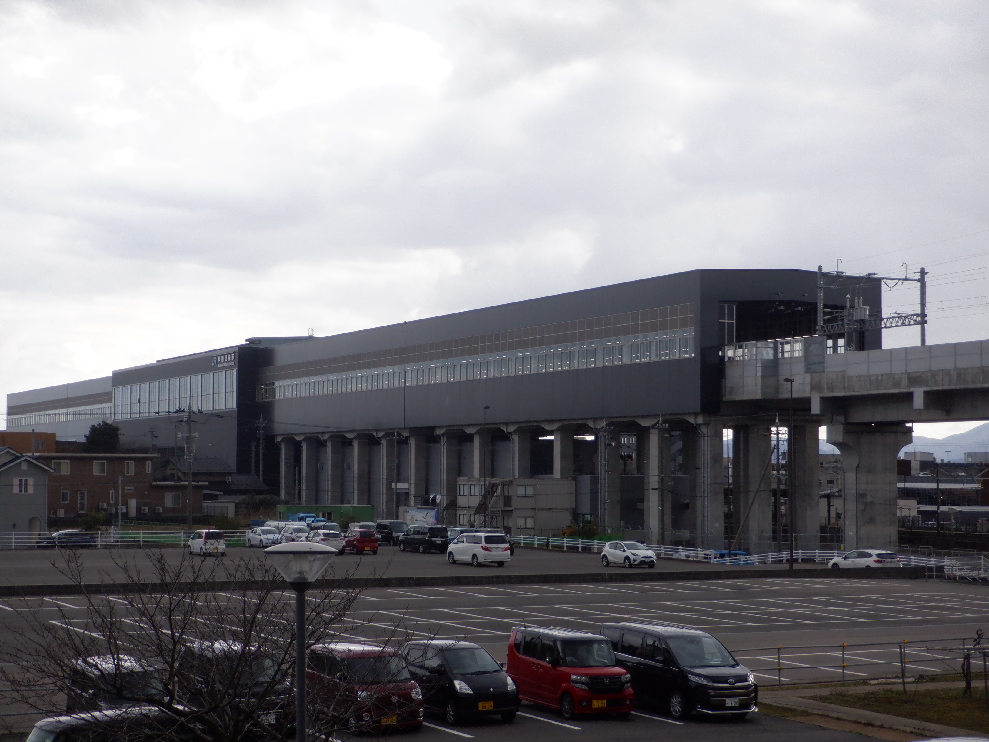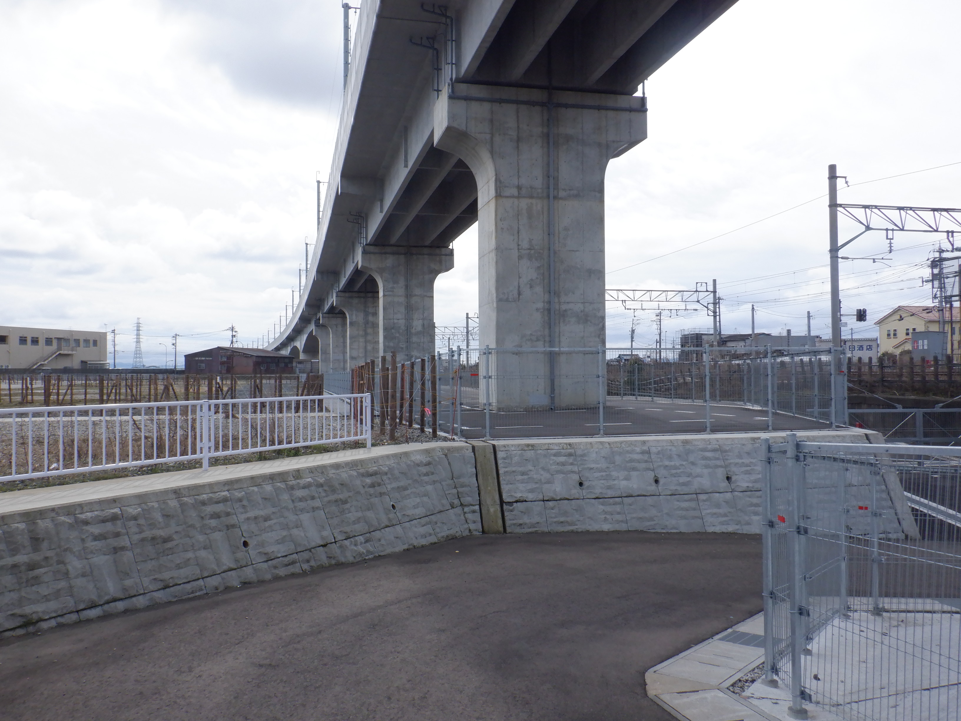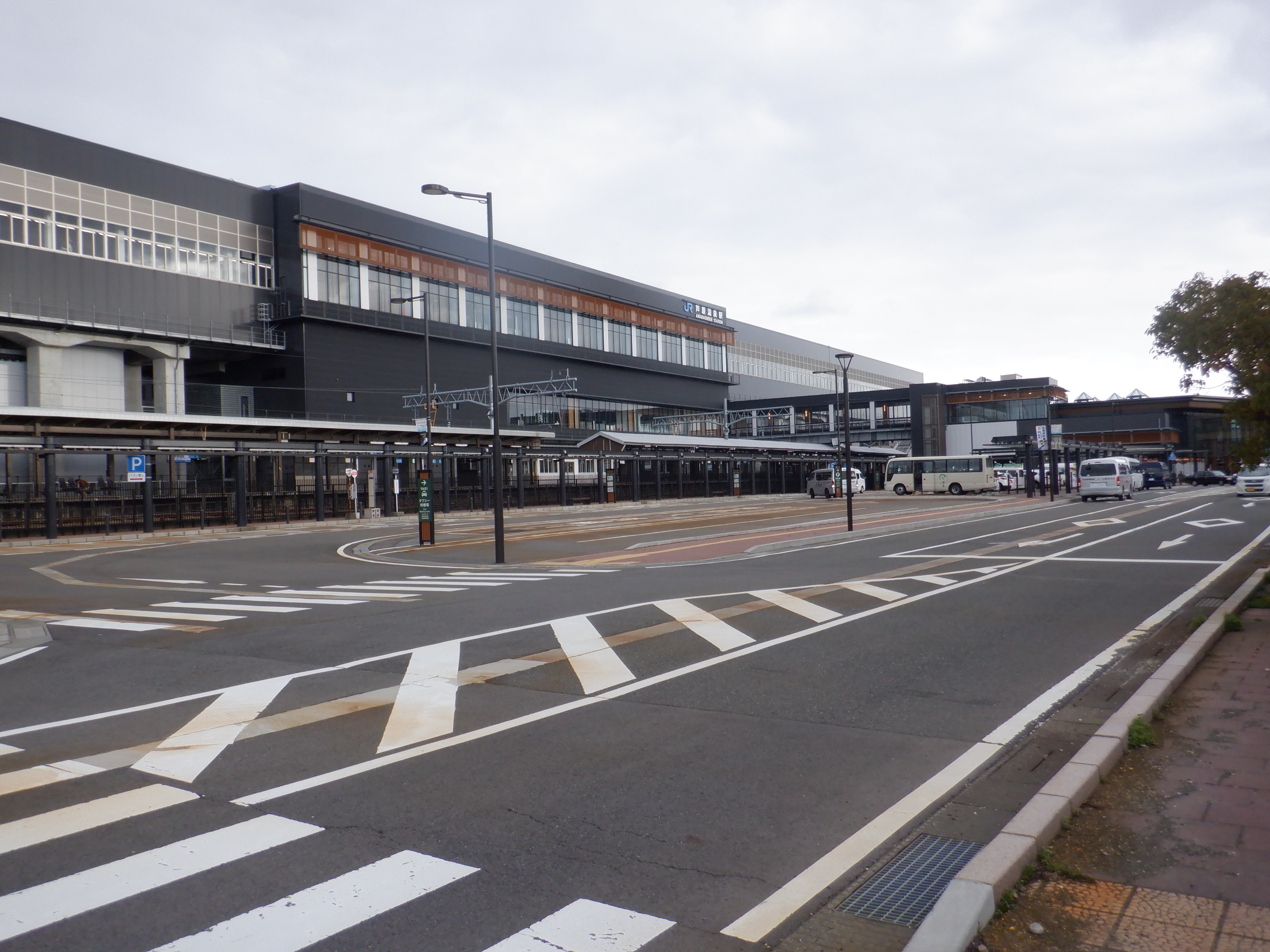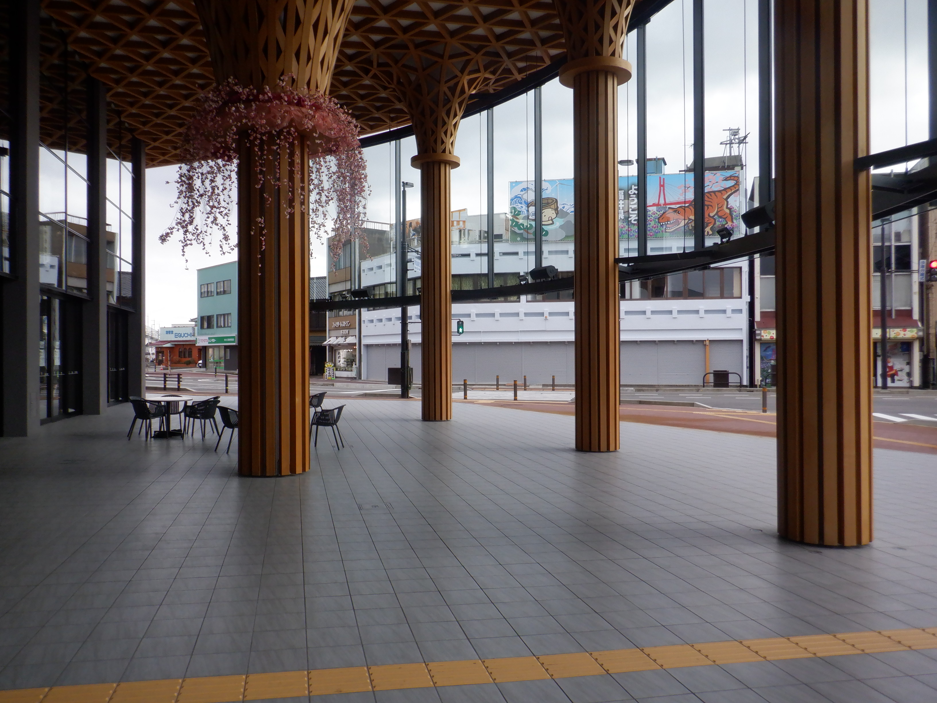 囲いがされていた駅前の飲食店だったところ。新幹線開業を前に閉店し、表を整備して誤解を与えない形になったようです。