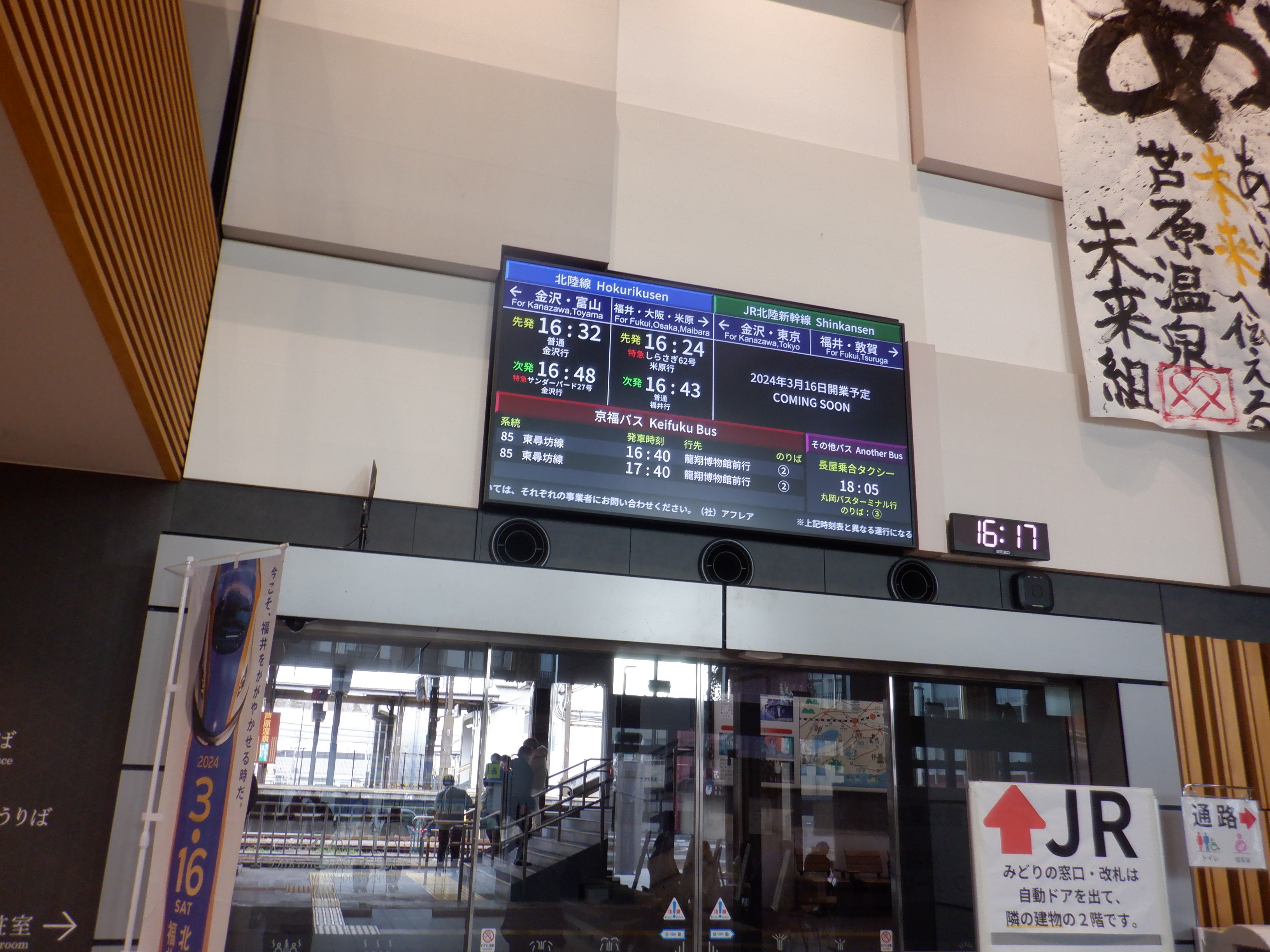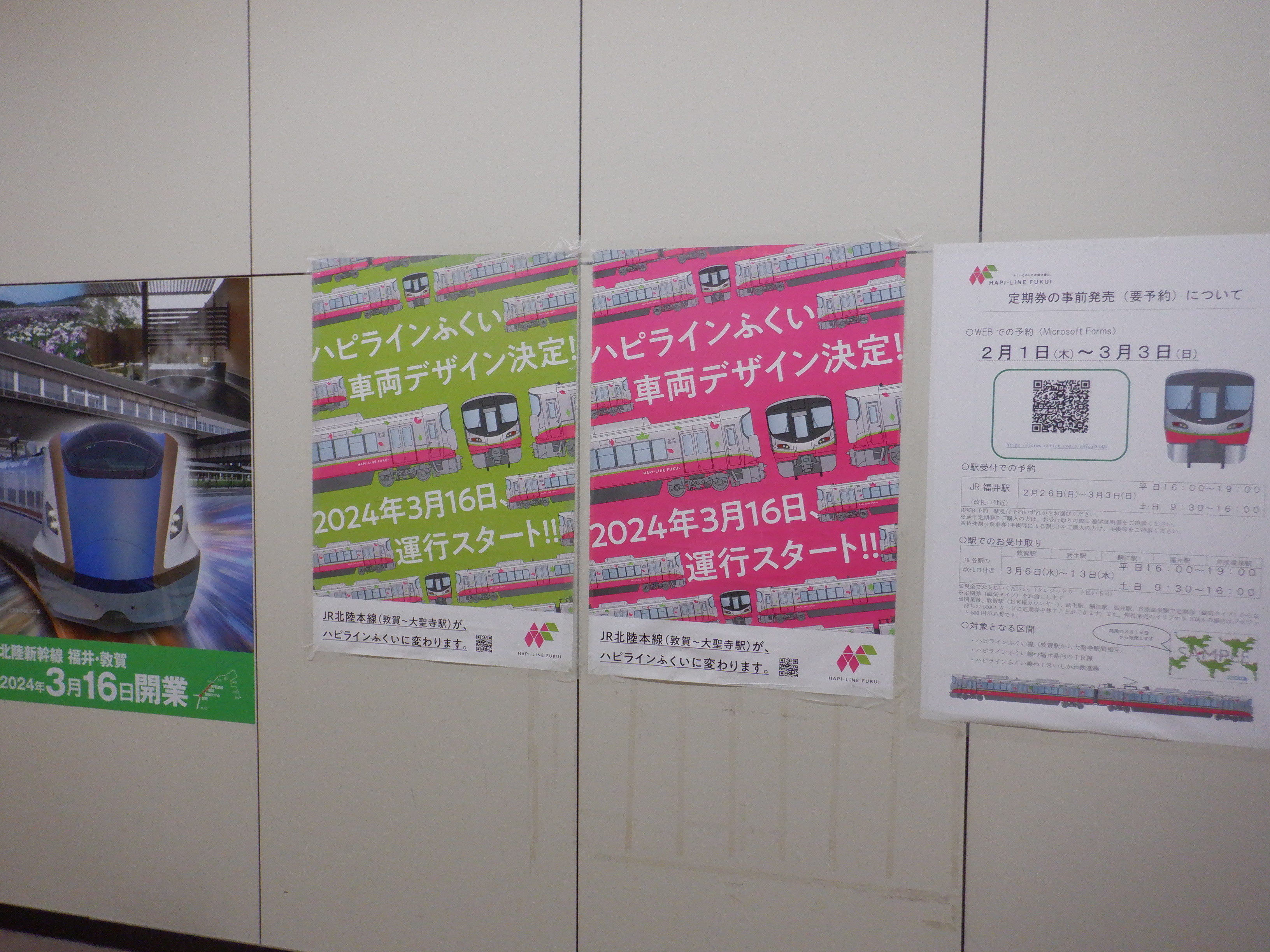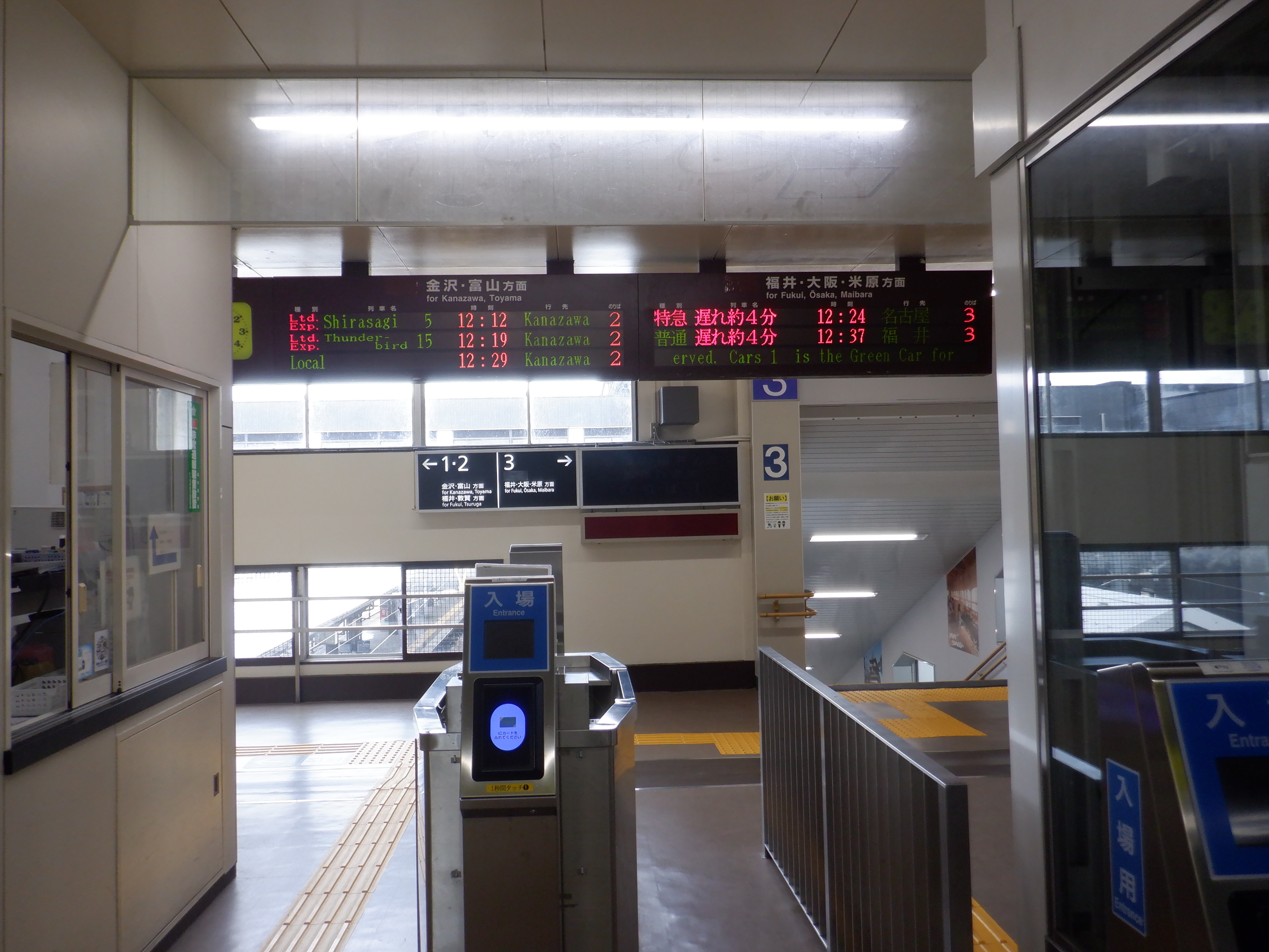 ホームや改札口の発車標の「北陸線」の表示が消されていましたが、これは前回以前もそうだったようです。その他、移管に向けた準備が進んでいます。