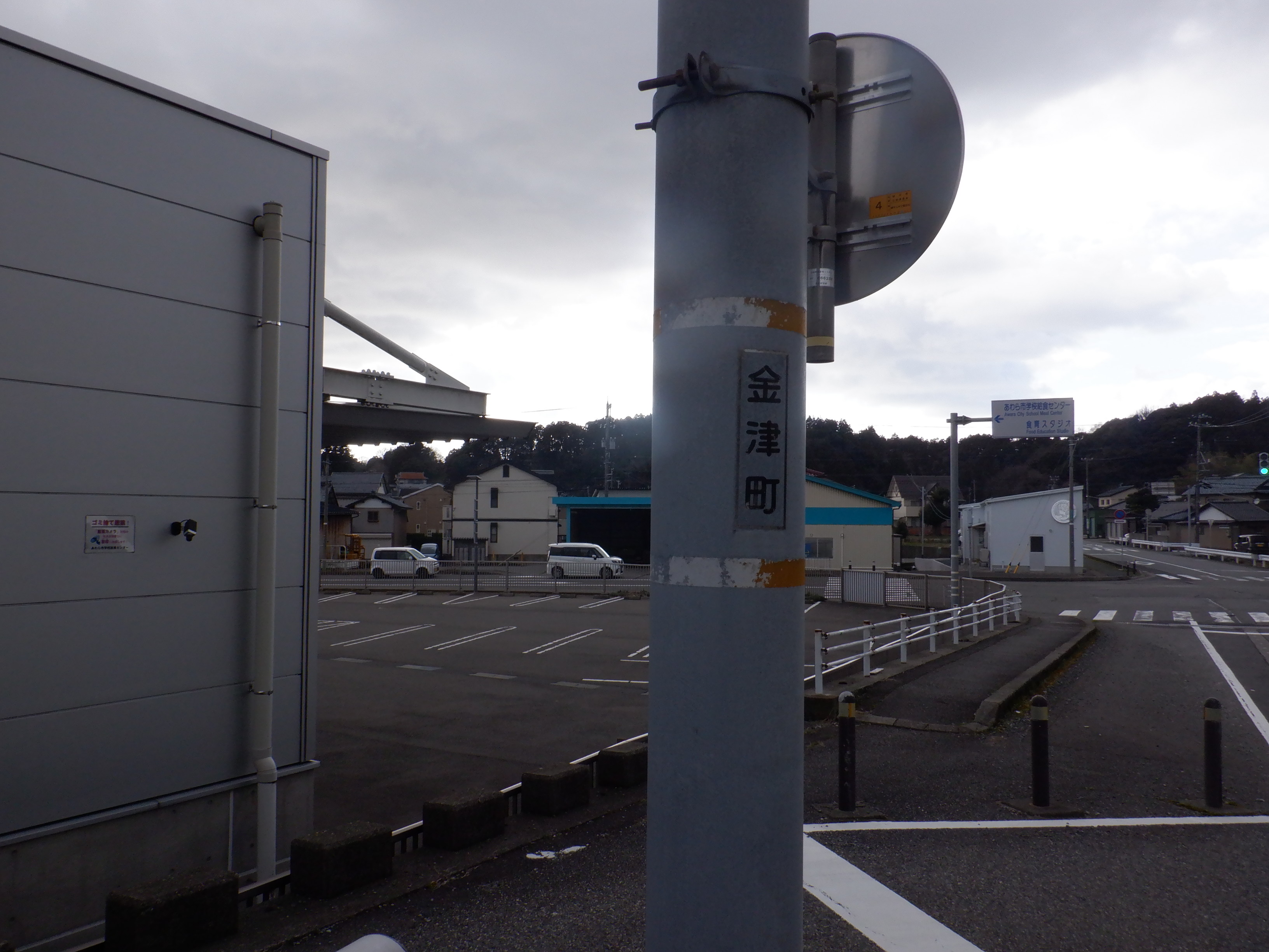 陸橋から降りてきたところにある青看板。支柱に「金津町」の表示があります。