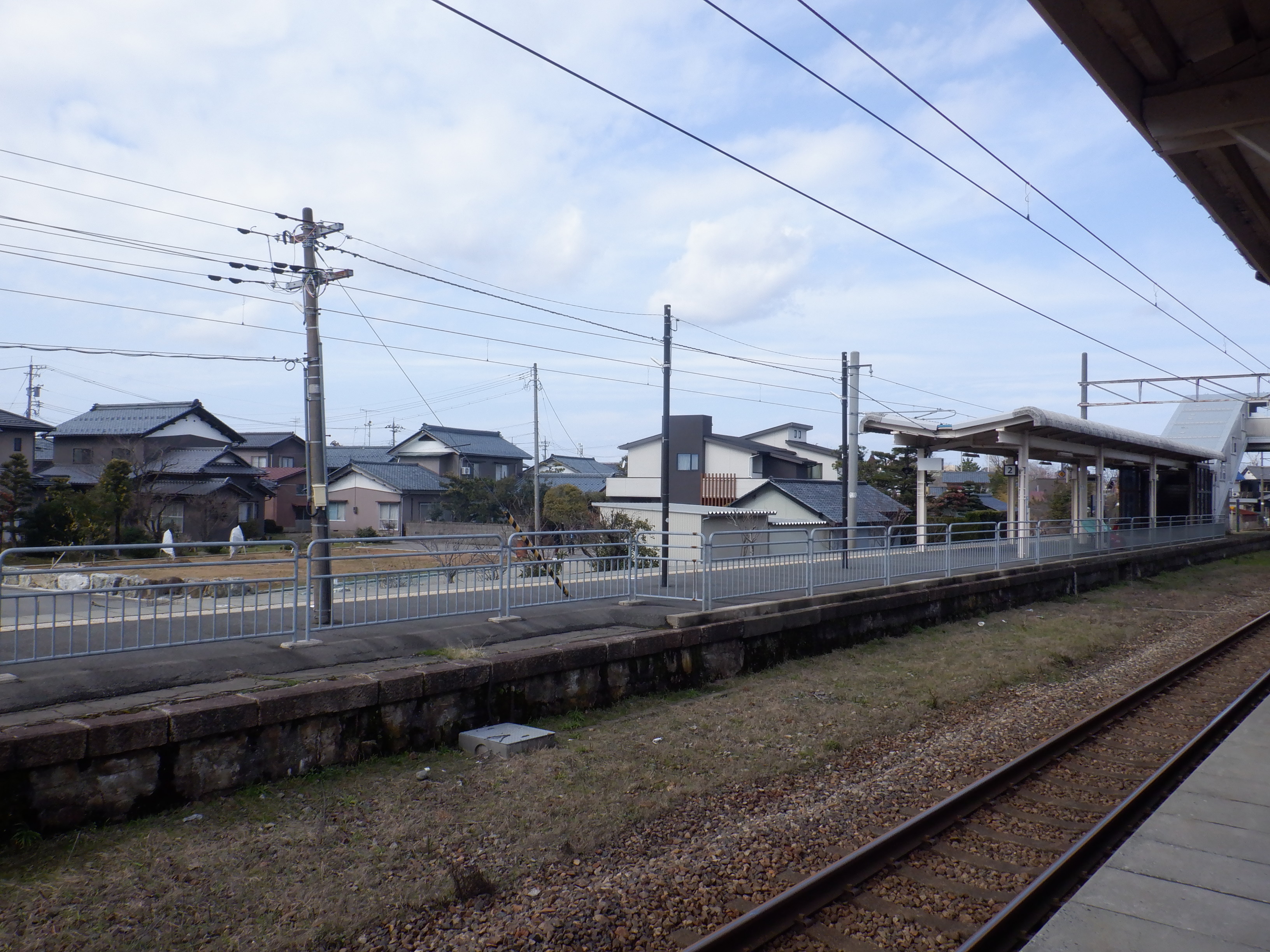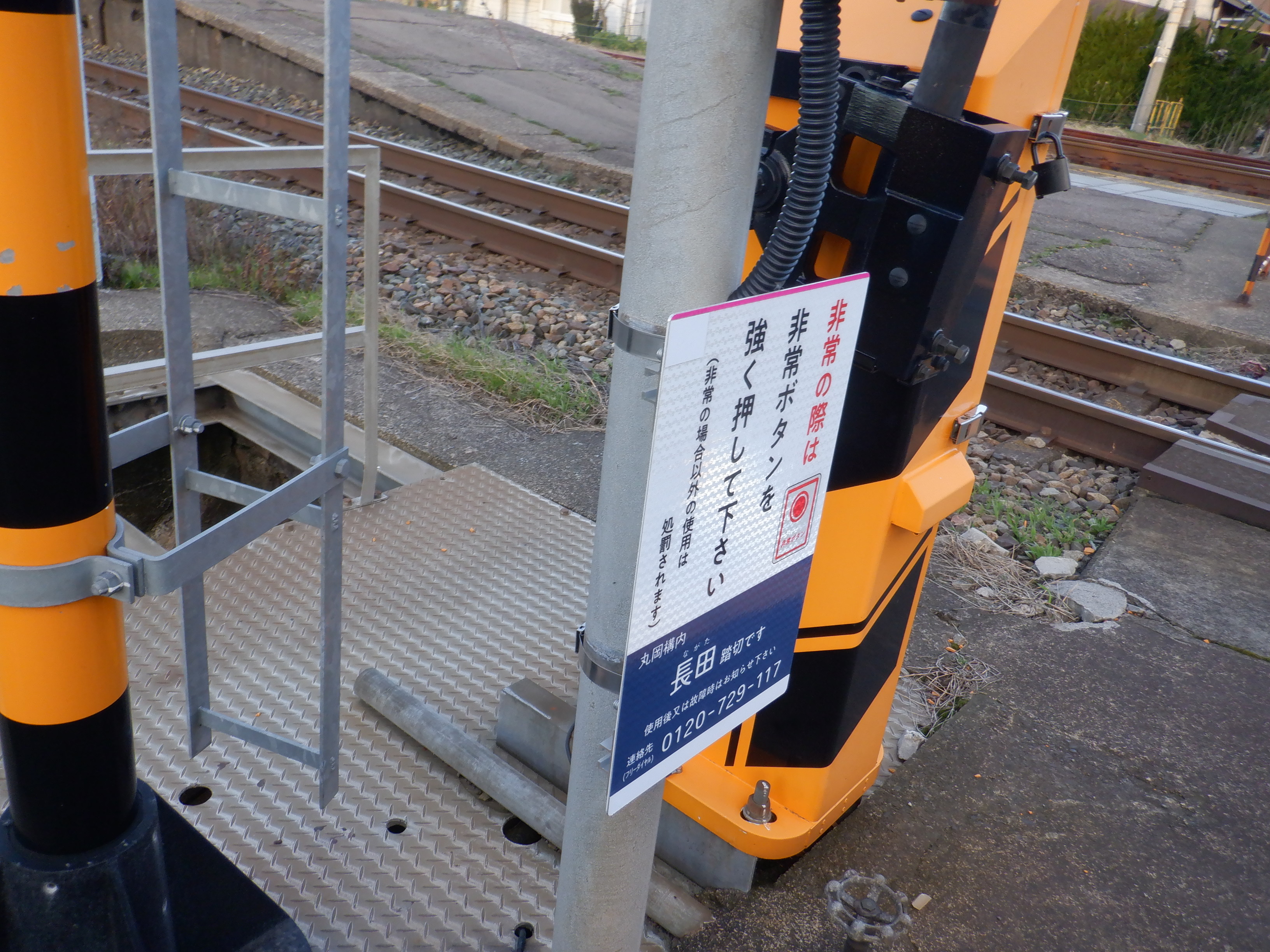 春江駅側の踏切付近。非常ボタンの案内がハピラインふくいのものになっていました。