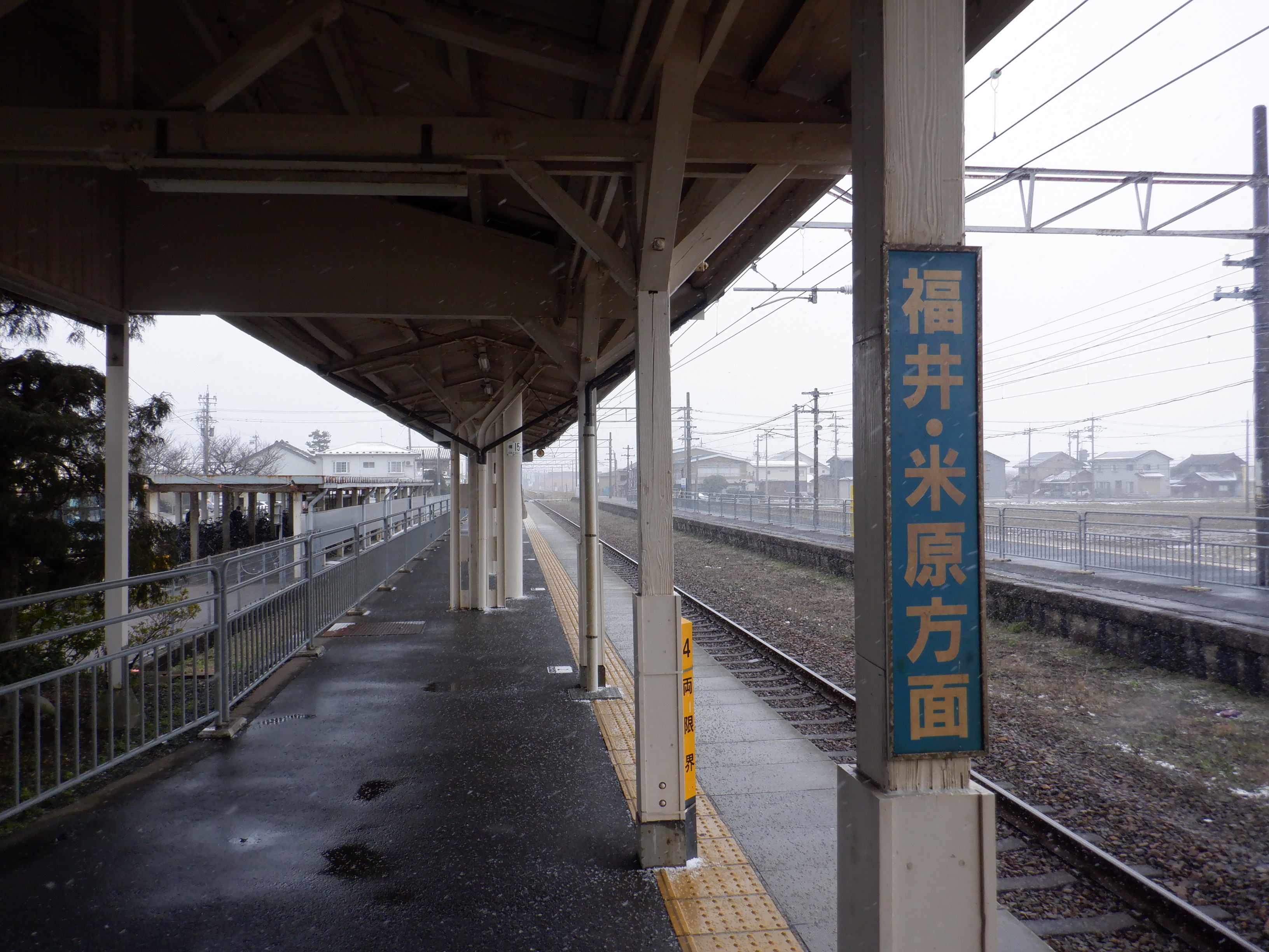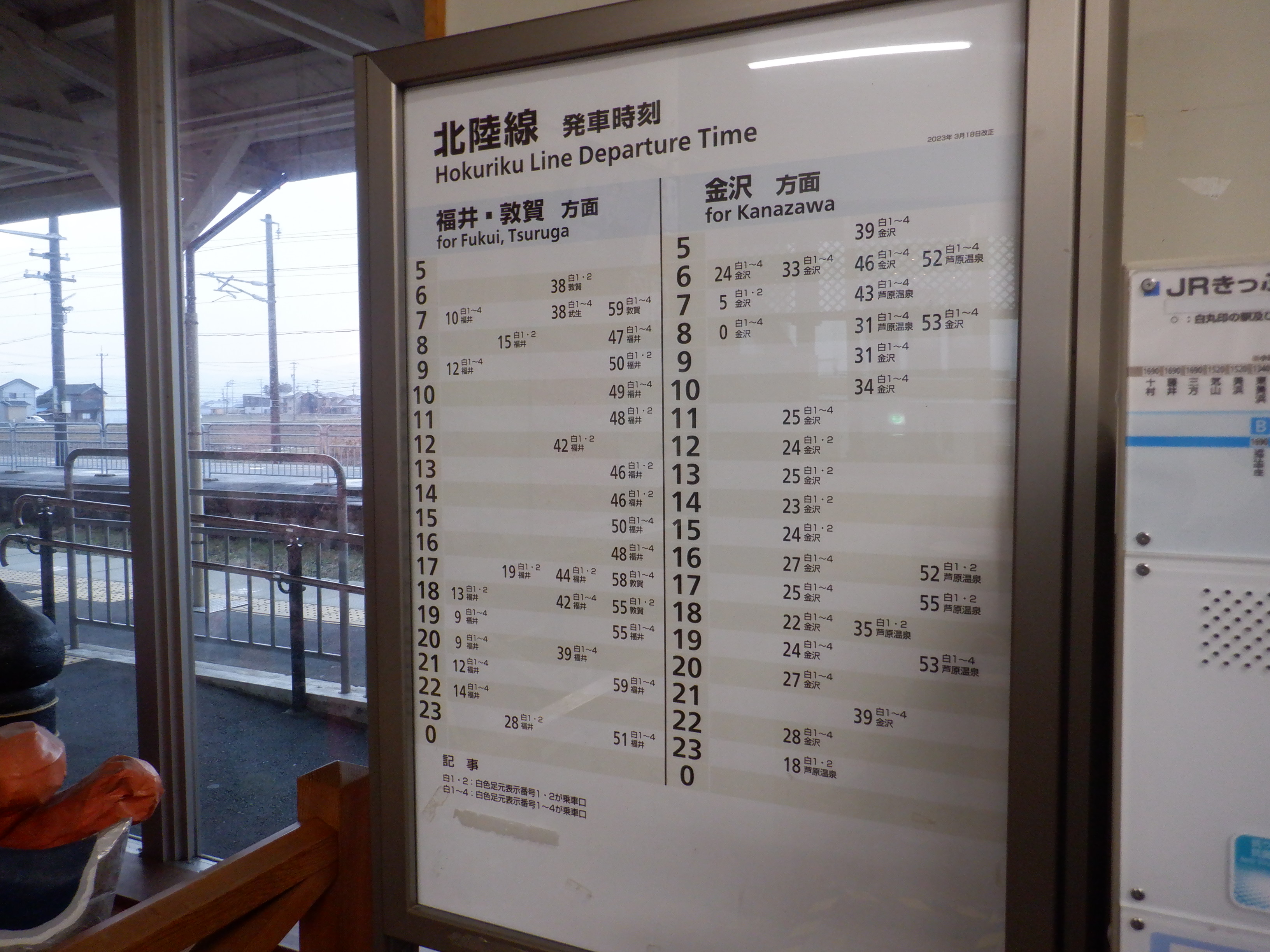 3月になりました。各駅名標ともハピラインふくいの駅名標か白い板の上にシールでJRの駅名標が貼られています。第一種駅名標のJRロゴはこの時点でも残っていました。