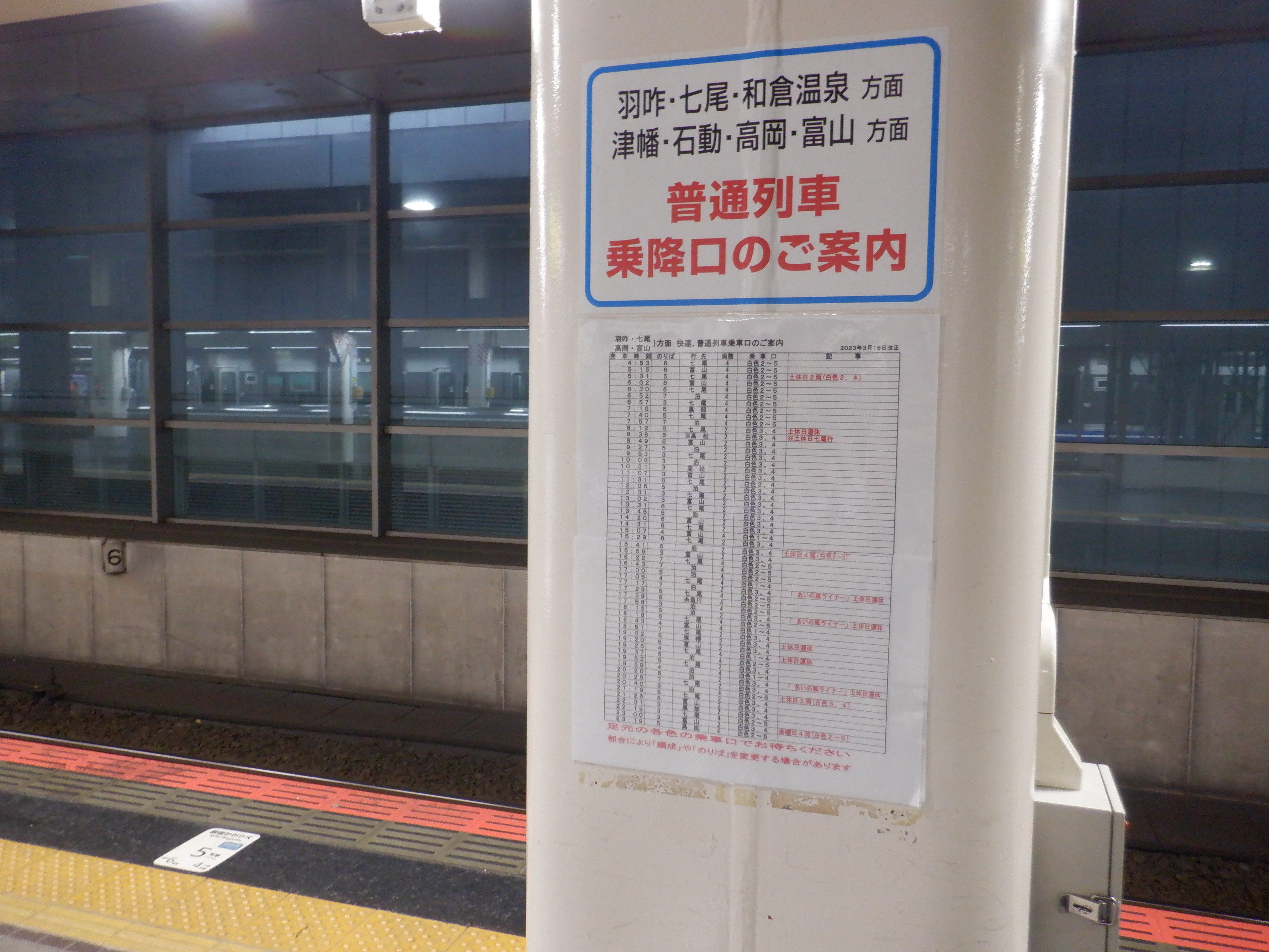 6番のりば西金沢駅側の普通列車乗車位置案内。