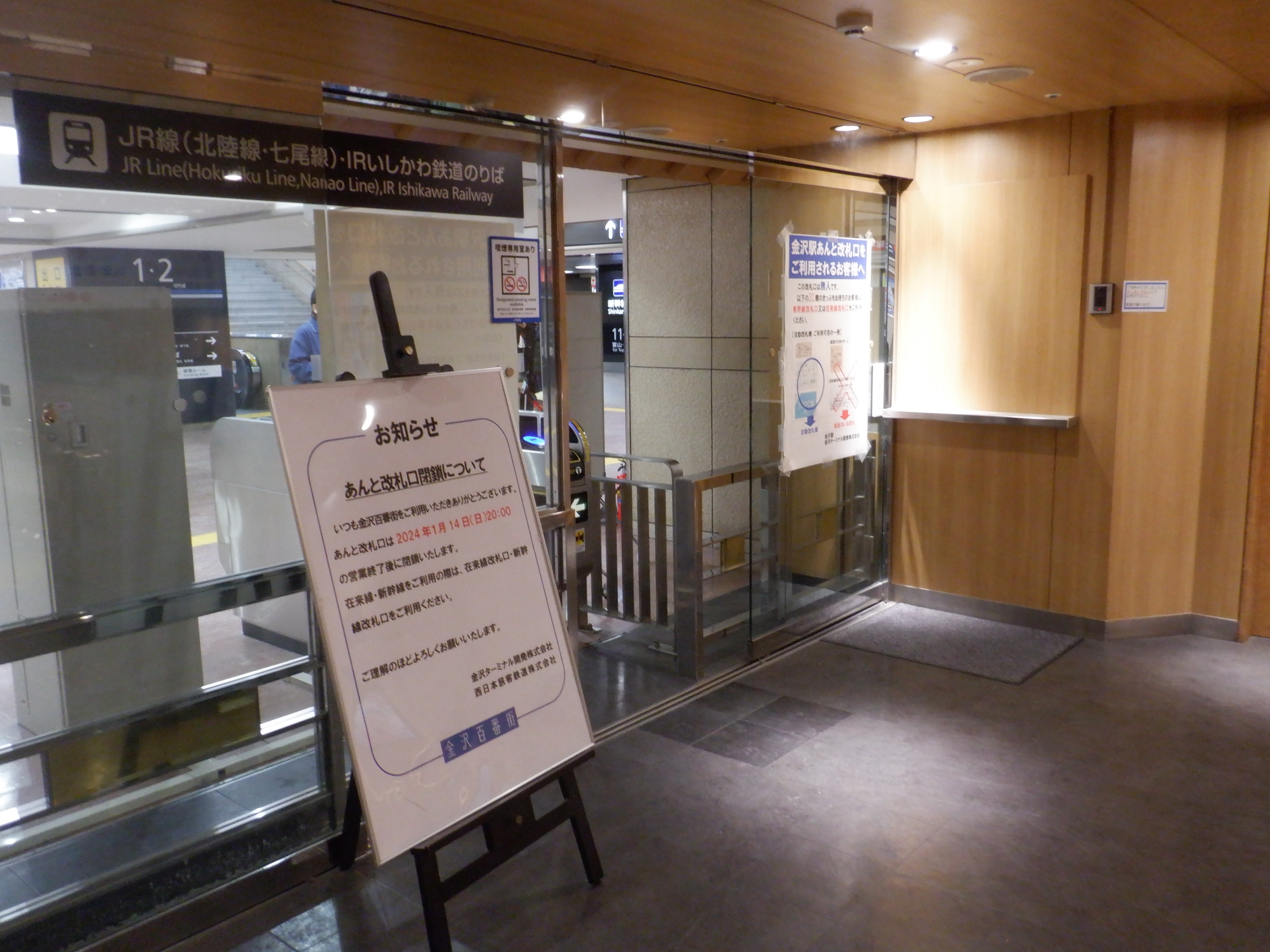 改札内から見たあんと改札口と閉鎖のお知らせ。