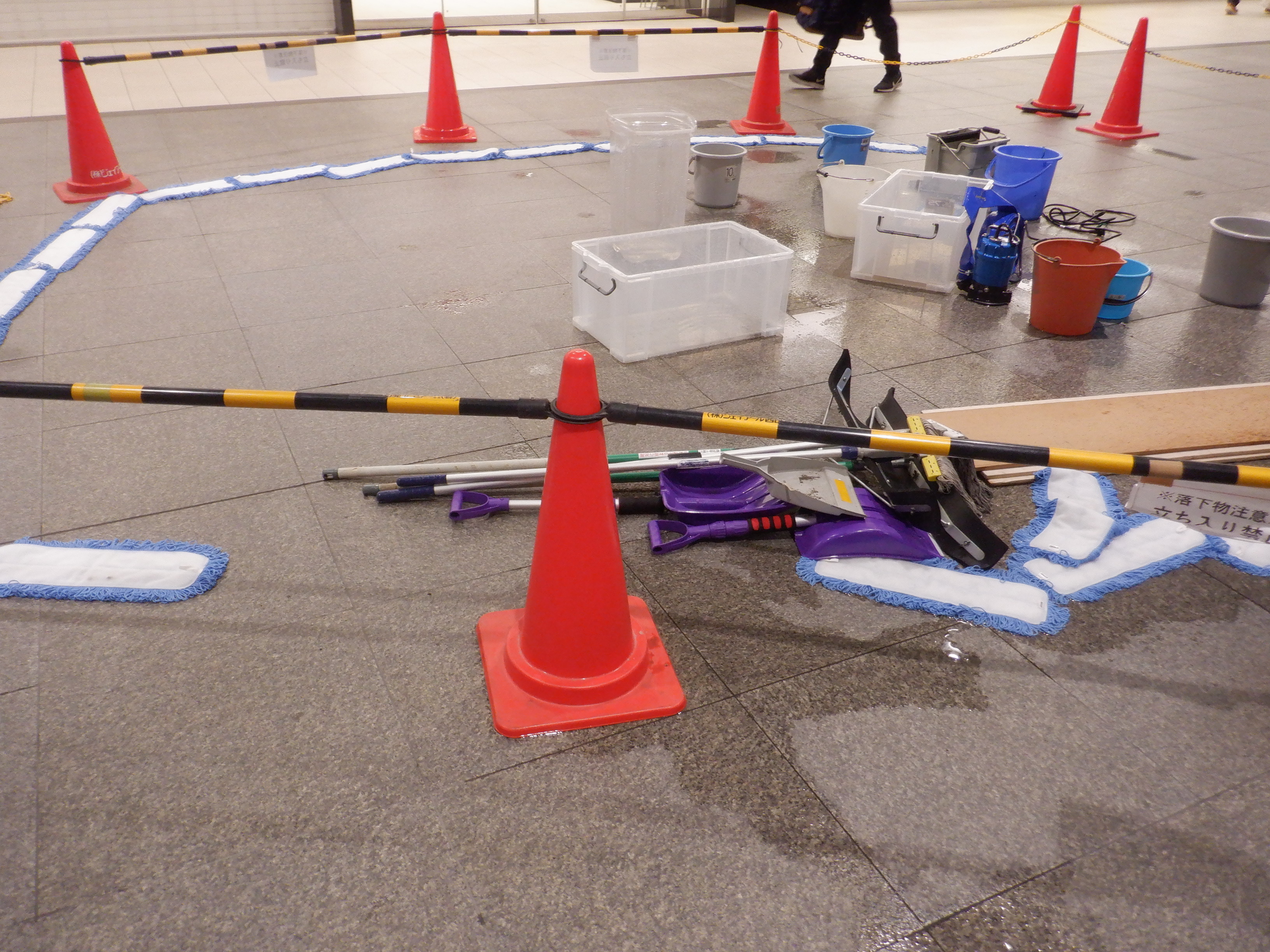 地震の影響で天井から水漏れがしているコンコース。