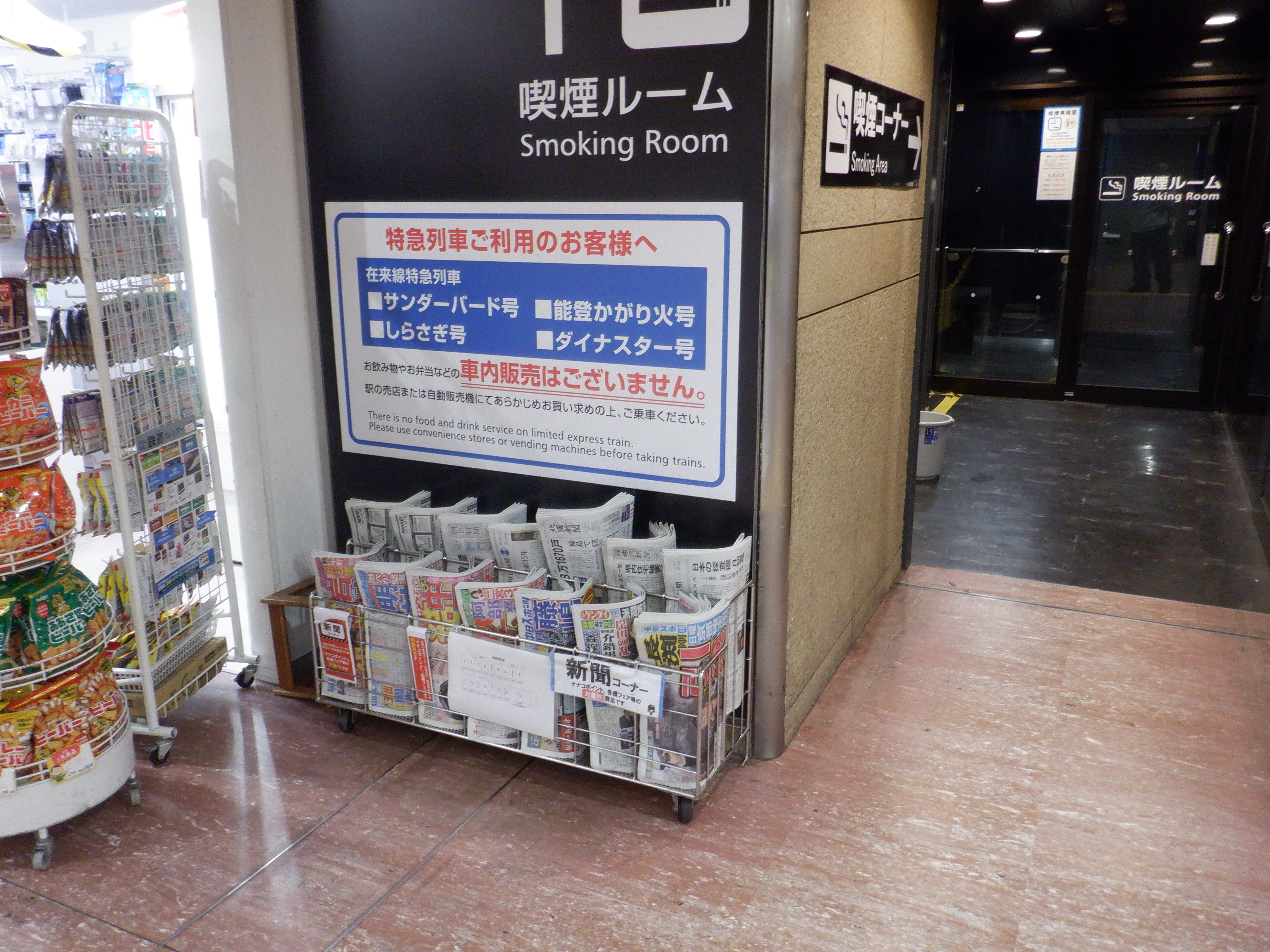 中二階のセブンイレブンのところにある、特急列車には車内販売がない旨の案内。