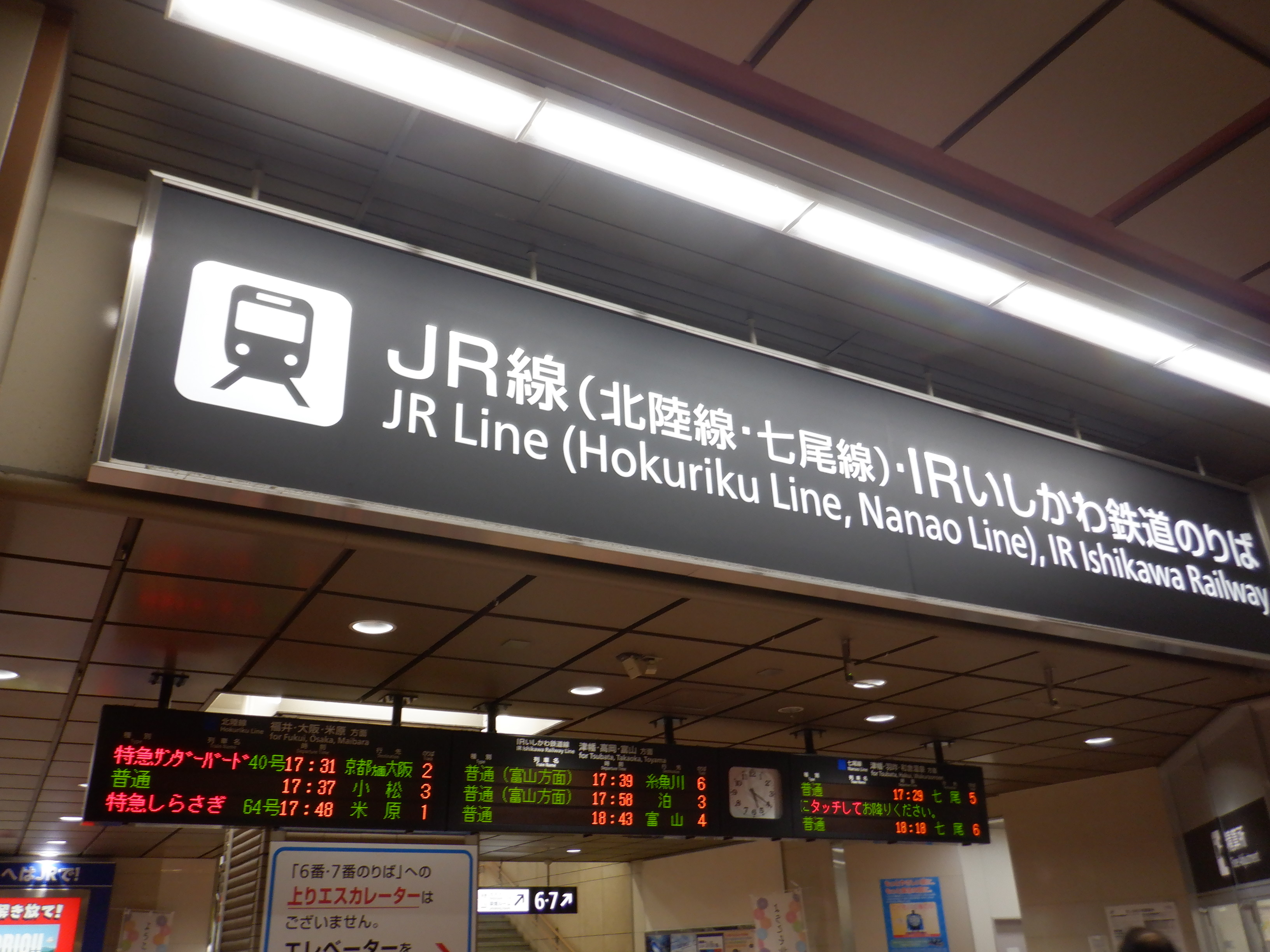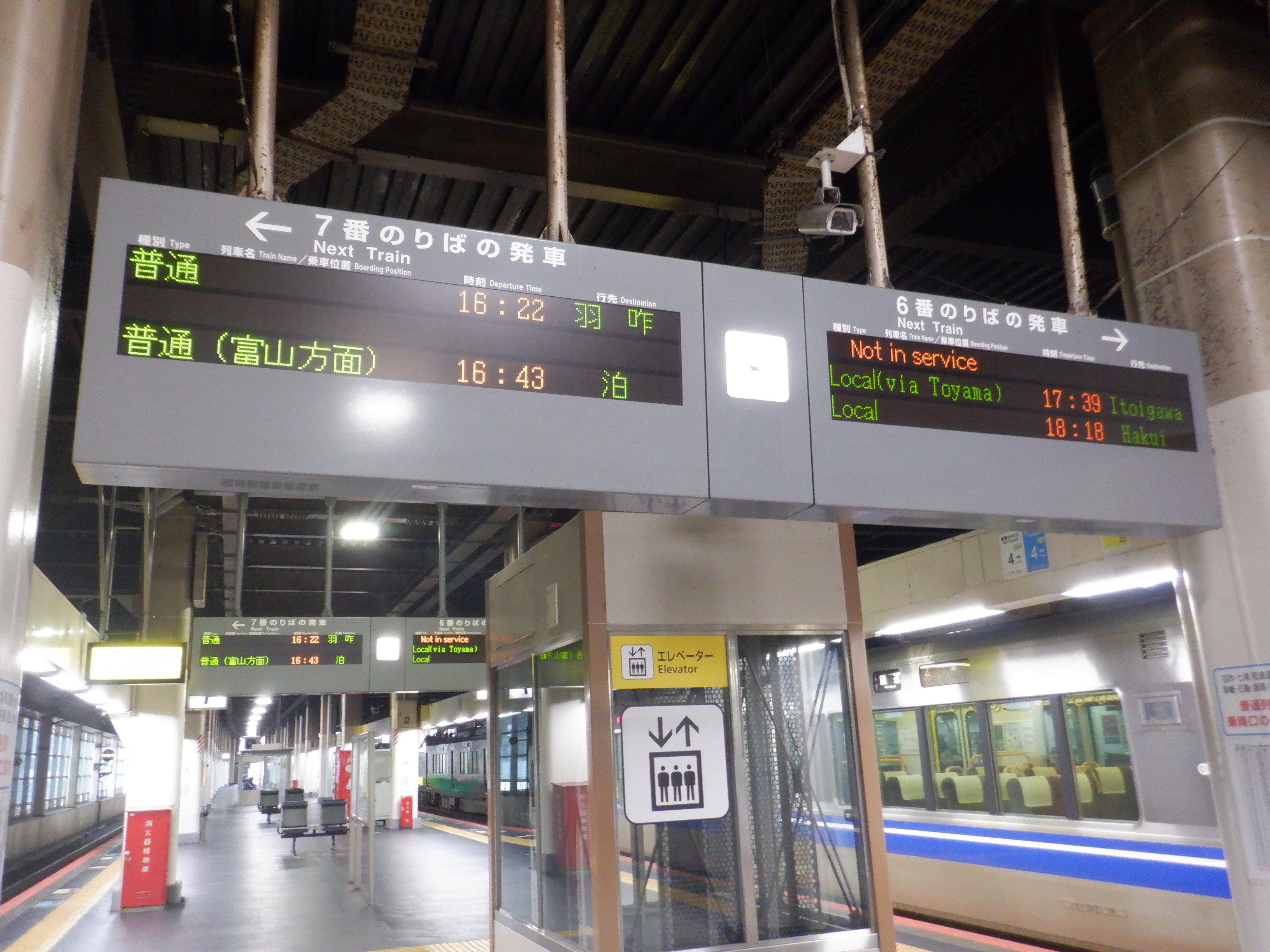 6・7番のりばの発車標。1月3日より七尾線は一旦高松まで復旧しました。