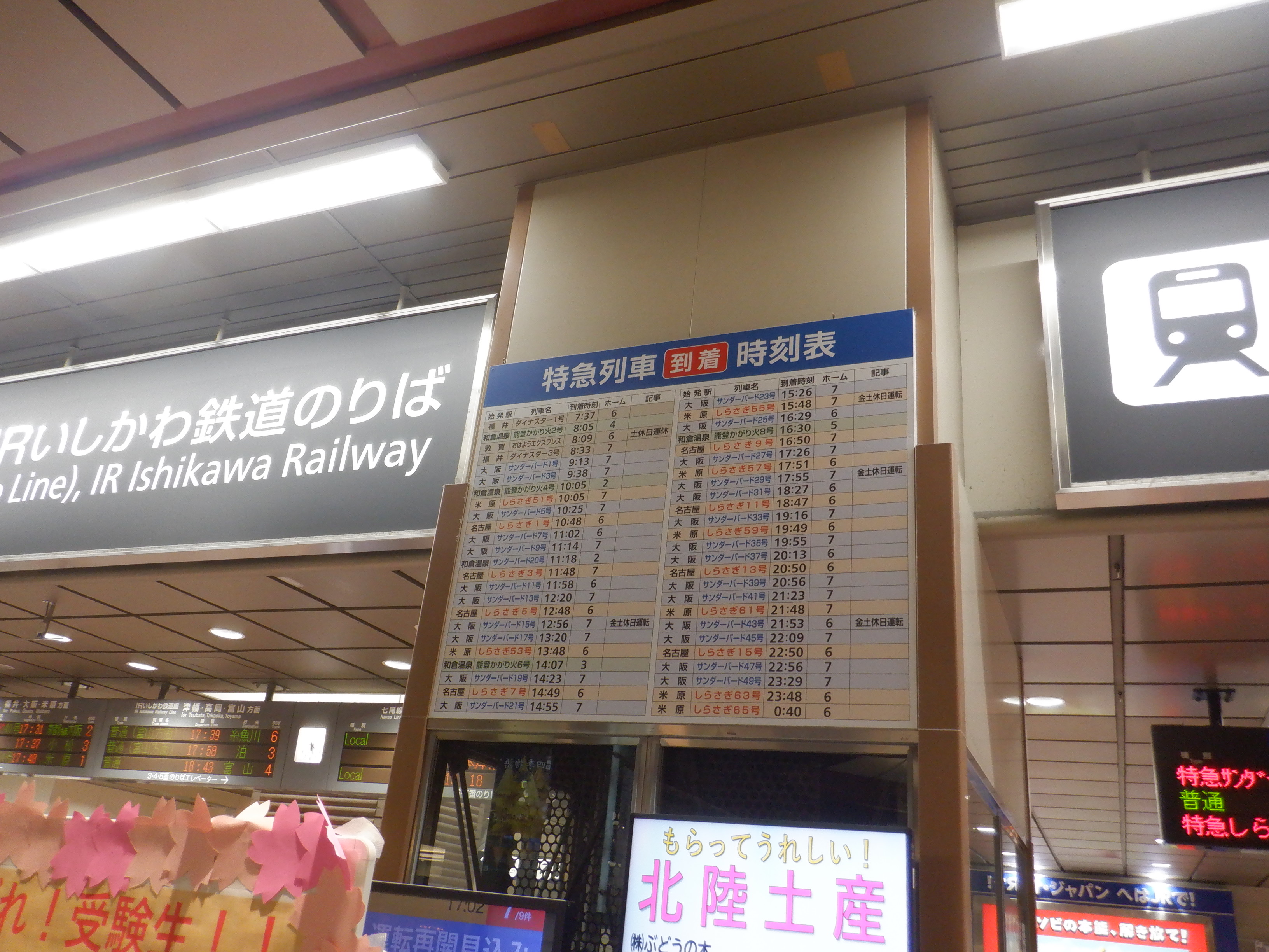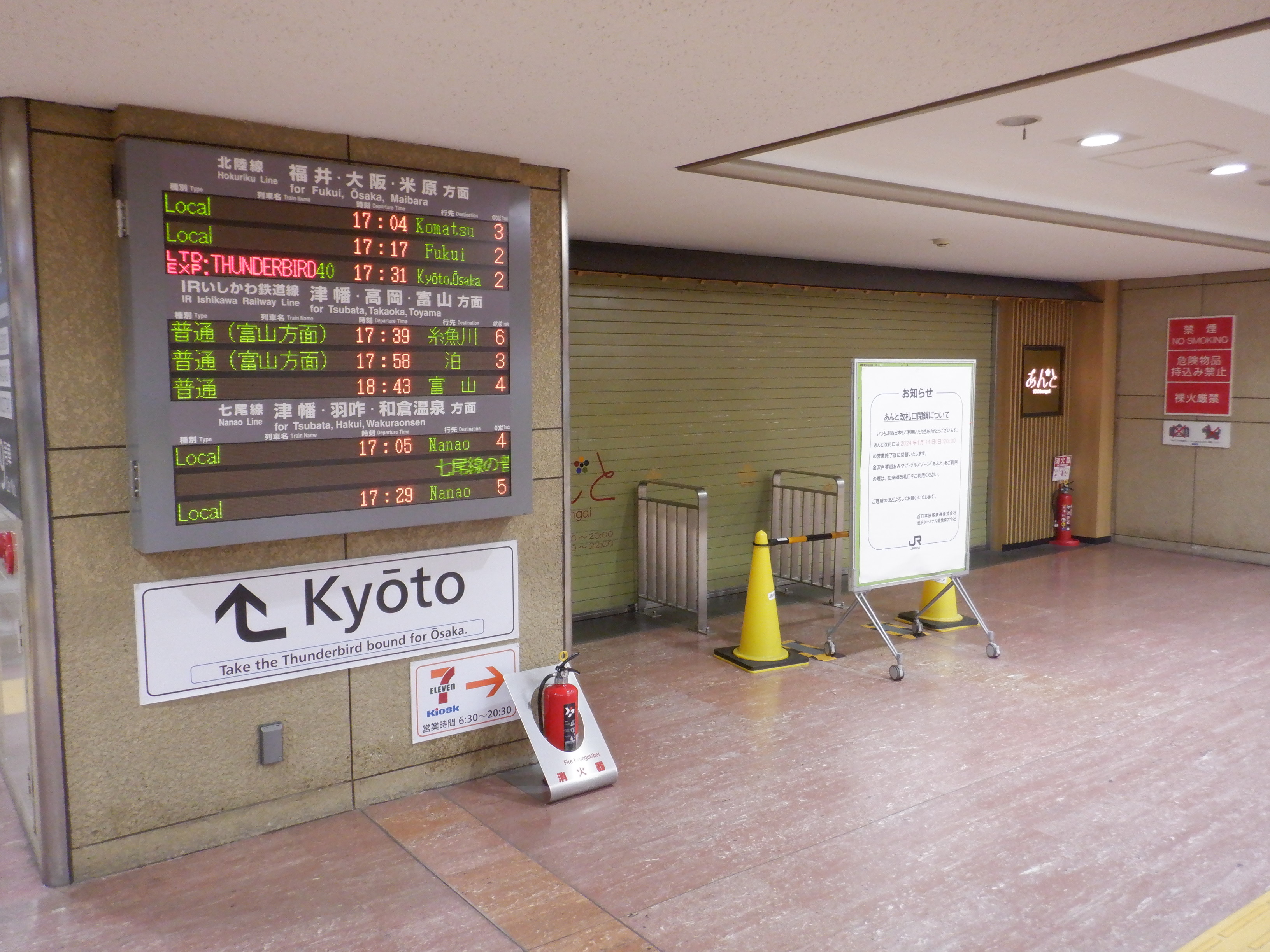 7番のりばのサンダーバード17号和倉温泉行きの案内も撤去されていました。