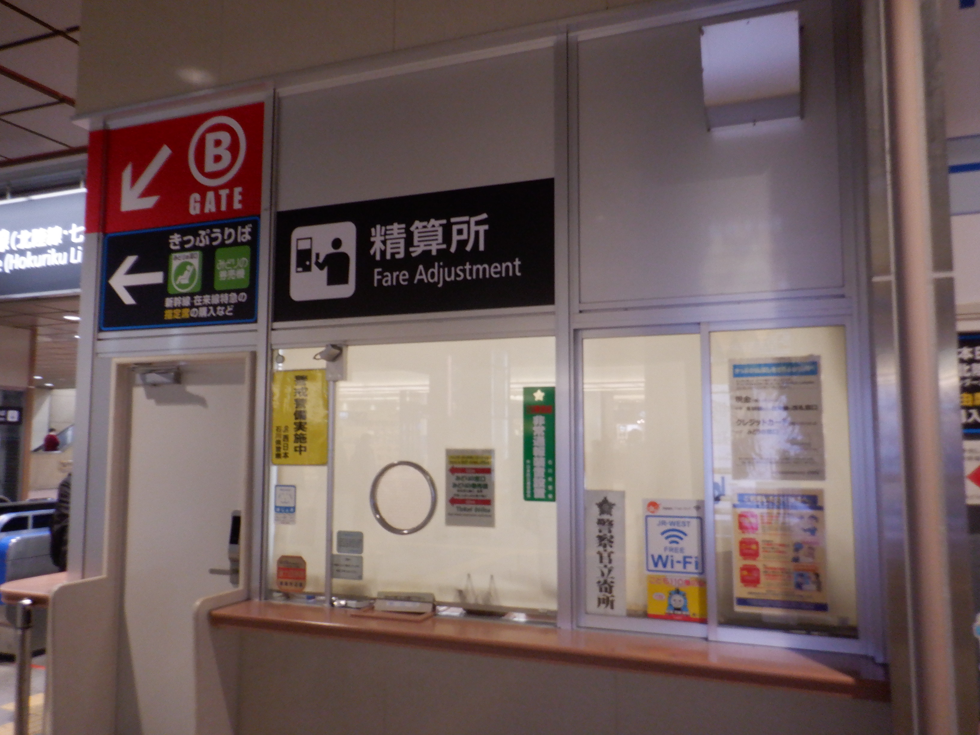 在来線側の改札口案内と有人改札・精算所。