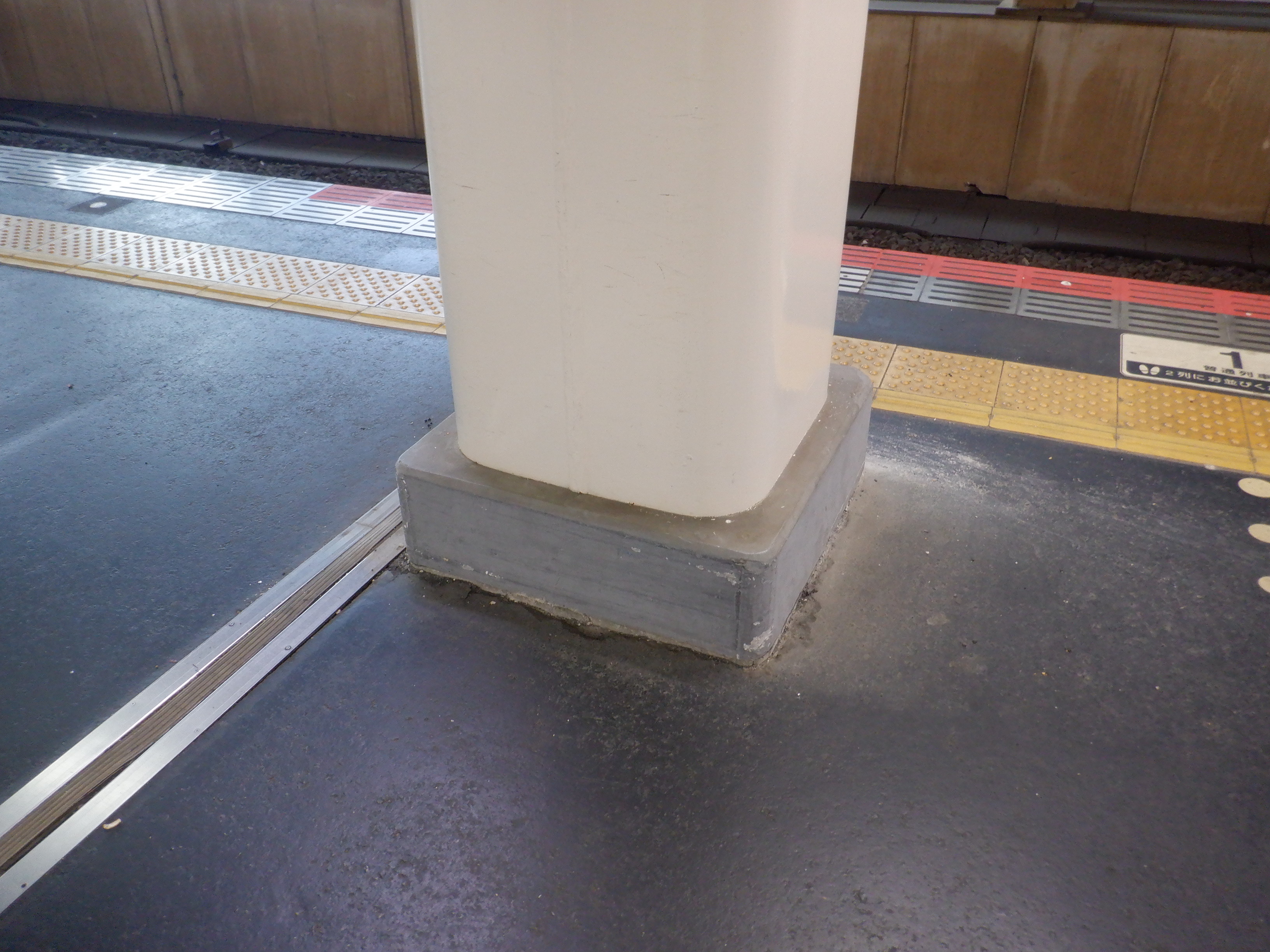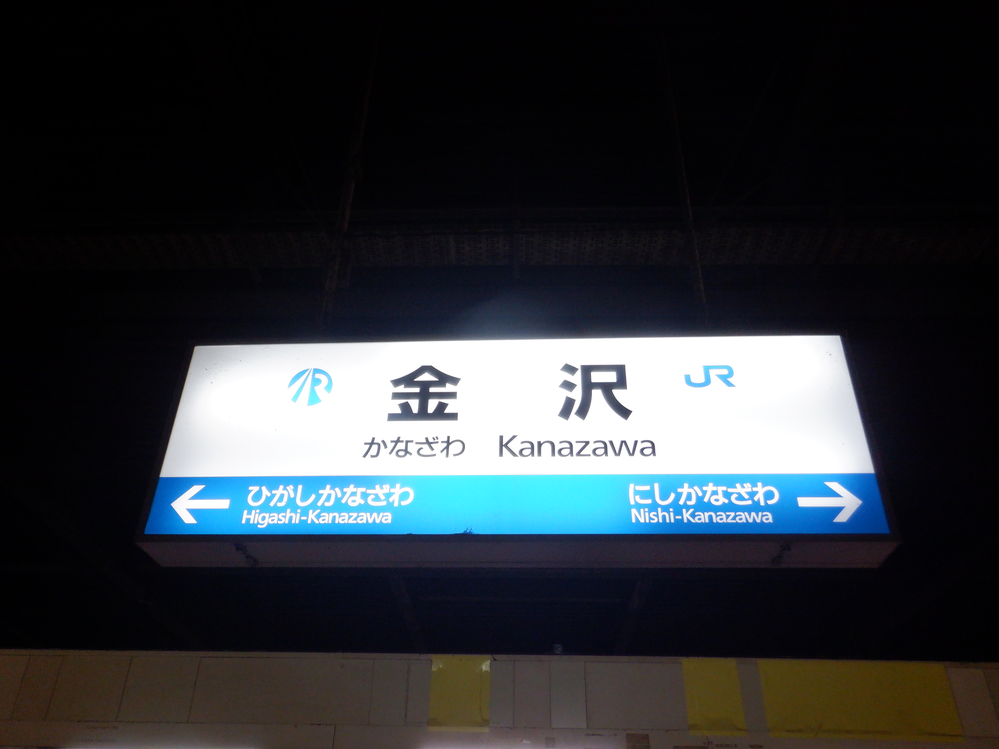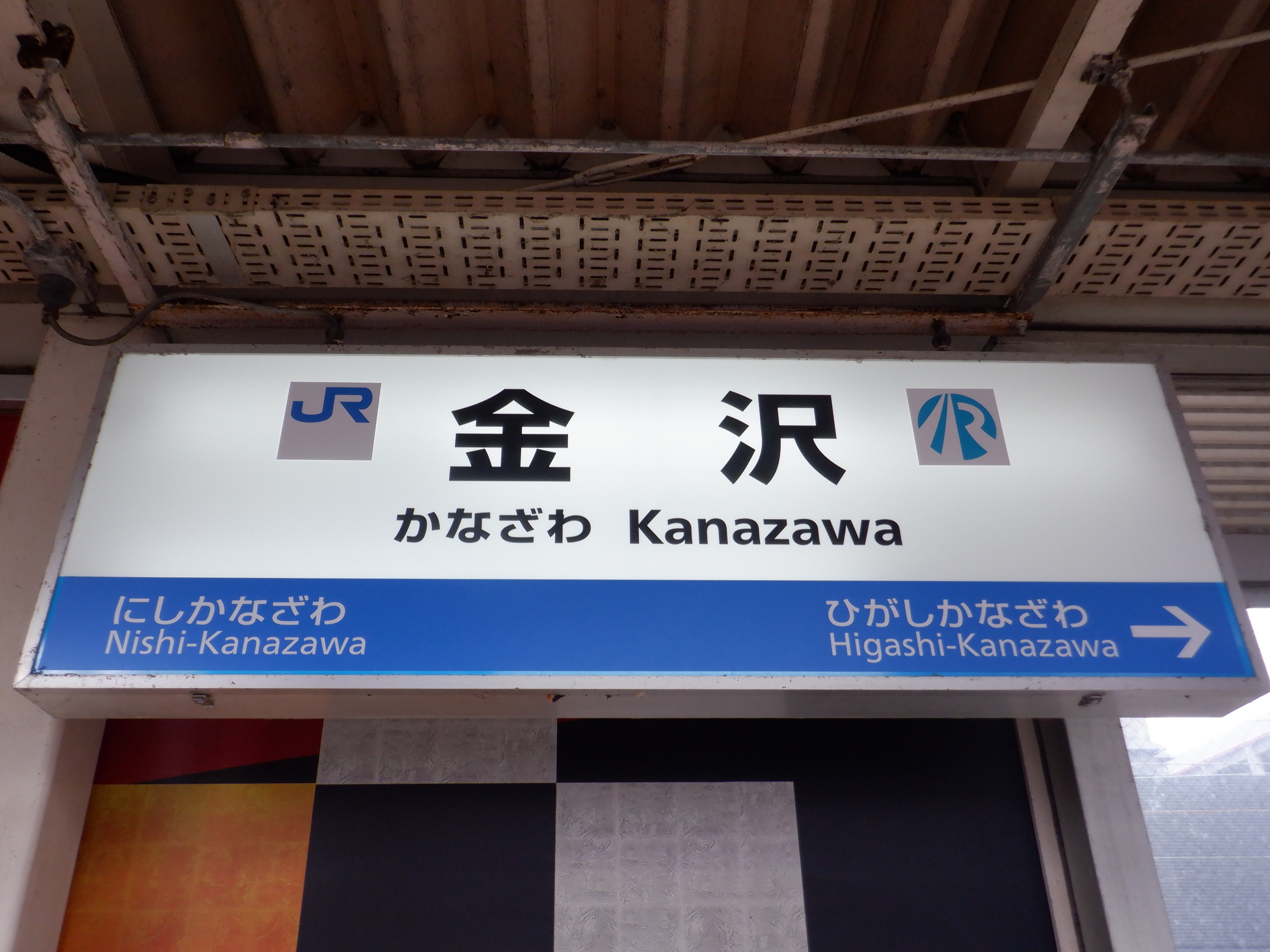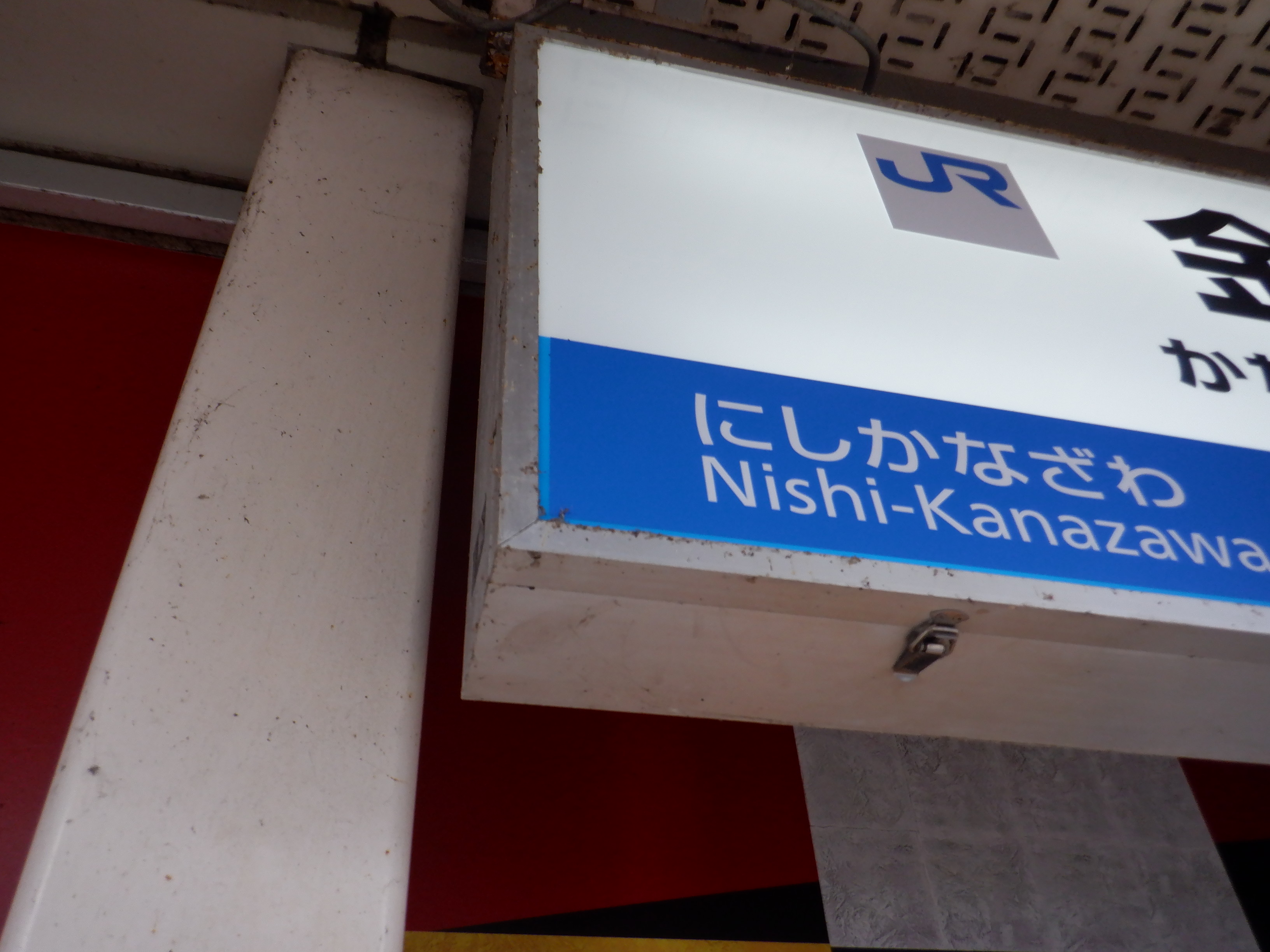 明るいところで分かりやすくご紹介するために、4番のりばの駅名標。両社のロゴ、そして隣駅表示のところにはJRの色で貼られた状態になっています。