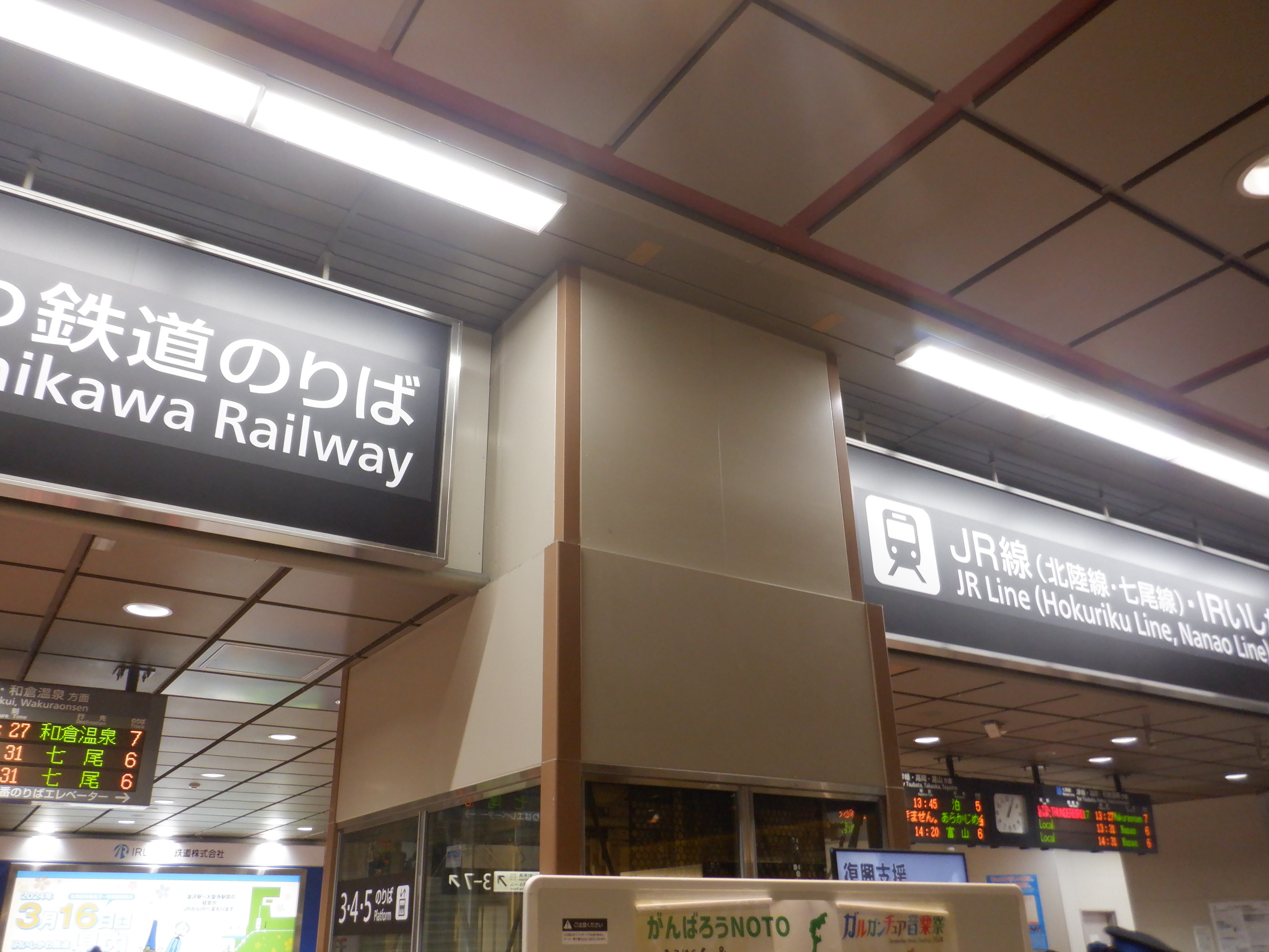 金沢駅の2024年移管前の様子です。この期間はあんと改札口が閉鎖されて、両側とも隠されてしまう流れが主になりました。また、移管が近くなると駅名標等も変化していきます。能登半島地震からの復旧の様子もこの駅から伺い知ることができました。