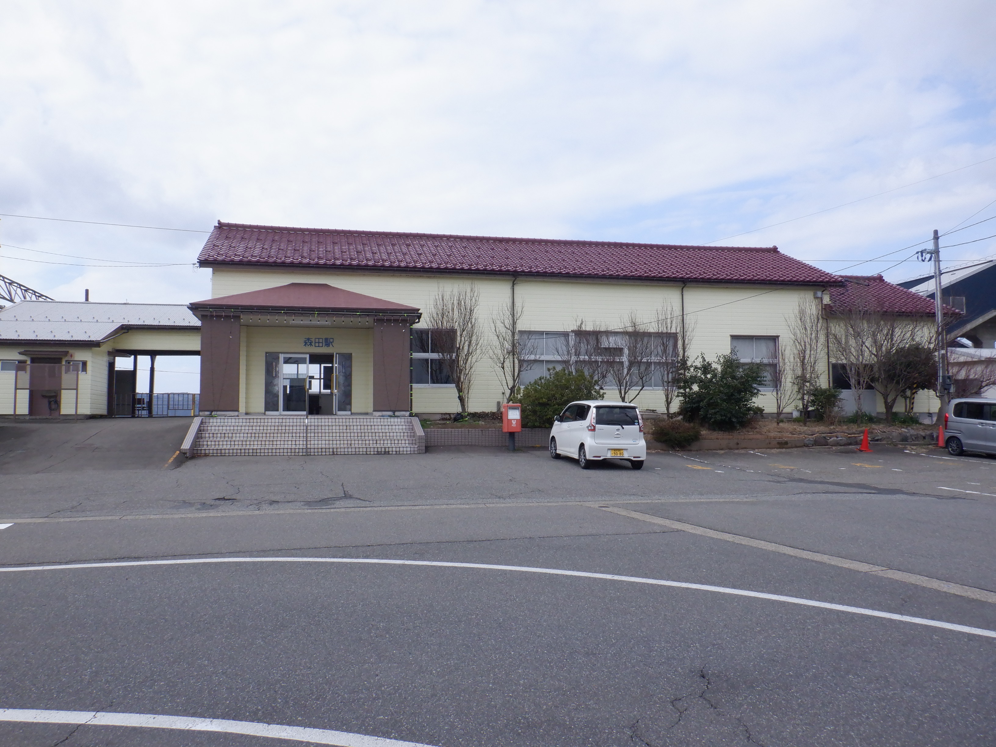 駅舎入口とポスト。