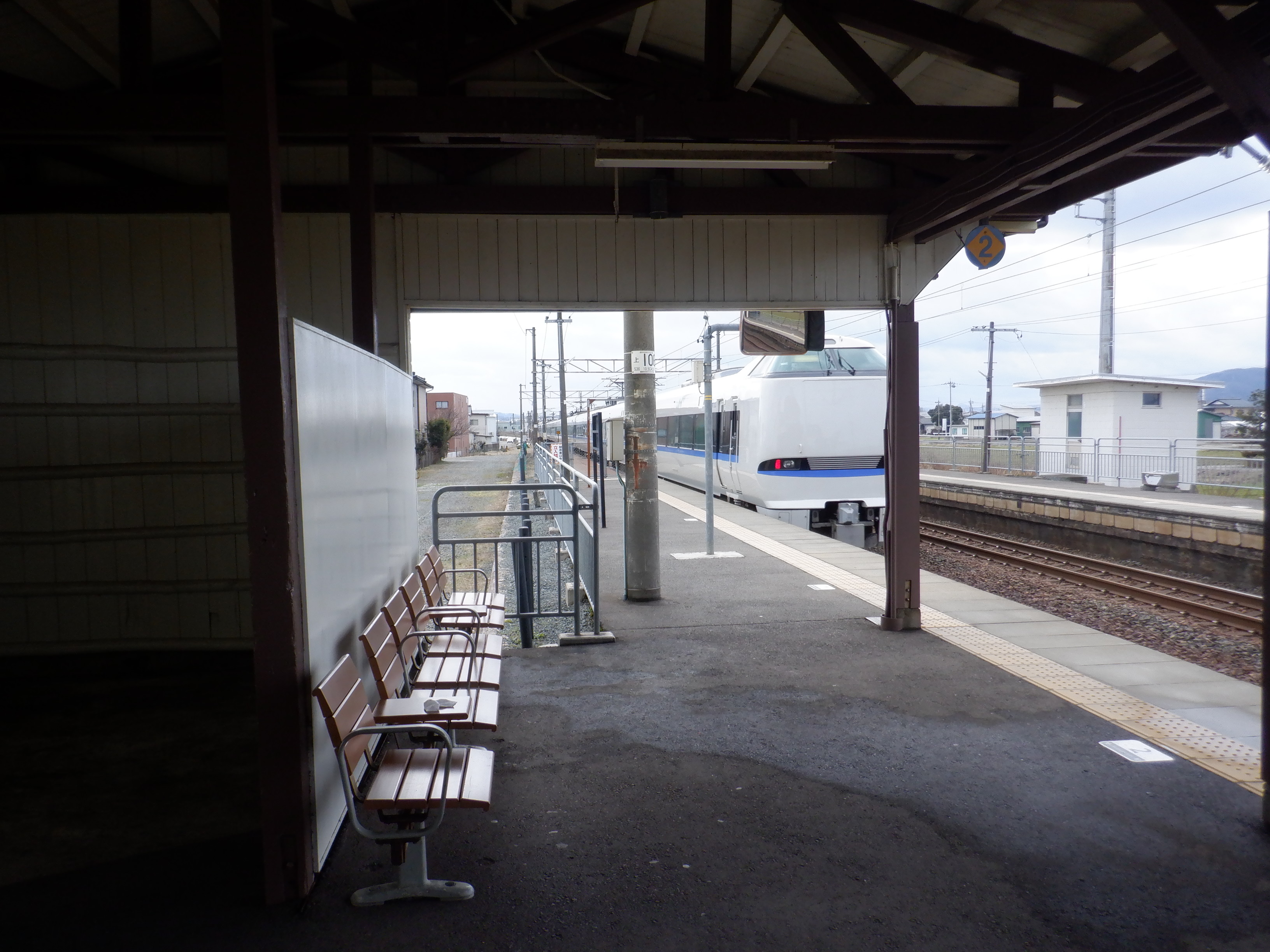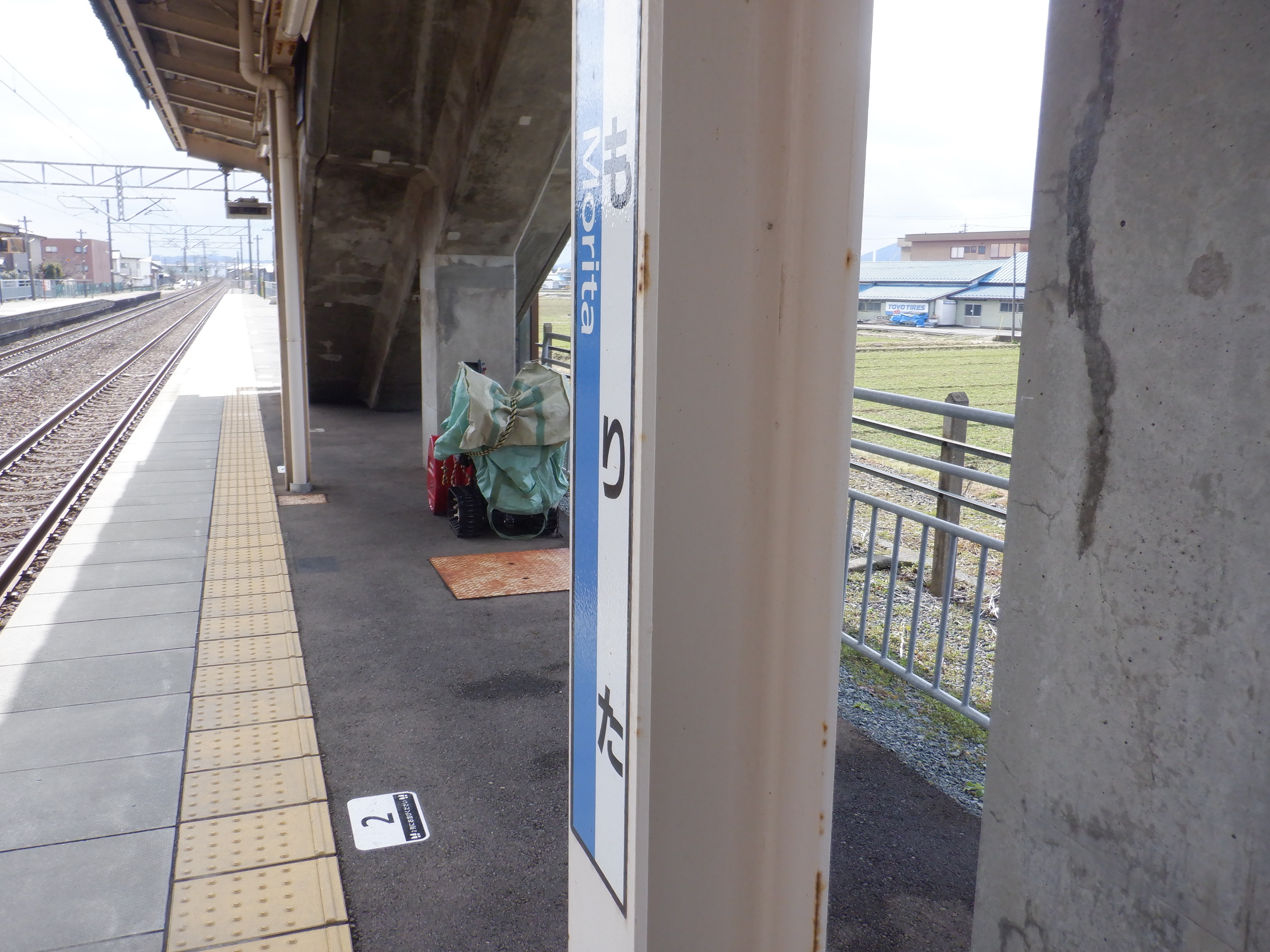 ホームの春江駅側から見た駅舎と反対側の様子。